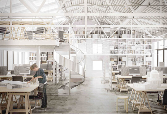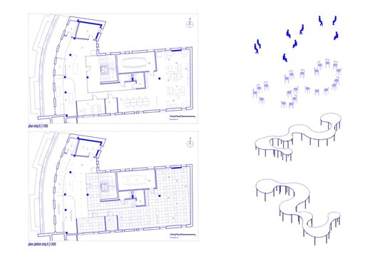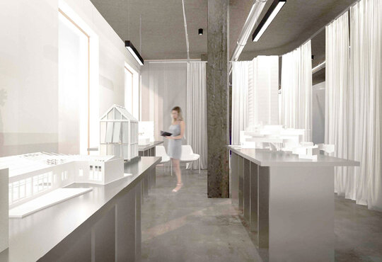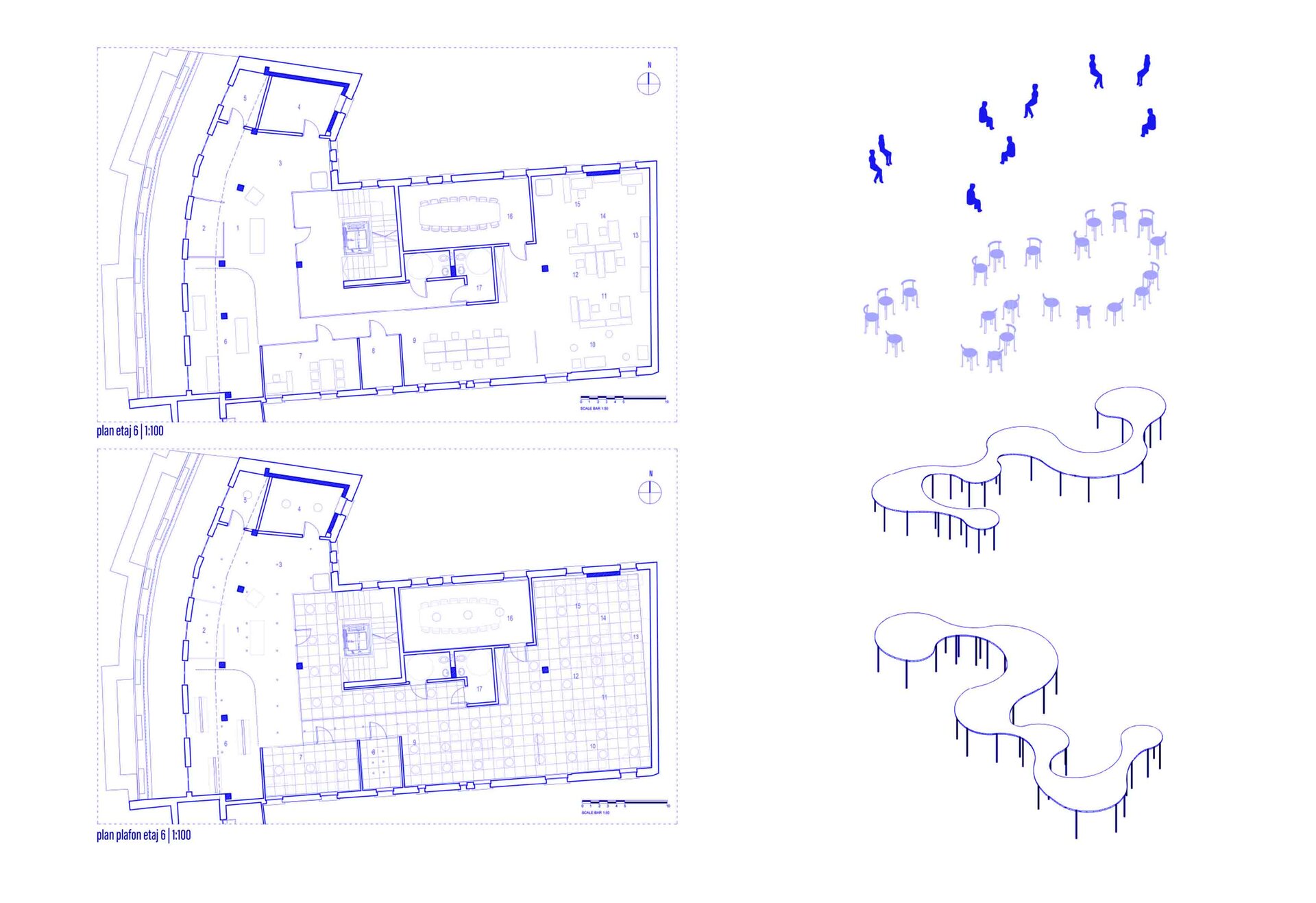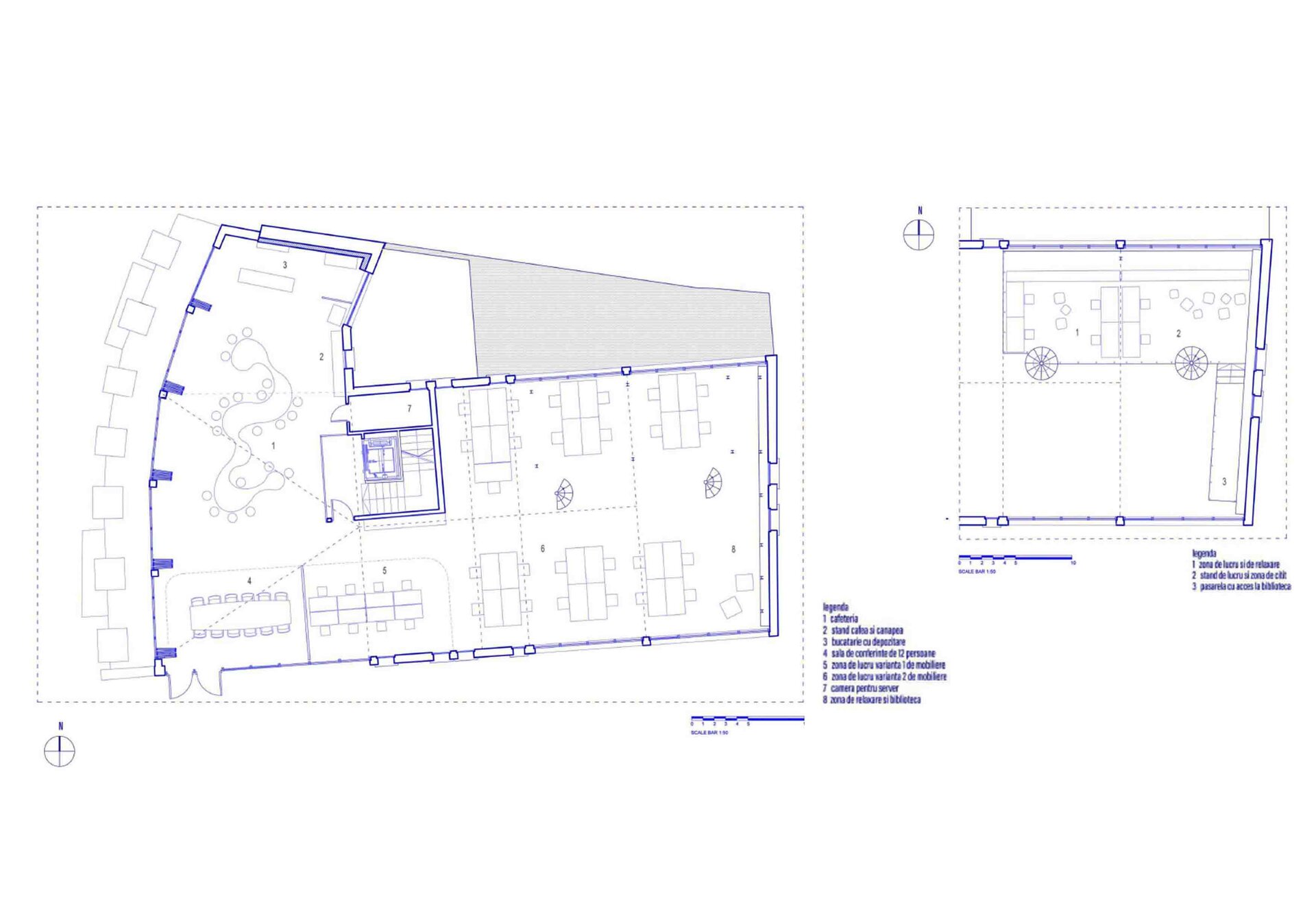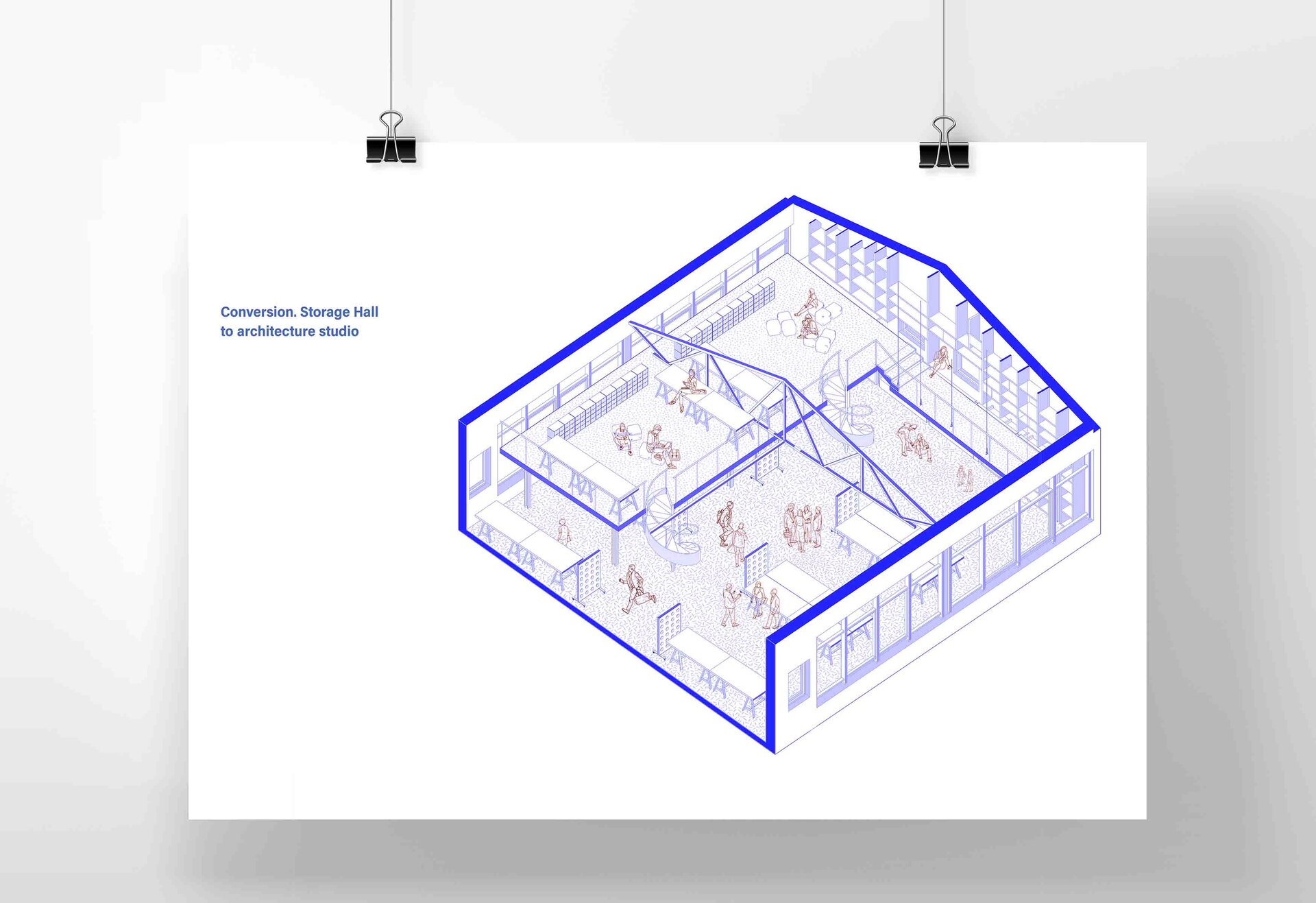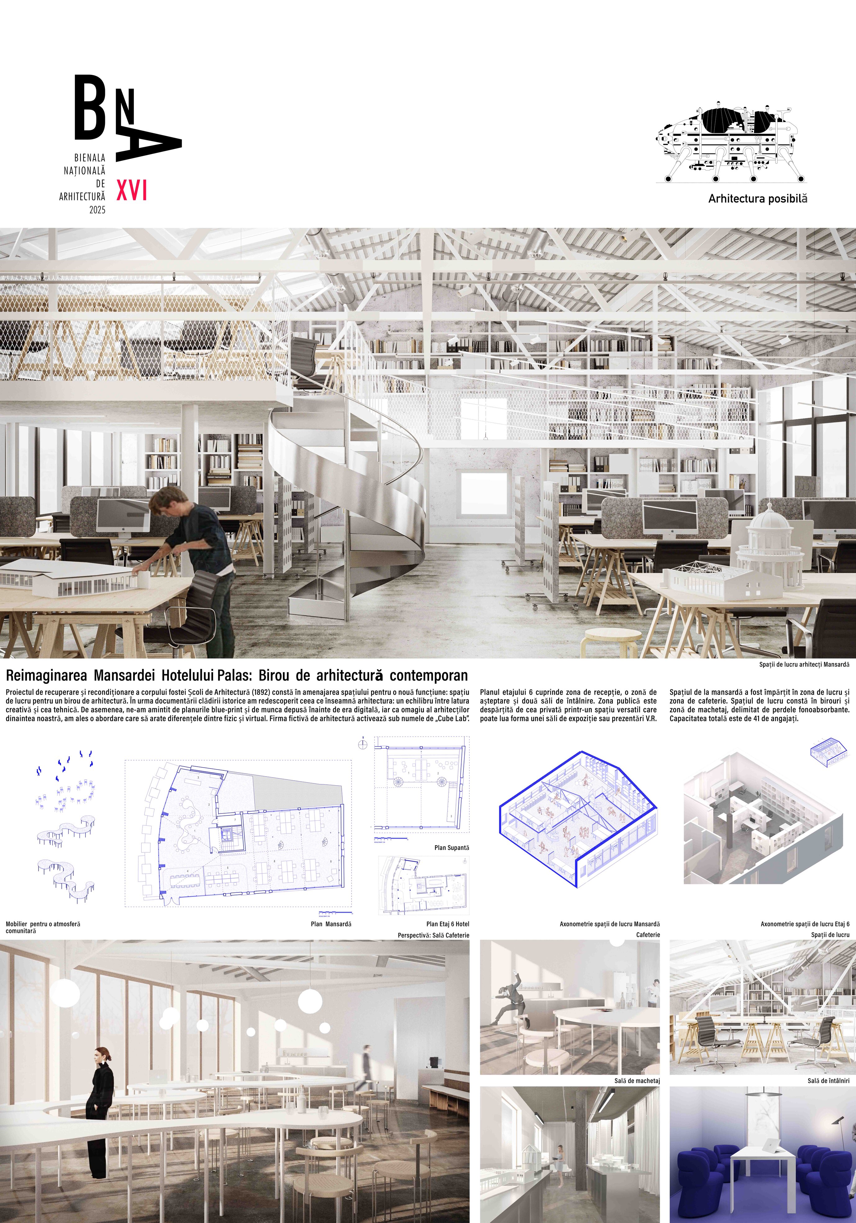 Proiectul de recuperare și recondiționare a corpului fostei Școli de Arhitectură (1892) constă în amenajarea spațiului pentru o nouă funcțiune: spațiu de lucru pentru un birou de arhitectură. În urma documentării clădirii istorice am redescoperit ceea ce înseamnă arhitectura: un echilibru între latura creativă și cea tehnică. De asemenea, ne-am amintit de planurile blue-print și de munca depusă înainte de era digitală, iar ca omagiu al arhitecților dinaintea noastră, am ales o abordare care să arate diferențele dintre fizic și virtual.