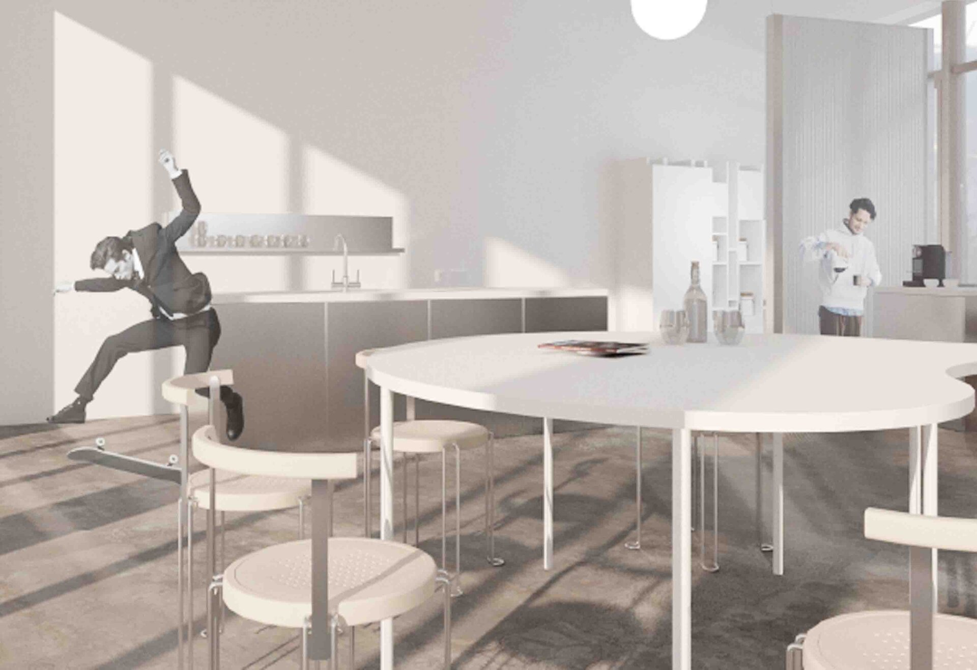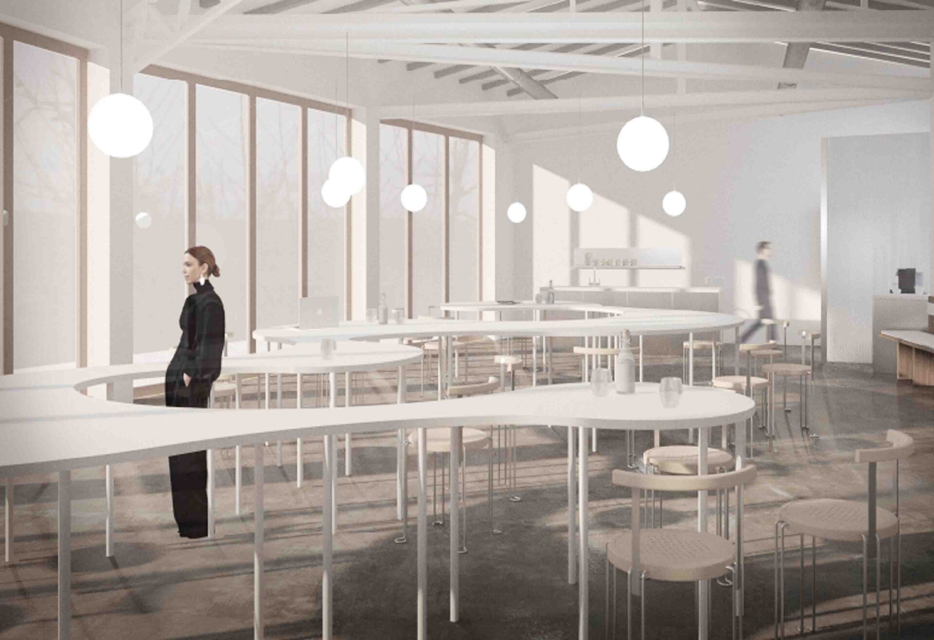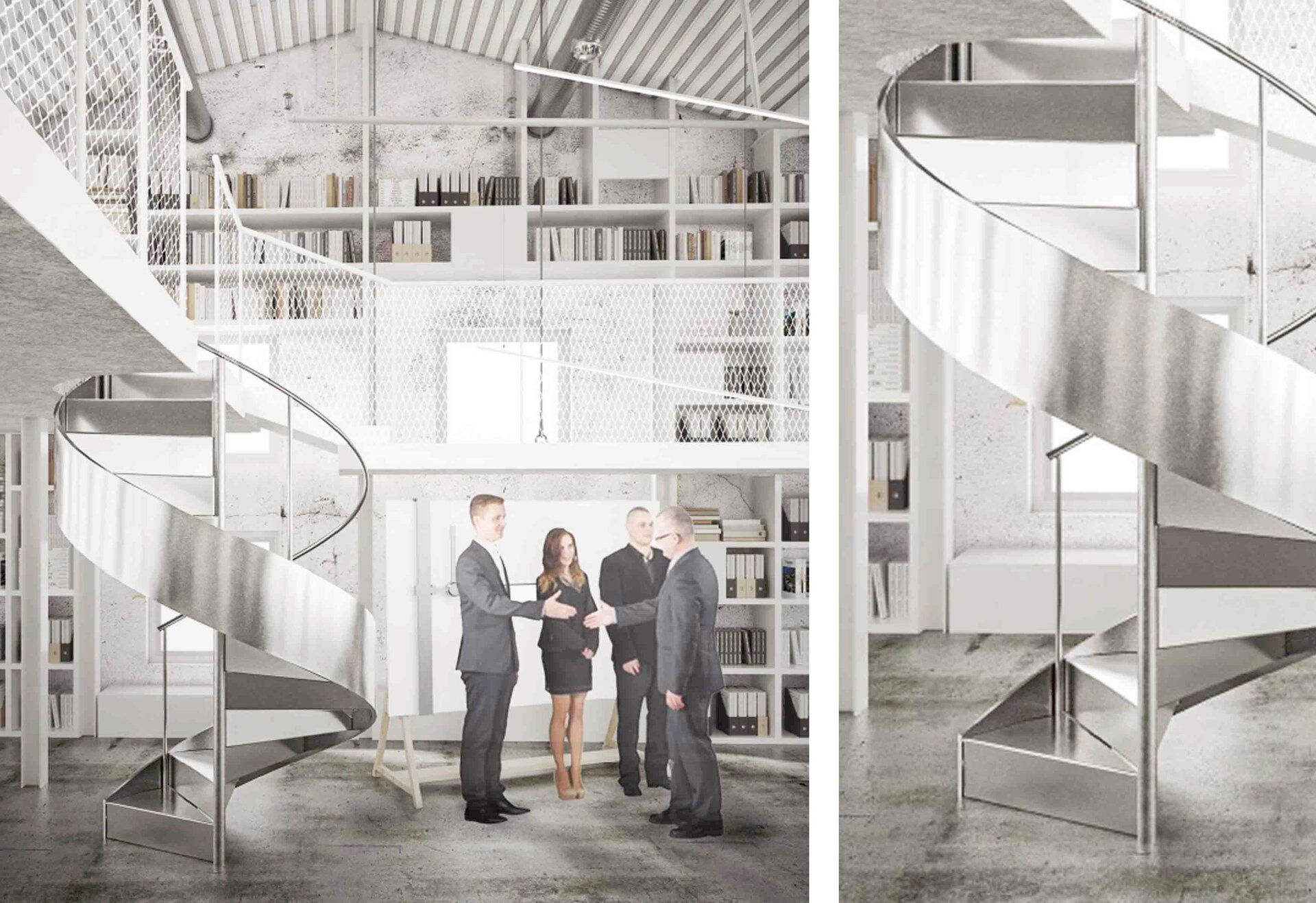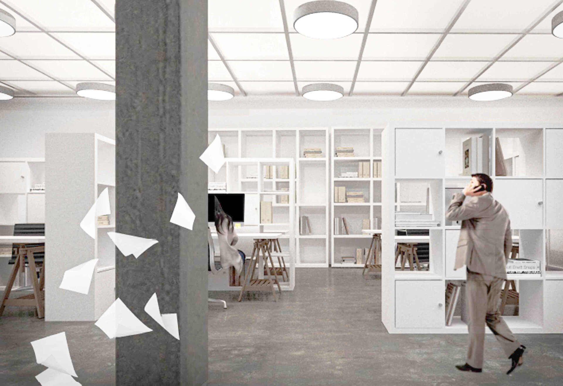 În amenajare am aderat la principii și tehnologii sustenabile. A fost necesară o intervenție arhitecturală pentru optimizarea spațiului, motiv pentru care am propus astfel o supantă, ce permite o nouă înțelegere și simțire a spațiului. Poziționată decentrat, supanta cuprinde și o pasarelă către biblioteca de pe peretele estic. Accesul către spațiul mezanin se realizează prin două scări elicoidale din tablă îndoită vopsită. Structura supantei este simplă, metalică, vopsită în alb, cu o prezență diafană în perimetrul zonei de lucru, structura nouă fiind ajutată de cabluri metalice pentru o senzație de plutire. Am propus înlocuirea învelitoarei originale cu o învelitoare metalică prevăzută cu o cavitate de circulare a aerului.