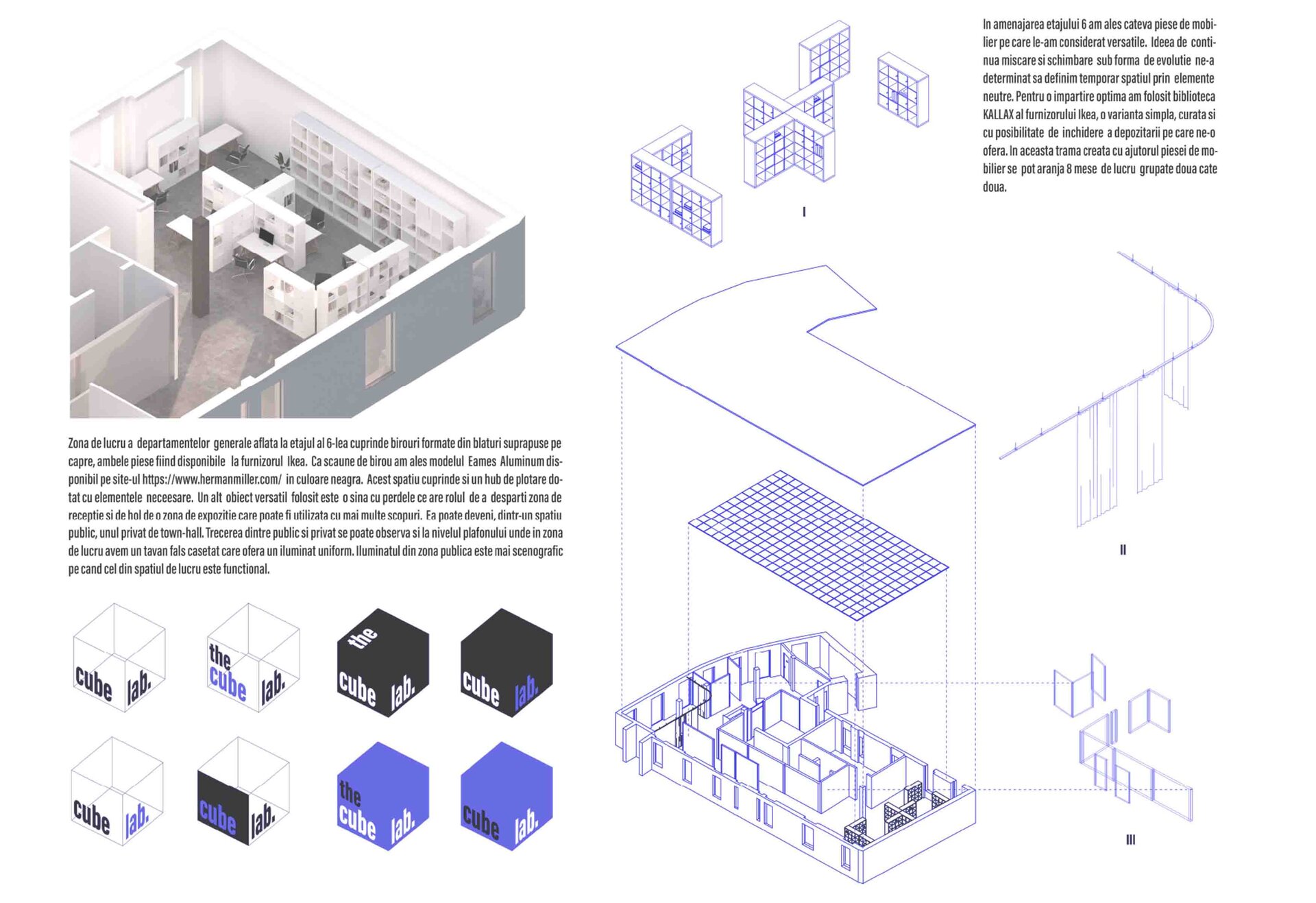 Firma fictivă de arhitectură activează sub numele de „Cube Lab”. Atât numele cât și logoul firmei ilustrează conceptele care stau la baza proiectelor: tipologii de volume simple, dar încărcate cu semnificații, sinceritatea materialelor și estetica experimentală care transmite un mesaj sau relevă o anumită stare. Într-o lume în care aproape orice lucru este posibil de efectuat și o identitate este ușor de construit, ne-am dorit să punem accent pe necesitatea autenticului și fiecare element sau material folosit are un rol semnificativ în discursul arhitectural. Sediul biroului se desfășoară pe etajul 6 și mansardă.