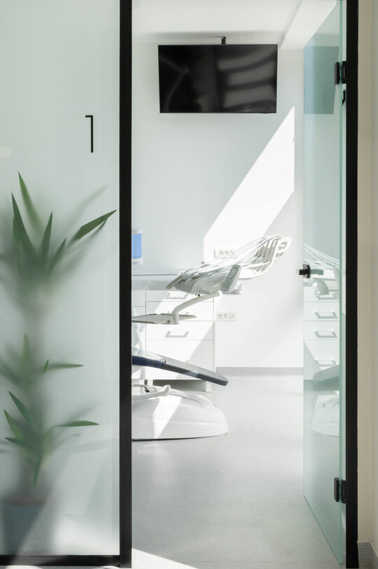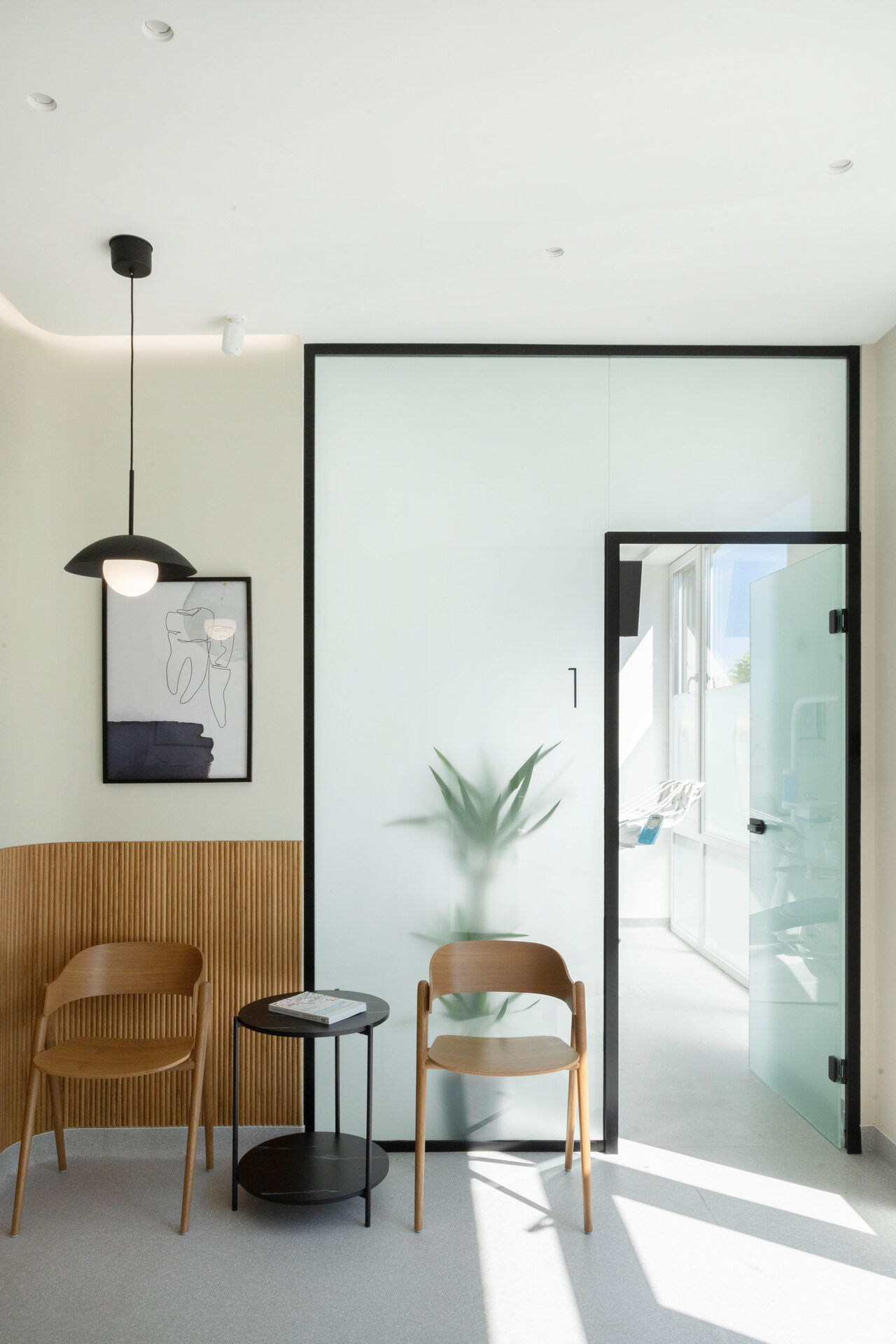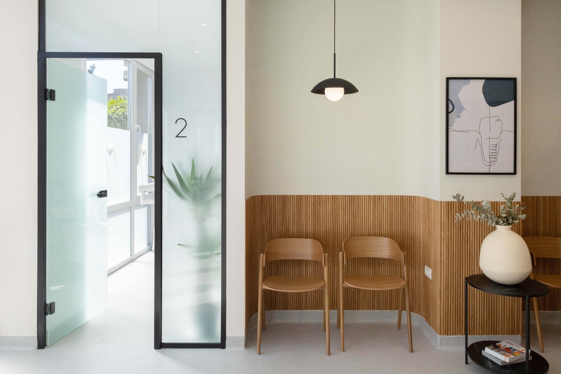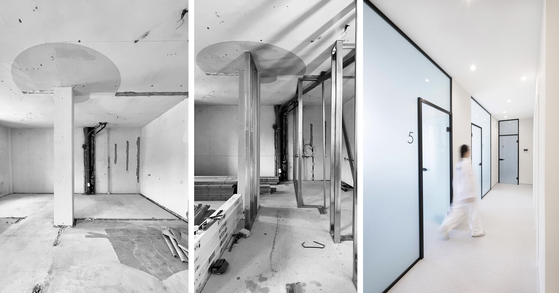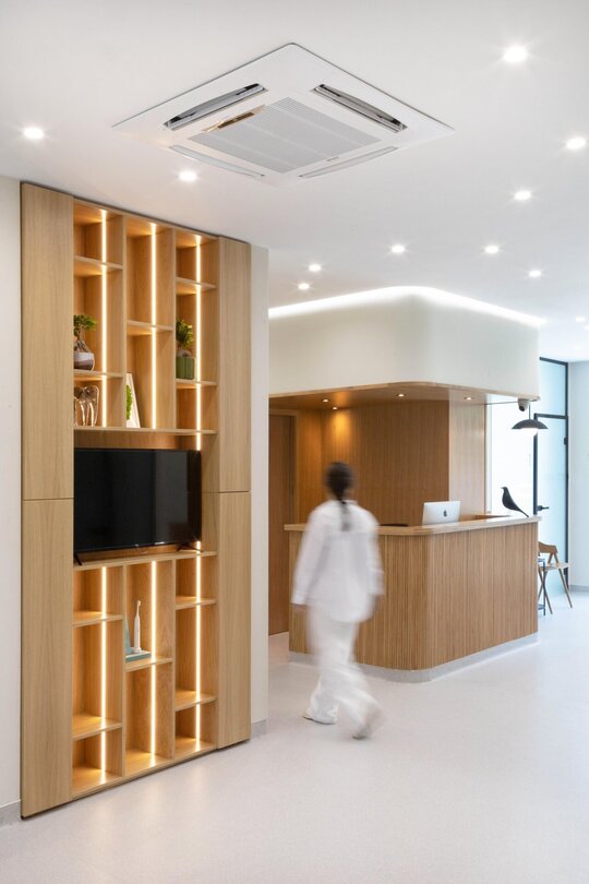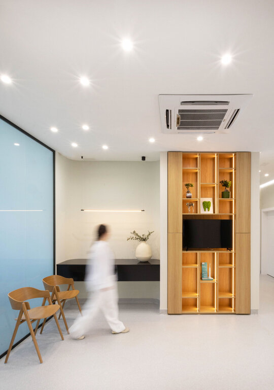 Cabinetele sunt delimitate prin uși vitrate înalte (280 cm), ce permit luminii să circule și contribuie la orientarea facilă a pacienților. Grupurile sanitare reiau același limbaj vizual, cu detalii și nișe gândite specific funcțiunii.