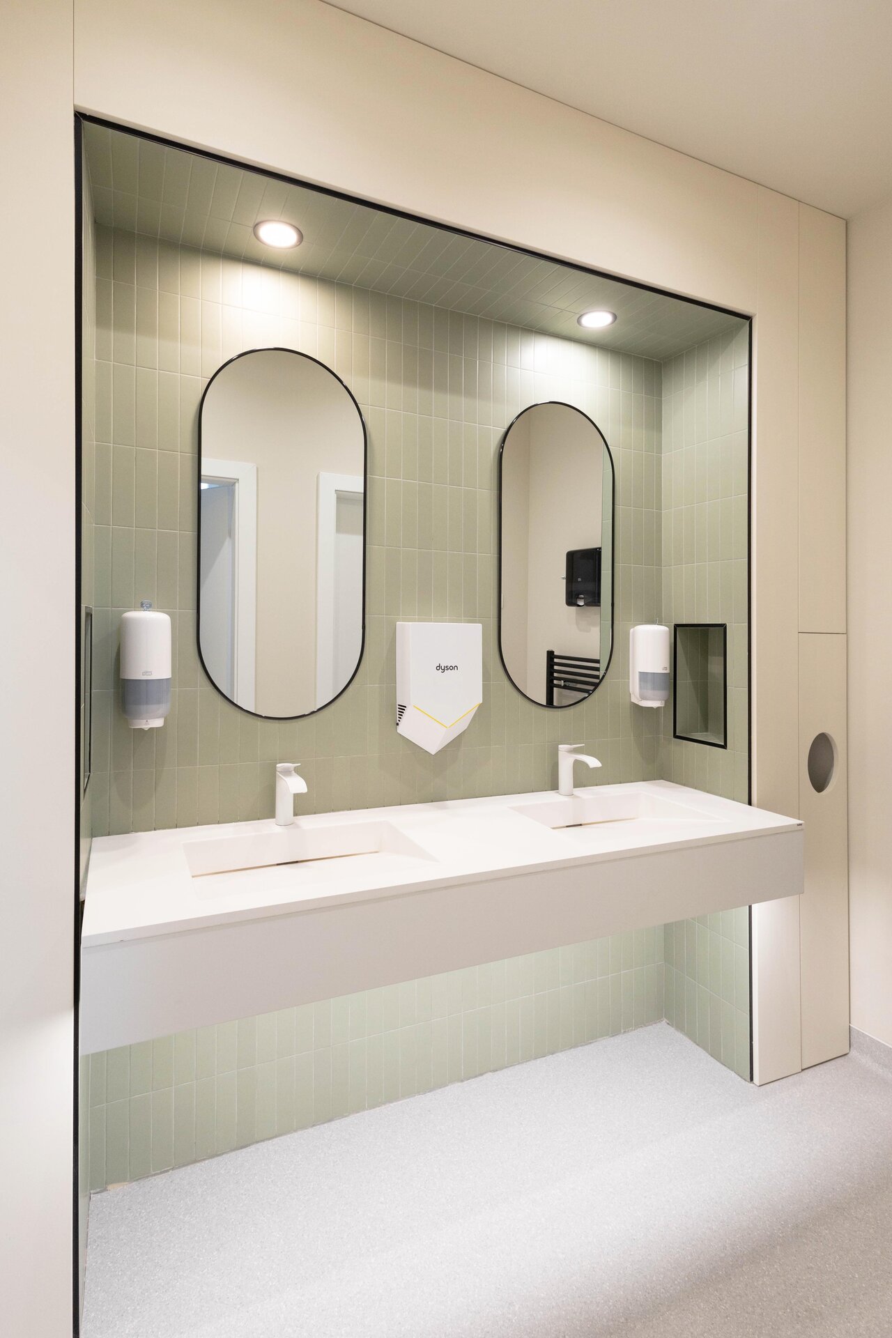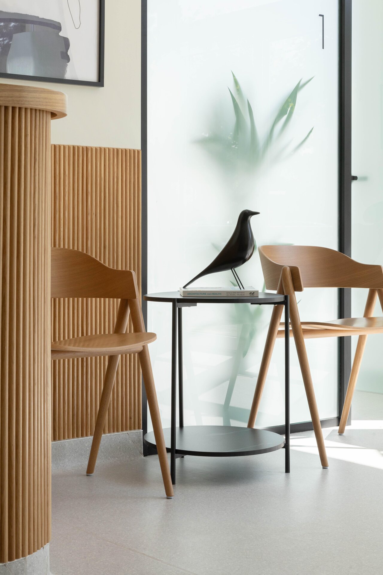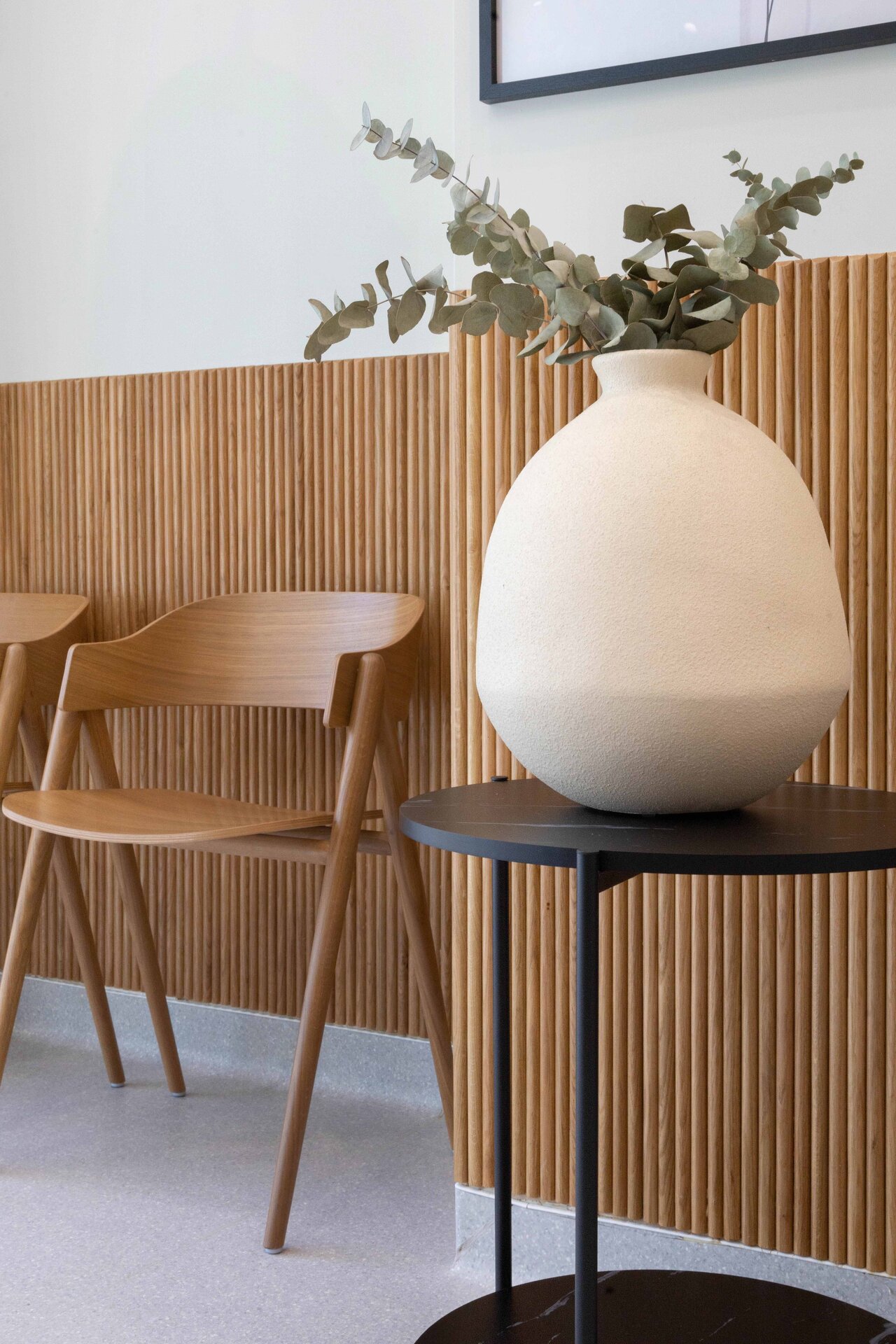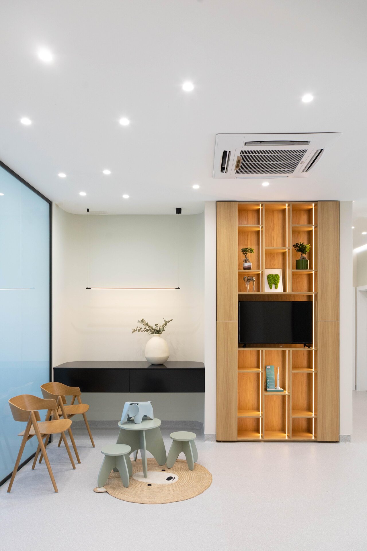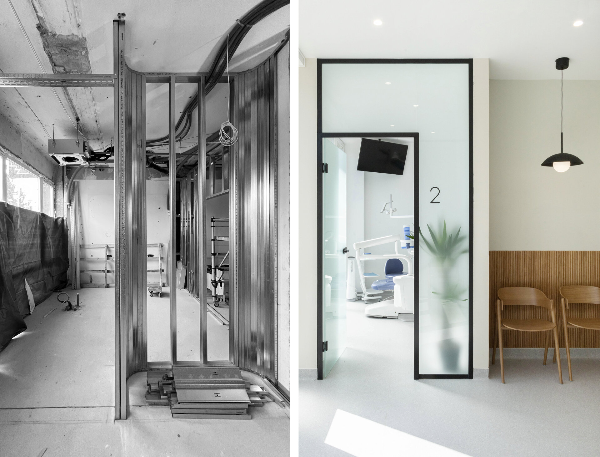 Cabinetele sunt delimitate prin uși vitrate înalte (280 cm), ce permit luminii să circule și contribuie la orientarea facilă a pacienților. Grupurile sanitare reiau același limbaj vizual, cu detalii și nișe gândite specific funcțiunii.