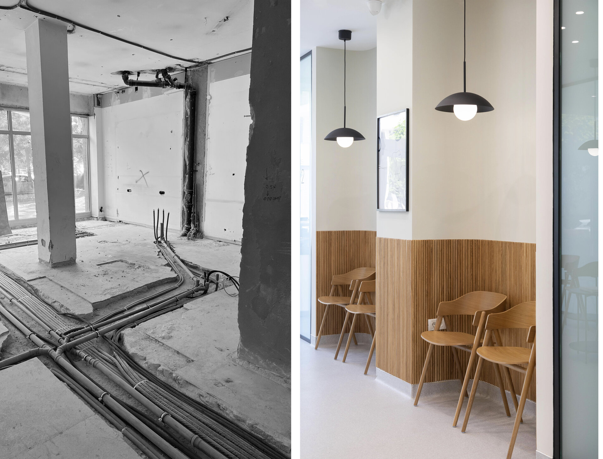 Pentru a păstra o legătură discretă cu istoria clădirii, am integrat riflaje din lemn, suprafețe de beton texturat și sticlă, reinterpretate într-o cheie contemporană.