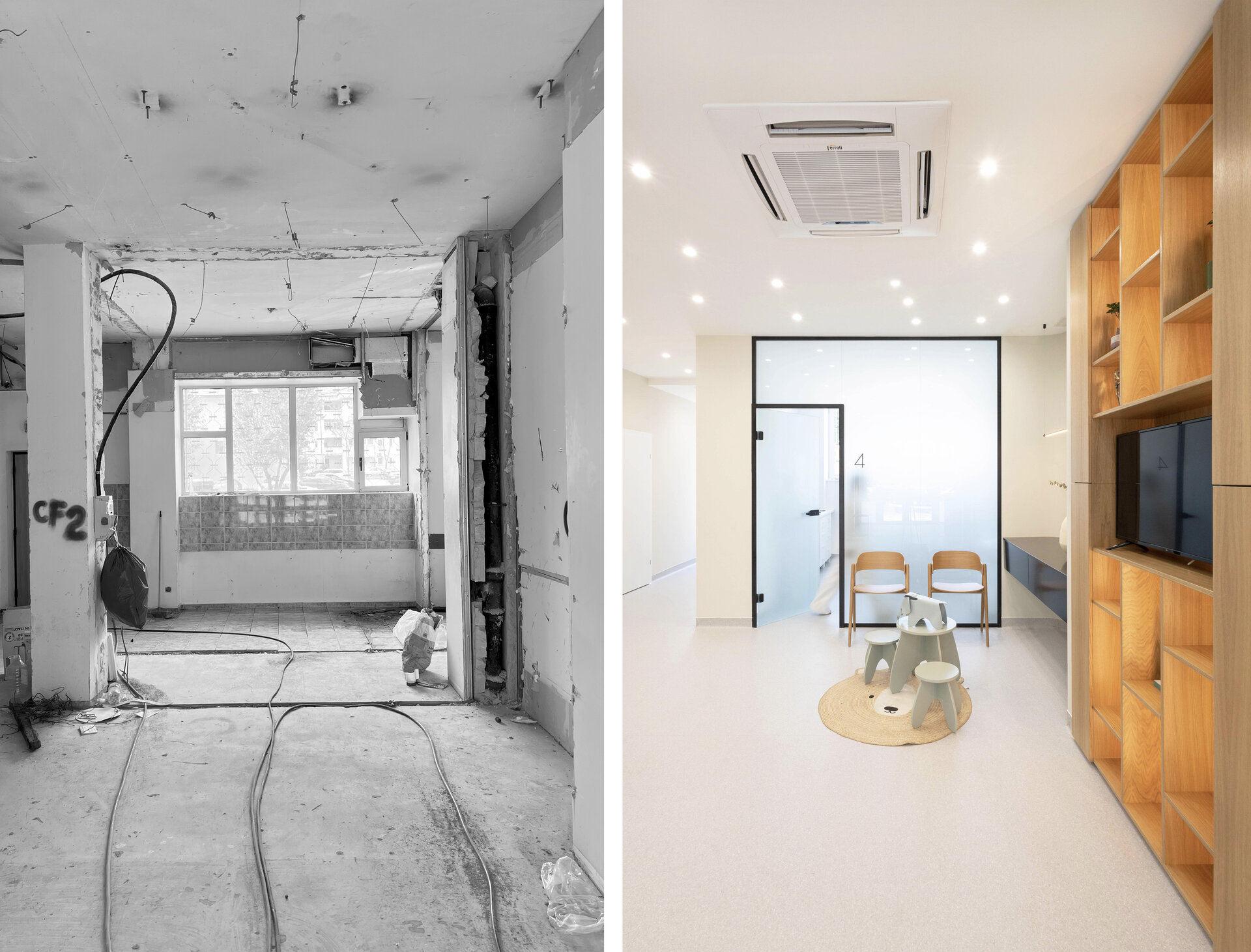 La preluarea proiectului, spațiul era complet necompartimentat. Deciziile de organizare au fost influențate de tema de proiectare, caracteristicile originale ale locului, dar și de o constrângere structurală: un zid de beton armat aflat central, imposibil de eliminat, care a dictat întreaga logică de compartimentare.