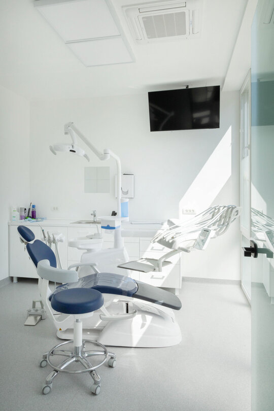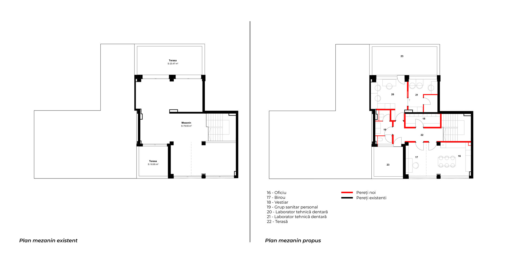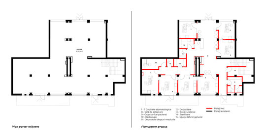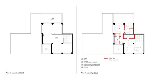 Parterul reunește toate funcțiunile cu acces public – șapte cabinete, radiologia, zona de așteptare, grupuri sanitare și spații tehnice. Mezaninul este dedicat personalului și include vestiare, laboratorul de tehnică dentară, birou și o zonă de relaxare.
