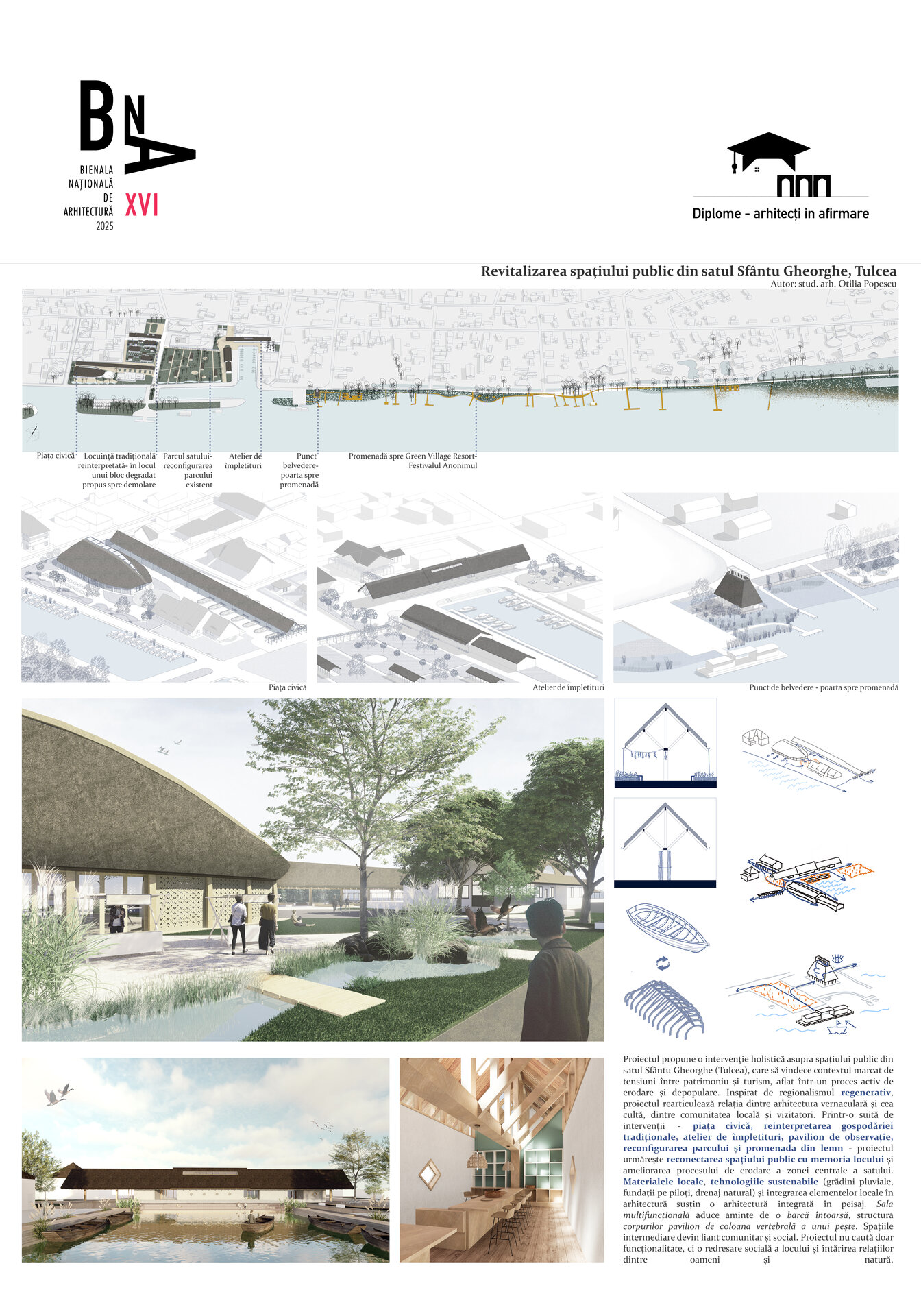 Proiectul propune o intervenție holistică asupra spațiului public din satul Sfântu Gheorghe, situat la gura de vărsare a brațului Sfântu Gheorghe în Marea Neagră. Printr-o abordare inspirată de regionalismul regenerativ, urmărind atât idealurile și direcțiile estetice ale regionalismului critic, cât și integrarea factorilor economici și politici, intervenția urmărește găsirea unui echilibru între arhitectura vernaculară și arhitectura cultă, între utilizatorii permanenți - localnicii- și cei temporari- vizitatorii. Intervențiile sunt gândite sub forma completării unui parcurs în prezent sacadat și erodat și se împart în mai multe categorii: ecologizarea locului prin desființare/ relocare, construcții noi, amenajare urbană.