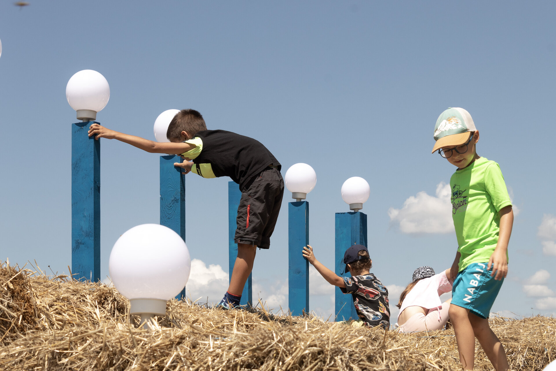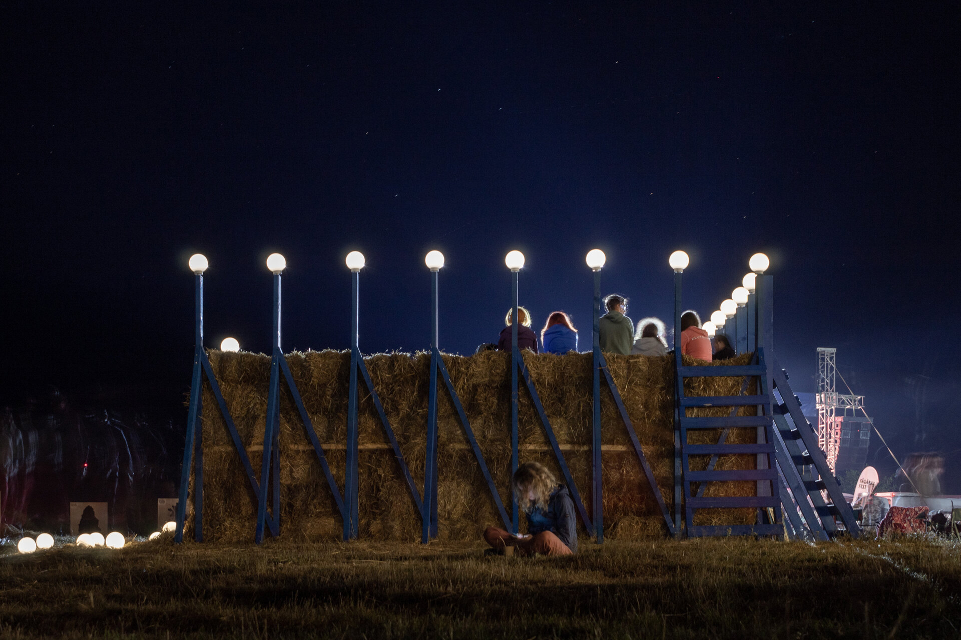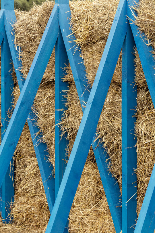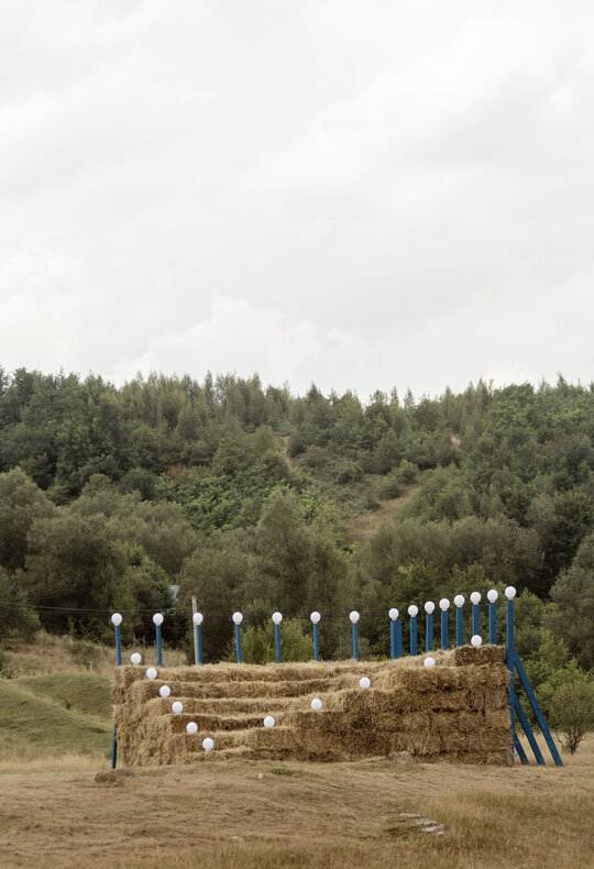 Fânul este utilizat sub formă de baloți, fiind ușor de manipulat și generează întregul pas structural al amfiteatrului. Structura exterioară și cea intermediară interioară ce susține baloții este realizată din elemente de lemn provenit din surse locale. Instalația îmbogățește subtil peisajul nocturn prin adăugarea de sfere luminoase alimentate cu energie solară.