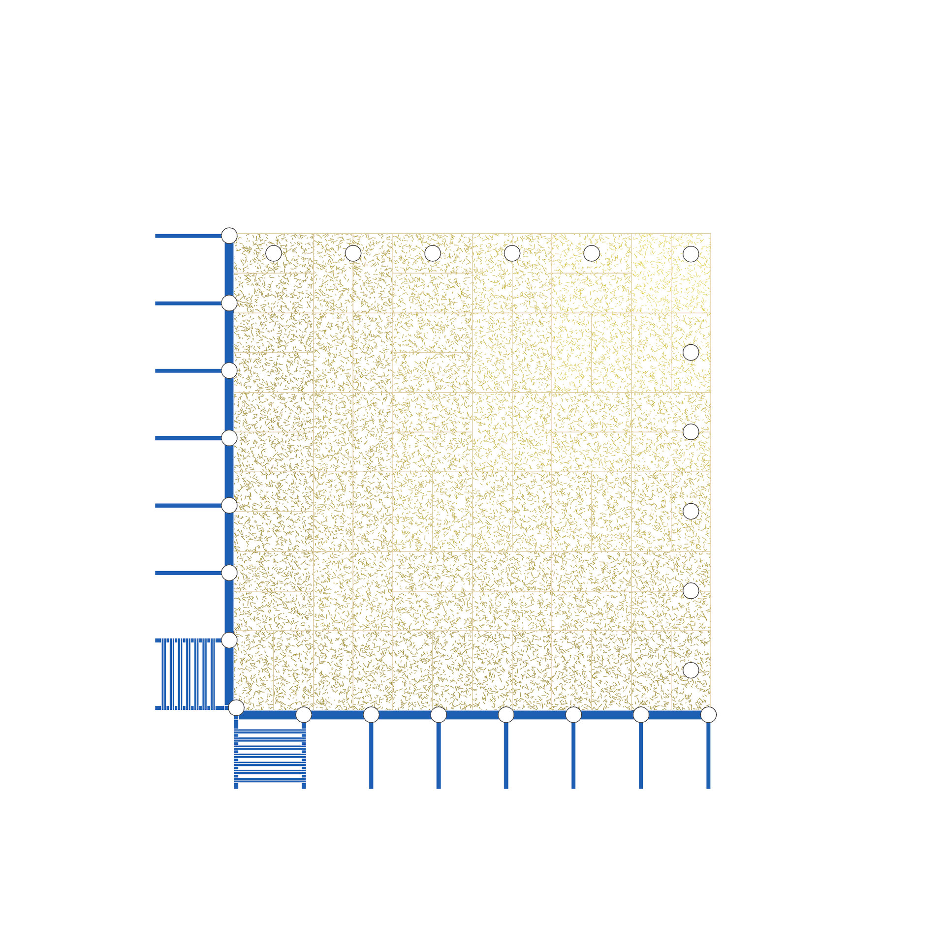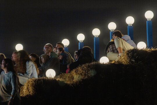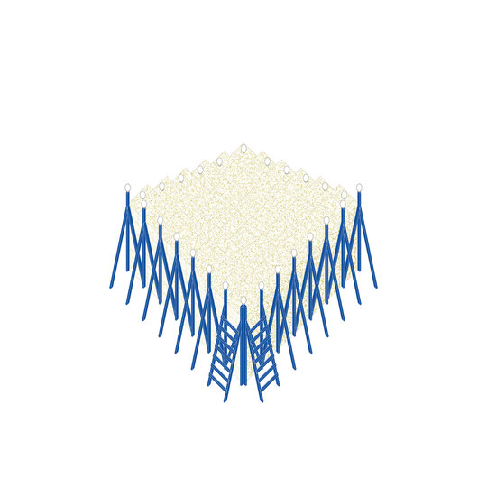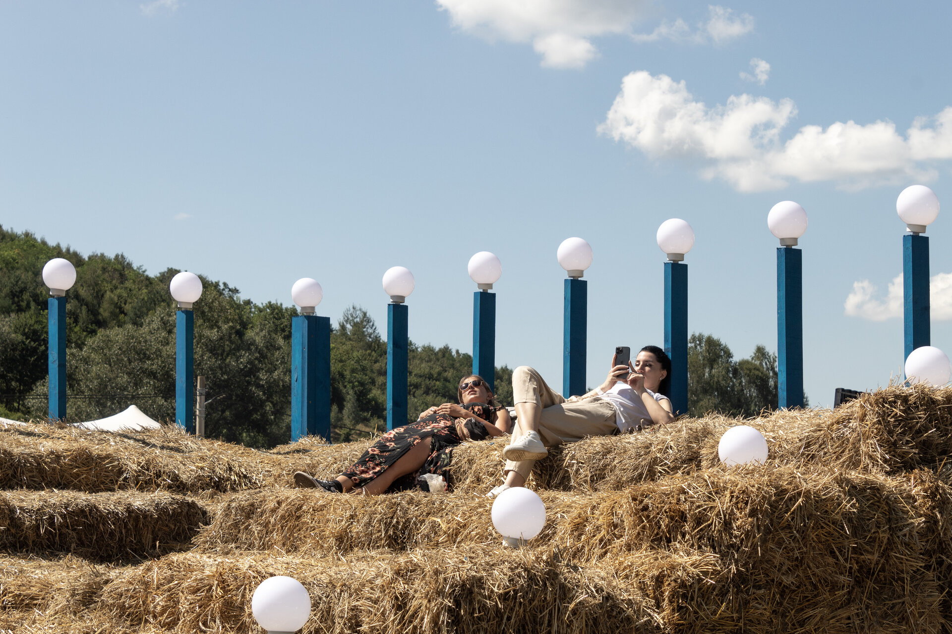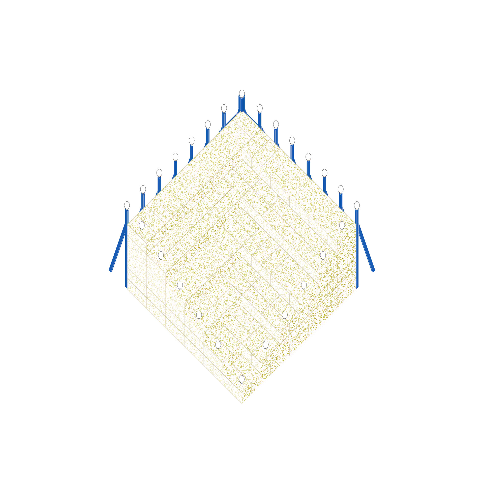 Fânul este utilizat sub formă de baloți, fiind ușor de manipulat și generează întregul pas structural al amfiteatrului. Structura exterioară și cea intermediară interioară ce susține baloții este realizată din elemente de lemn provenit din surse locale. Instalația îmbogățește subtil peisajul nocturn prin adăugarea de sfere luminoase alimentate cu energie solară.
