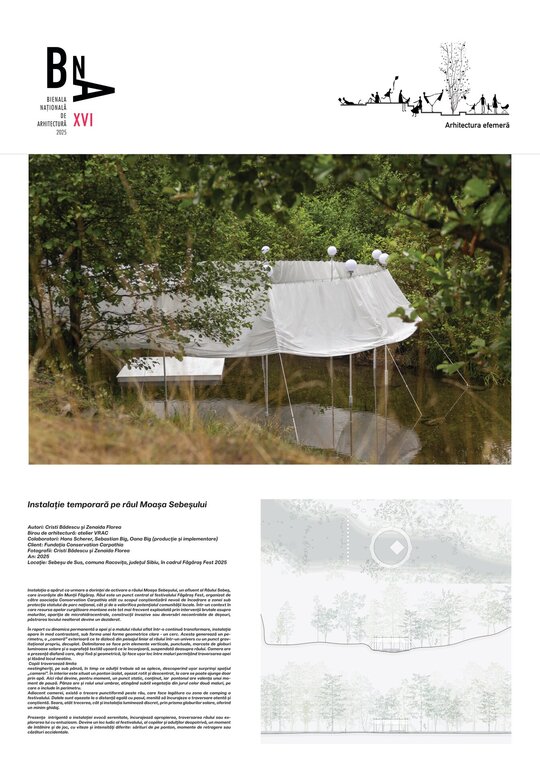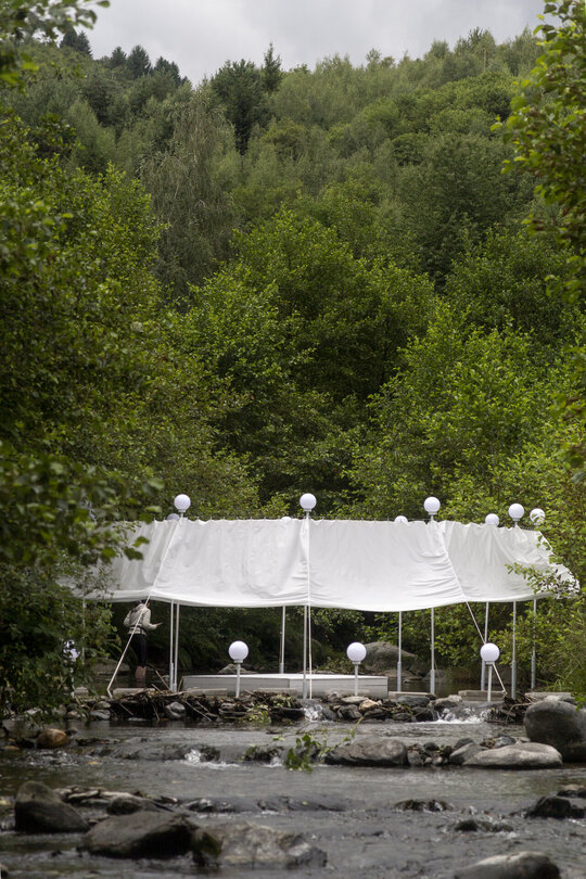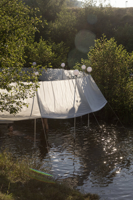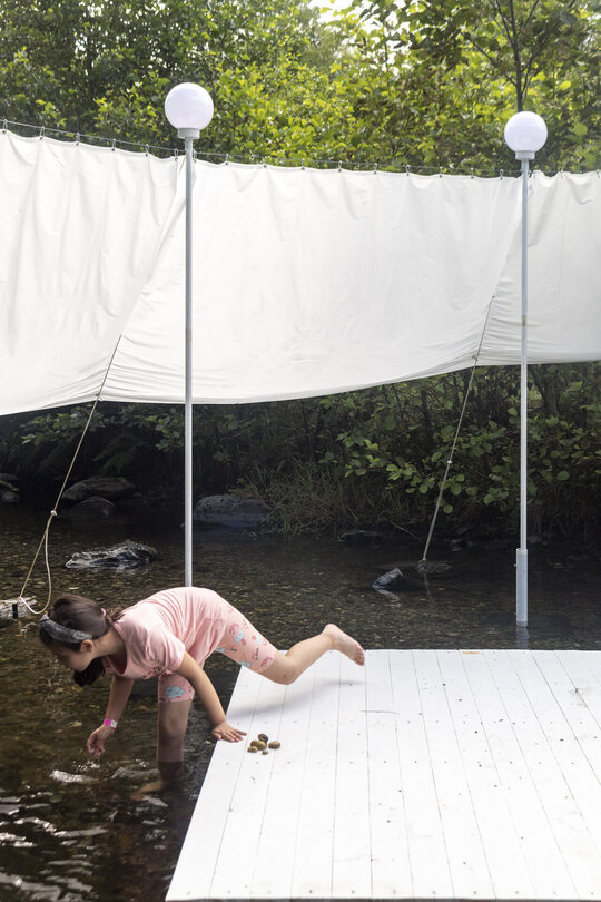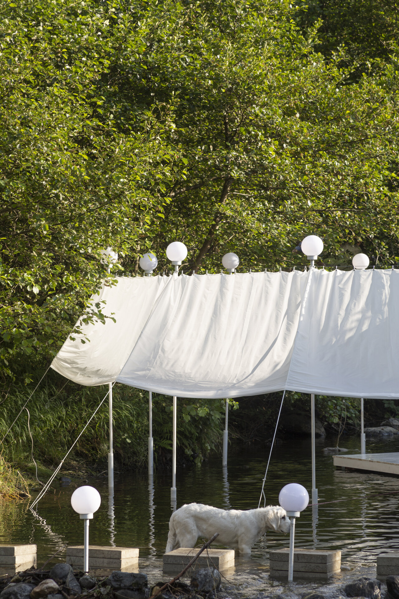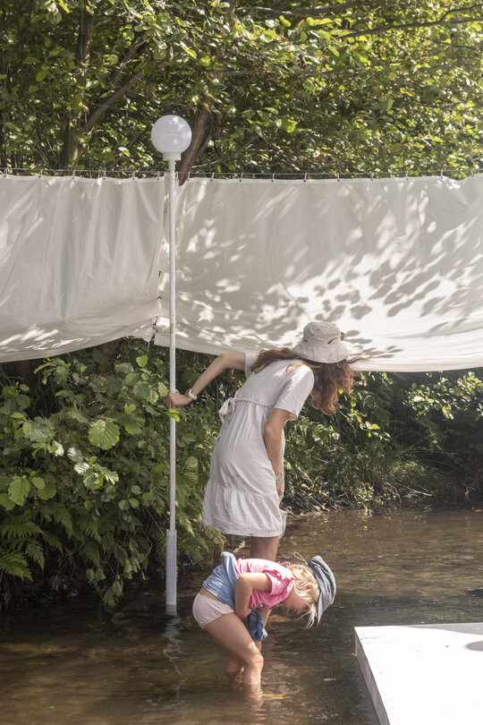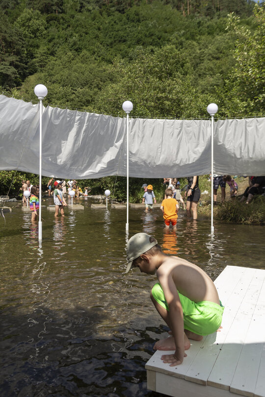 nestingheriți, pe sub pânză, în timp ce adulții trebuie să se aplece, descoperind ușor surprinși spațiul „camerei”. În interior este situat un ponton izolat, așezat rotit și descentrat, la care se poate ajunge doar prin apă. Aici râul devine, pentru moment, un punct static, conținut, iar pontonul are valența unui moment de pauză. Pânza are și rolul unui umbrar, atingând subtil vegetația din jurul celor două maluri, pe care o include în perimetru.