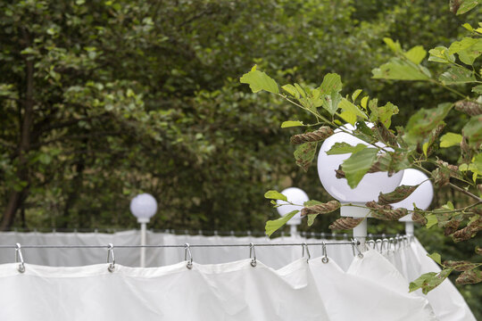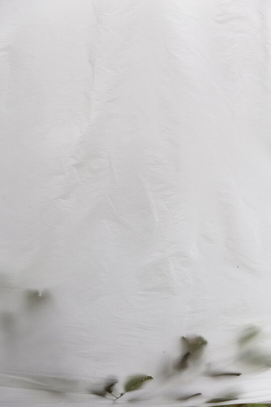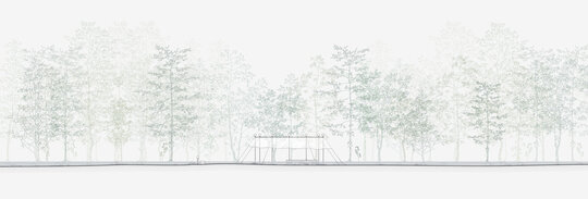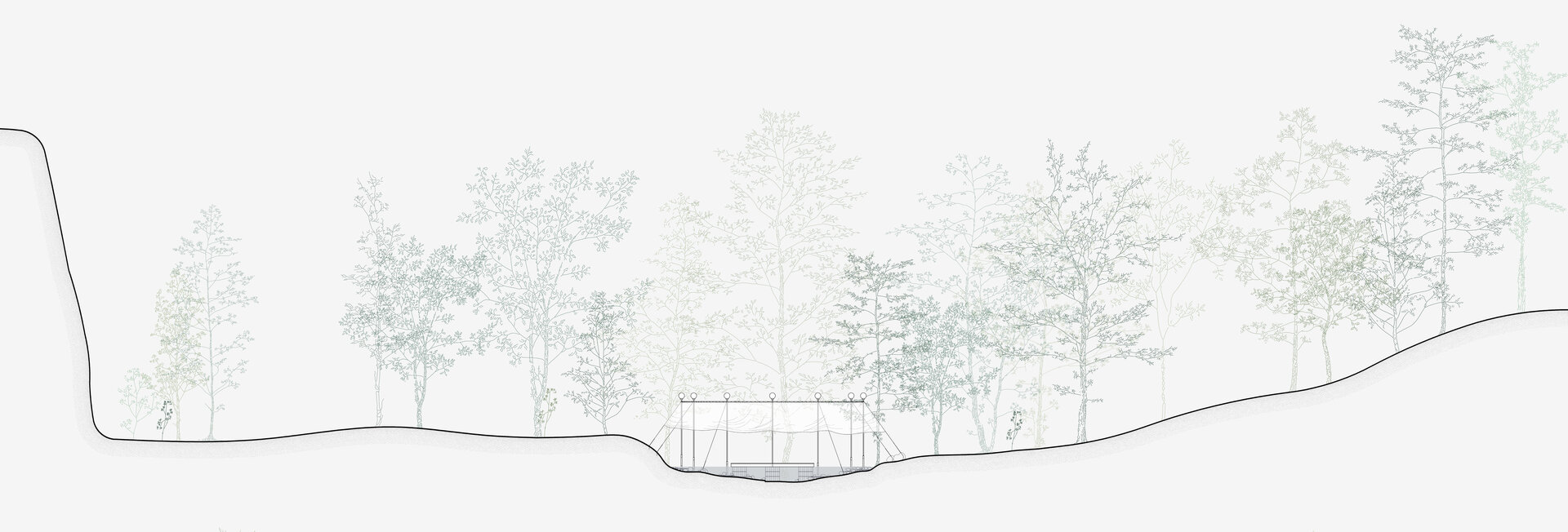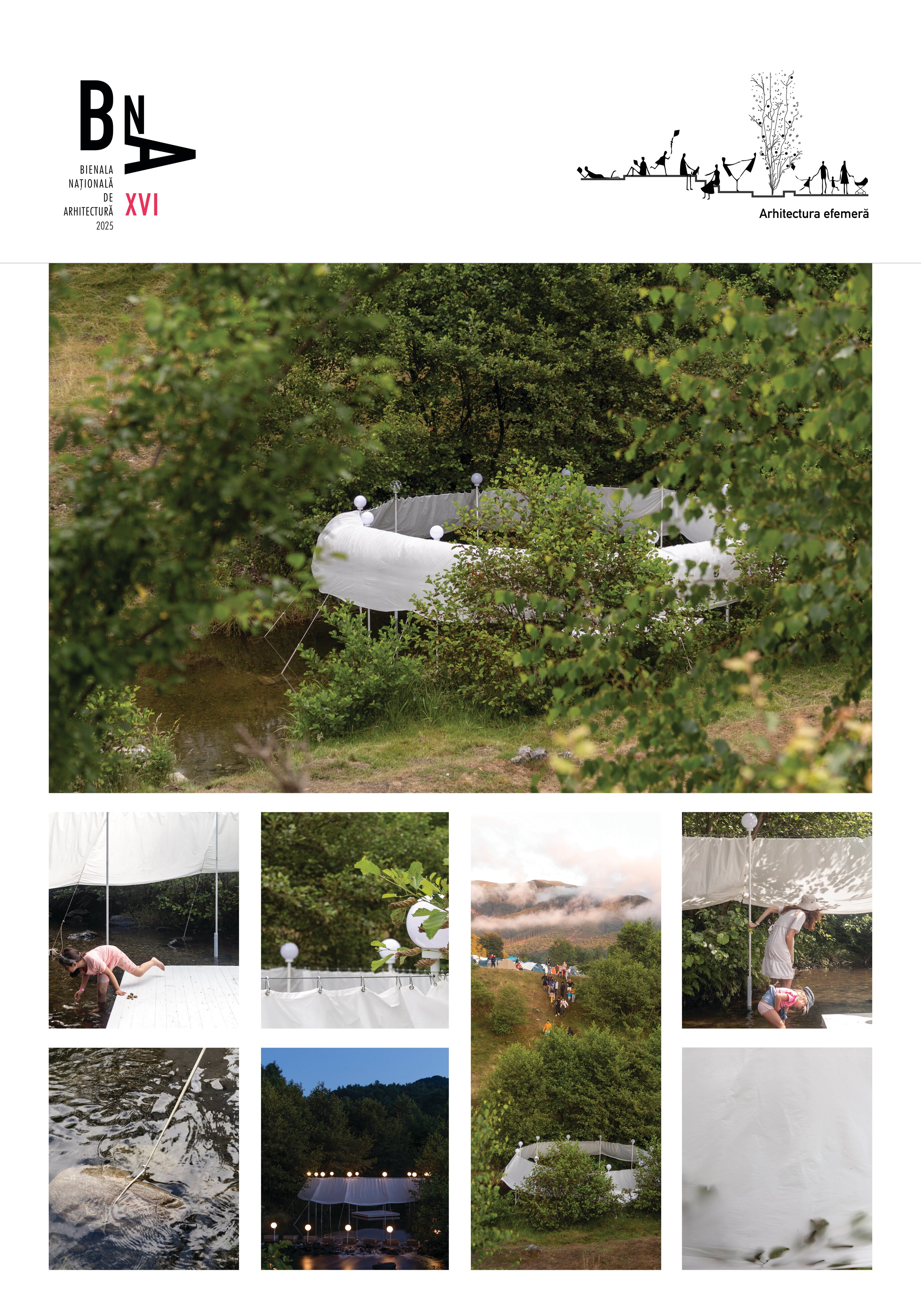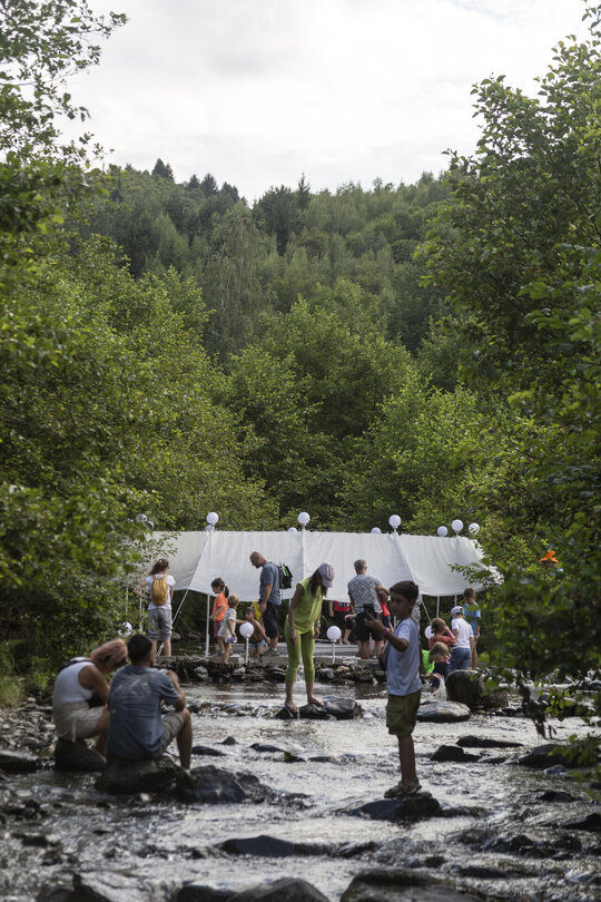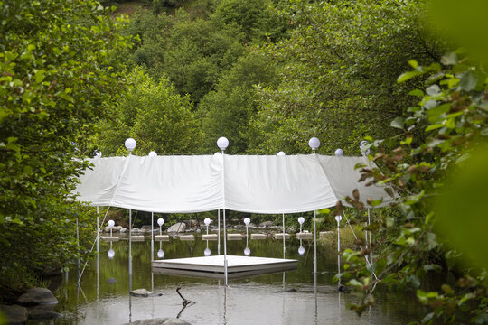 nestingheriți, pe sub pânză, în timp ce adulții trebuie să se aplece, descoperind ușor surprinși spațiul „camerei”. În interior este situat un ponton izolat, așezat rotit și descentrat, la care se poate ajunge doar prin apă. Aici râul devine, pentru moment, un punct static, conținut, iar pontonul are valența unui moment de pauză. Pânza are și rolul unui umbrar, atingând subtil vegetația din jurul celor două maluri, pe care o include în perimetru.