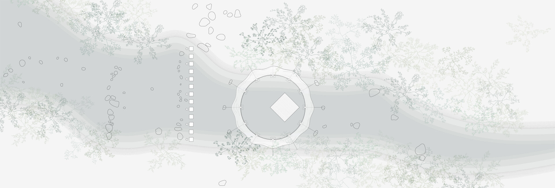 În raport cu dinamica permanentă a apei și a malului râului aflat într-o continuă transformare, instalația apare în mod contrastant, sub forma unei forme geometrice clare - un cerc. Acesta generează un perimetru, o „cameră” exterioară ce te dizlocă din peisajul liniar al râului într-un univers cu un punct gravitațional propriu, decuplat. Delimitarea se face prin elemente verticale, punctuale, marcate de globuri luminoase solare și o suprafață textilă ușoară ce le înconjoară, suspendată deasupra râului. Camera are o prezență diafană care, deși fixă și geometrică, își face ușor loc între maluri permițând traversarea apei și lăsând locul neatins.