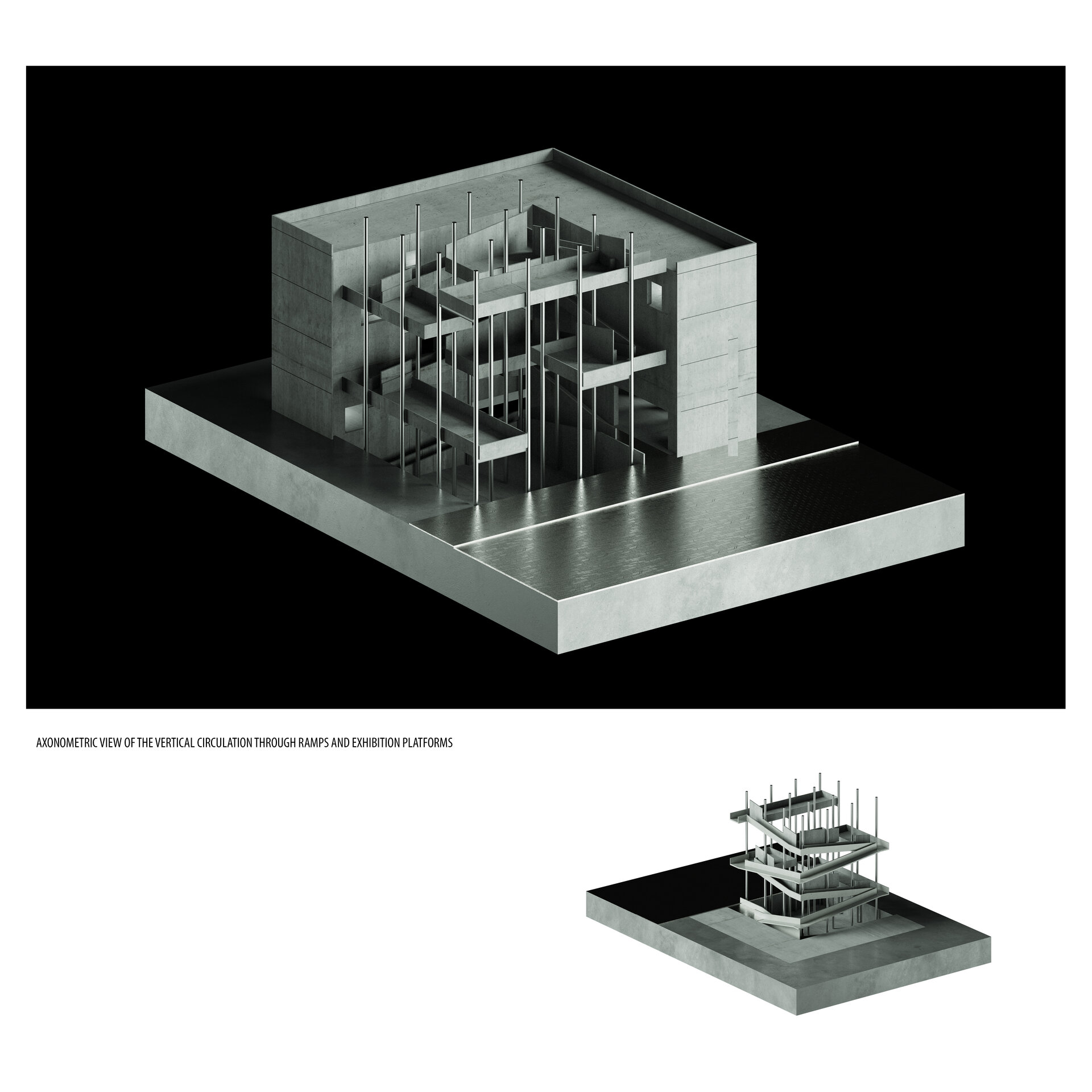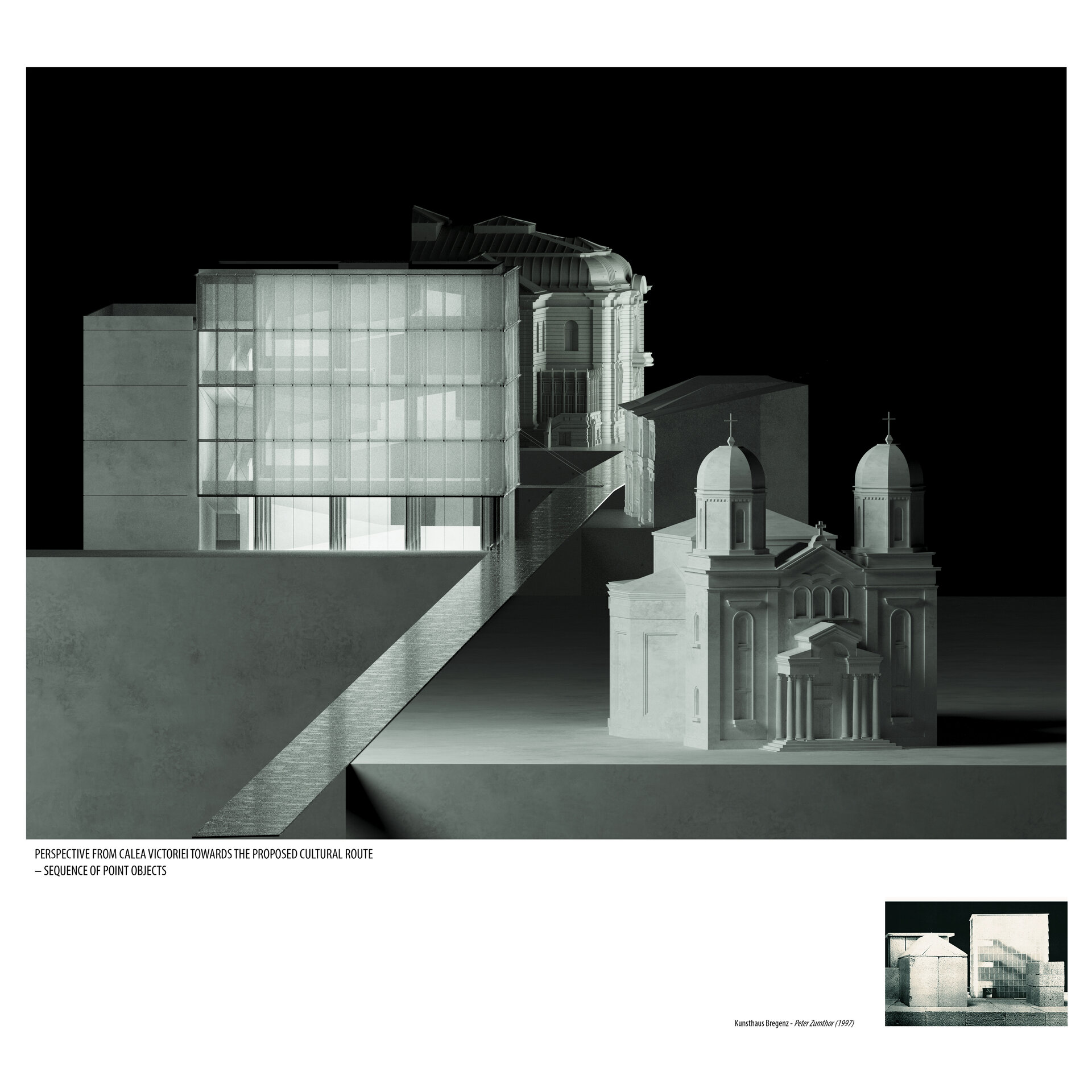 Volumul în formă de L, masiv și introvertit, contrastează cu transparența cubului. Rampele sunt adosate acestui corp și definesc un traseu vertical desfășurat între două limite: masivitatea volumului instituțional și deschiderea către spațiul expozițional. Această poziționare generează percepția unui parcurs suspendat, care pare să plutească în tensiunea dintre cele două registre.