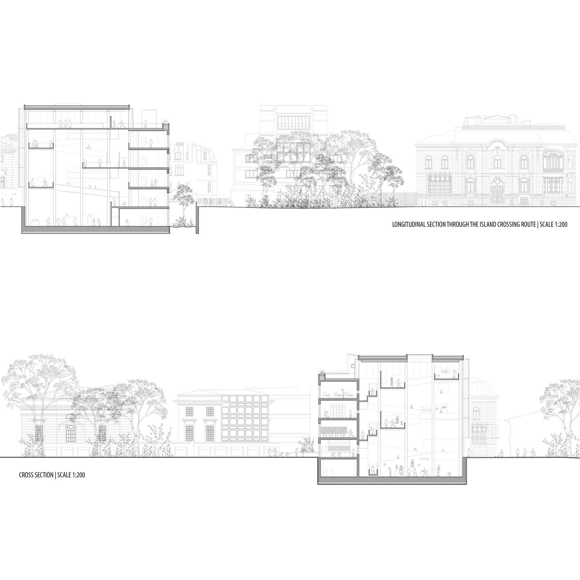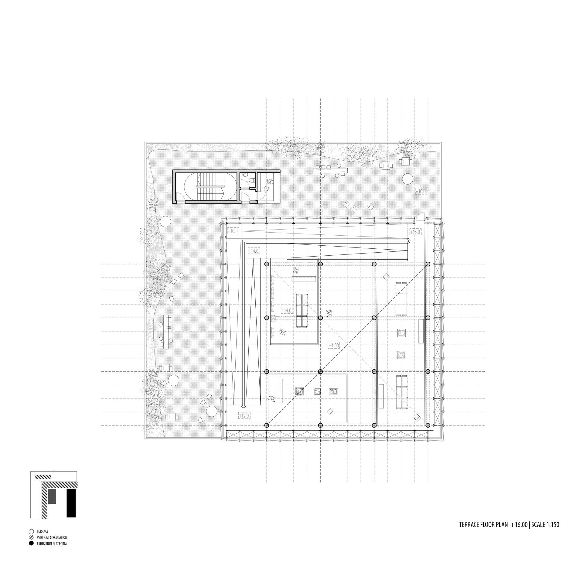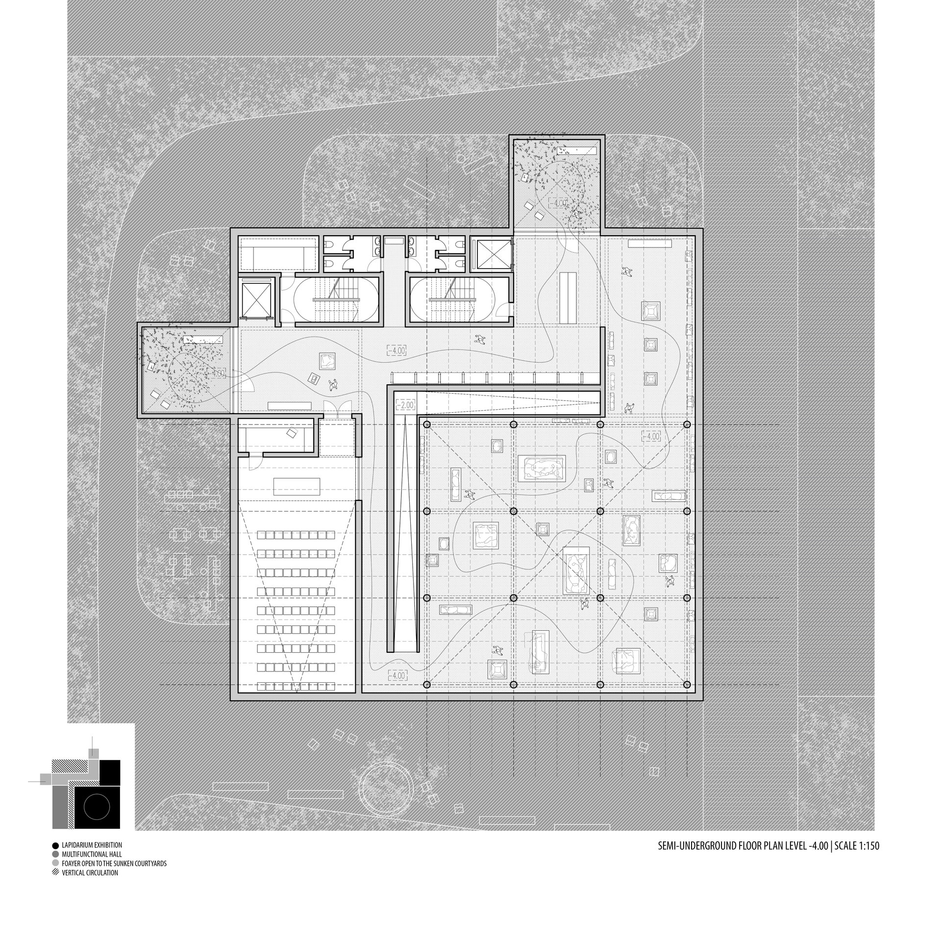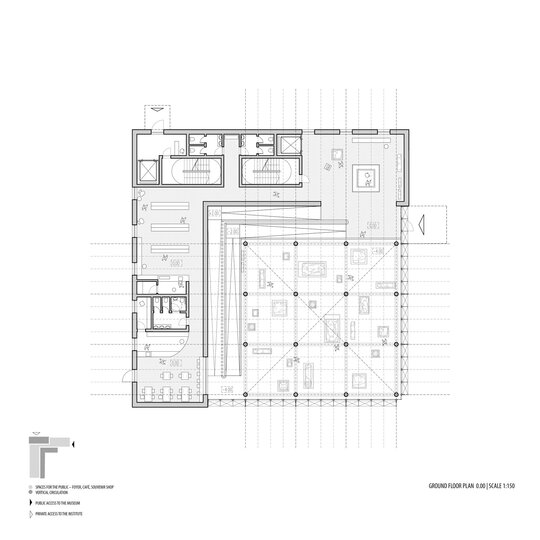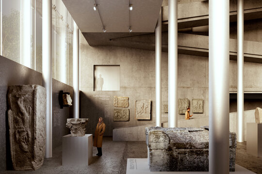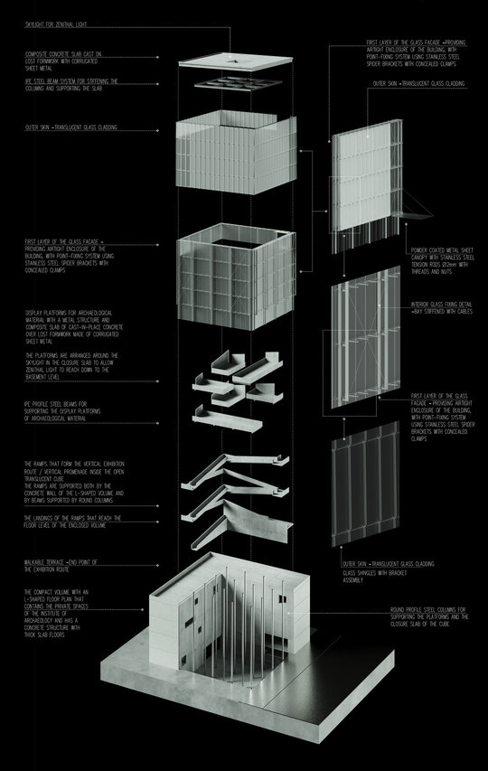 Configurația spațială a noului volum derivă dintr-o analiză atentă a sitului. Se disting două tipuri de limite: pe de o parte, frontul solid și închis al țesutului rezidențial adiacent; pe de altă parte, marginea deschisă și poroasă a parcului. Acest contrast a generat planul în formă de L și articularea a două volume distincte, cu expresii arhitecturale diferite. Dualitatea se reflectă atât la nivel volumetric, cât și structural, subliniind rolurile complementare ale celor două corpuri. Un volum opac și introvertit adăpostește funcțiunile private ale Institutului de Arheologie, în timp ce celălalt, translucid și deschis, găzduiește un traseu expozițional vertical destinat publicului: o succesiune de platforme plasate la cote diferite și conectate prin rampe, configurând un parcurs ascendent care, la fiecare pas, dezvăluie o perspectivă nouă. Platformele, variate ca proporții și poziționare, se dispun în jurul unui gol central iluminat zenital, generând relații spațiale dinamice pe verticală și un echilibru subtil între plin și gol.