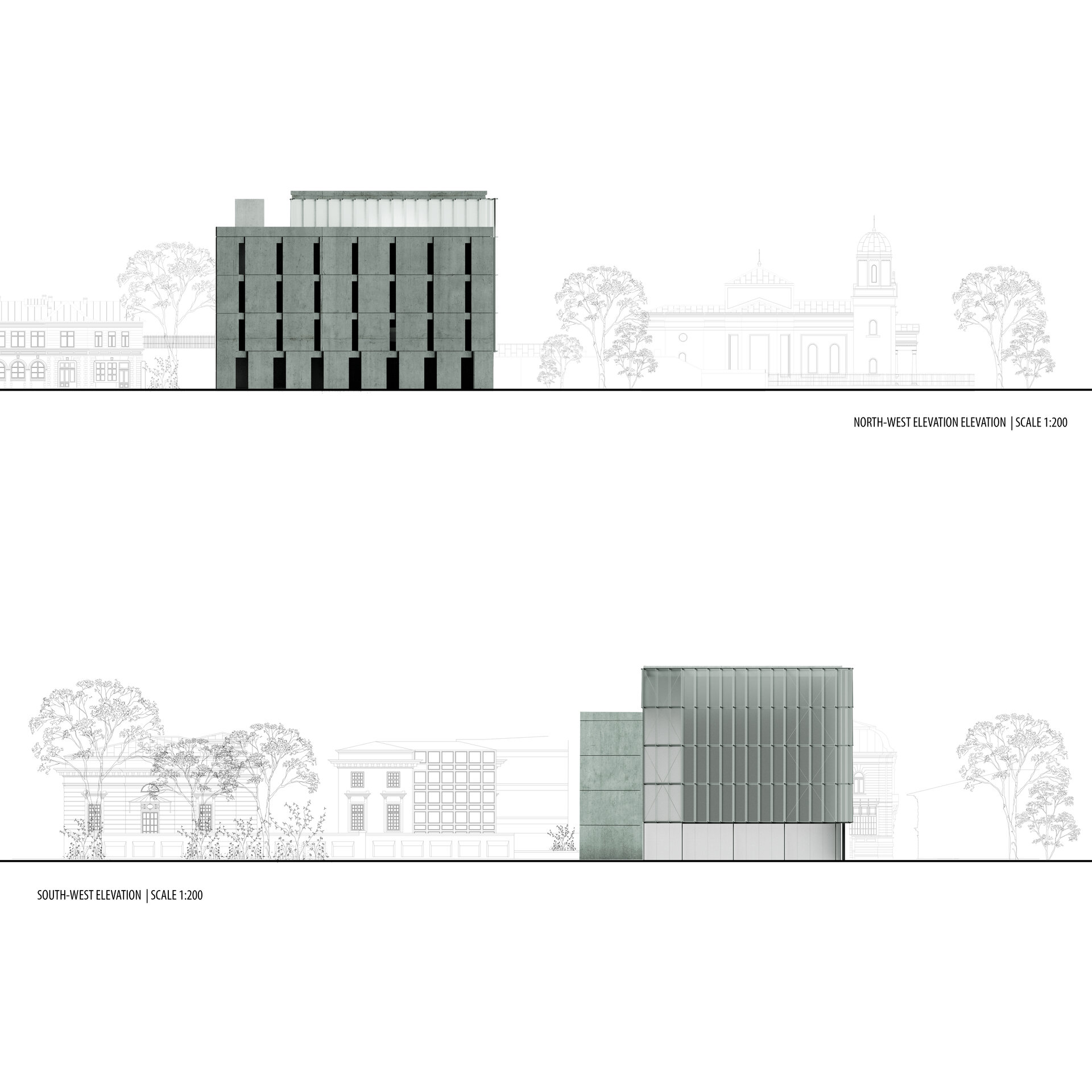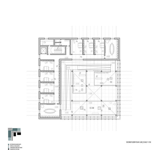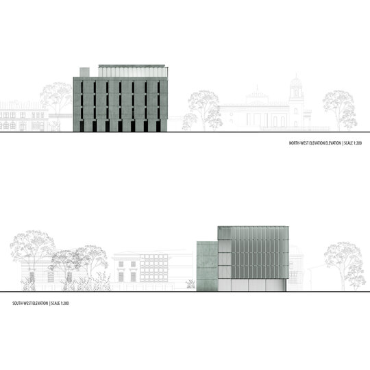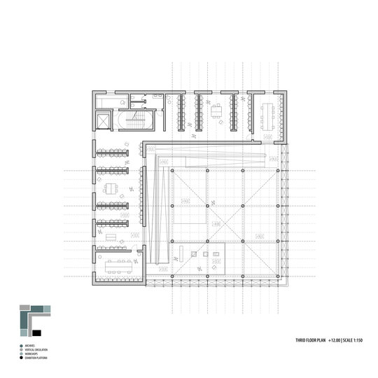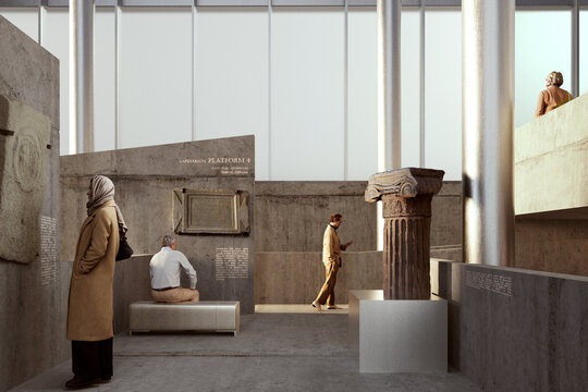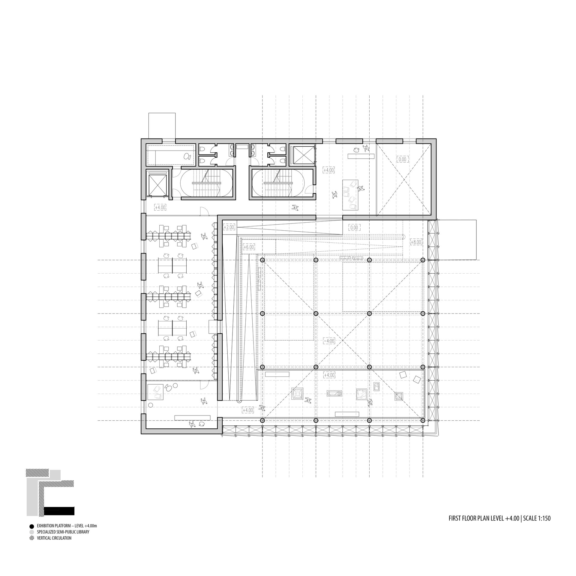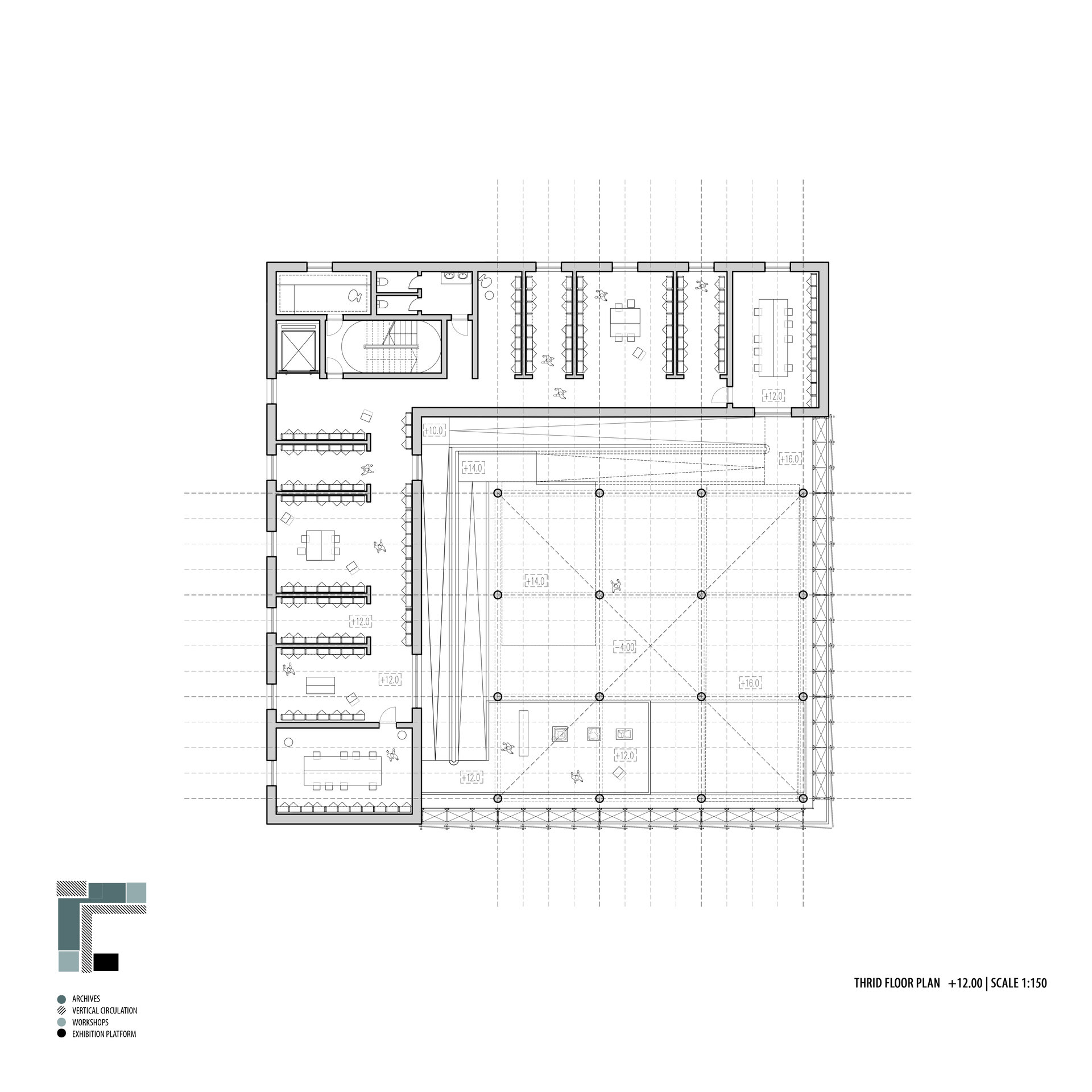 Configurația spațială a noului volum derivă dintr-o analiză atentă a sitului. Se disting două tipuri de limite: pe de o parte, frontul solid și închis al țesutului rezidențial adiacent; pe de altă parte, marginea deschisă și poroasă a parcului. Acest contrast a generat planul în formă de L și articularea a două volume distincte, cu expresii arhitecturale diferite. Dualitatea se reflectă atât la nivel volumetric, cât și structural, subliniind rolurile complementare ale celor două corpuri. Un volum opac și introvertit adăpostește funcțiunile private ale Institutului de Arheologie, în timp ce celălalt, translucid și deschis, găzduiește un traseu expozițional vertical destinat publicului: o succesiune de platforme plasate la cote diferite și conectate prin rampe, configurând un parcurs ascendent care, la fiecare pas, dezvăluie o perspectivă nouă. Platformele, variate ca proporții și poziționare, se dispun în jurul unui gol central iluminat zenital, generând relații spațiale dinamice pe verticală și un echilibru subtil între plin și gol.