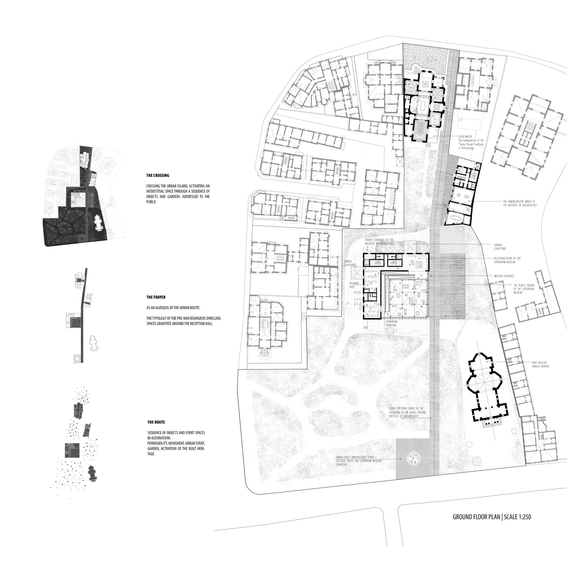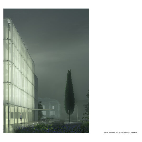 Terenul de intervenție se află în imediata vecinătate a Casei Macca, în centrul insulei urbane, pe o parcelă ce face parte din Parcul Nicolae Iorga. Situl se plasează la granița dintre axa culturală definitorie a orașului, Calea Victoriei — conectată prin intermediul parcului, zonă verde de tranziție către miezul insulei urbane — și țesutul rezidențial istoric, ce exprimă dimensiunea intimă a orașului. Intervenția propusă este, așadar, atât un act de reactivare urbană, cât și un răspuns la nevoile concrete ale instituției: spații specializate pentru cercetare, laboratoare, zone de colaborare interdisciplinară și un muzeu de tip lapidariu, care deschide activitatea științifică către publicul larg.