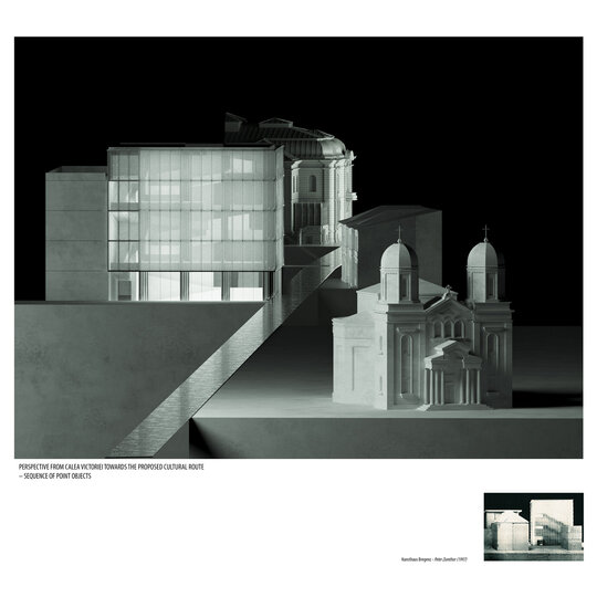 Strategia proiectului propune crearea unui traseu cultural secundar, derivat din axa principală a Căii Victoriei, alcătuit dintr-o succesiune de obiecte și grădini. Acest nou traseu funcționează ca o structură narativă: începe cu o piațetă minerală, menită să anunțe prezența evenimentului urban, atinge punctul culminant în dreptul muzeului lapidariu și se încheie cu Casa Macca.