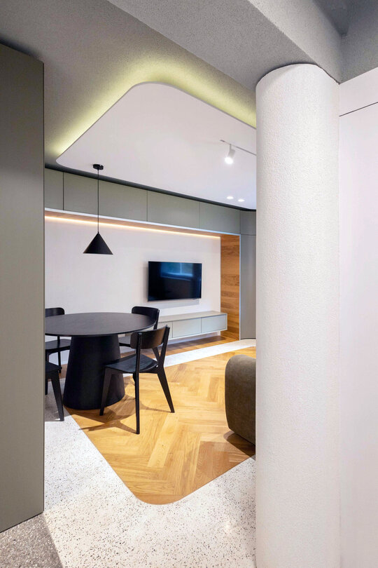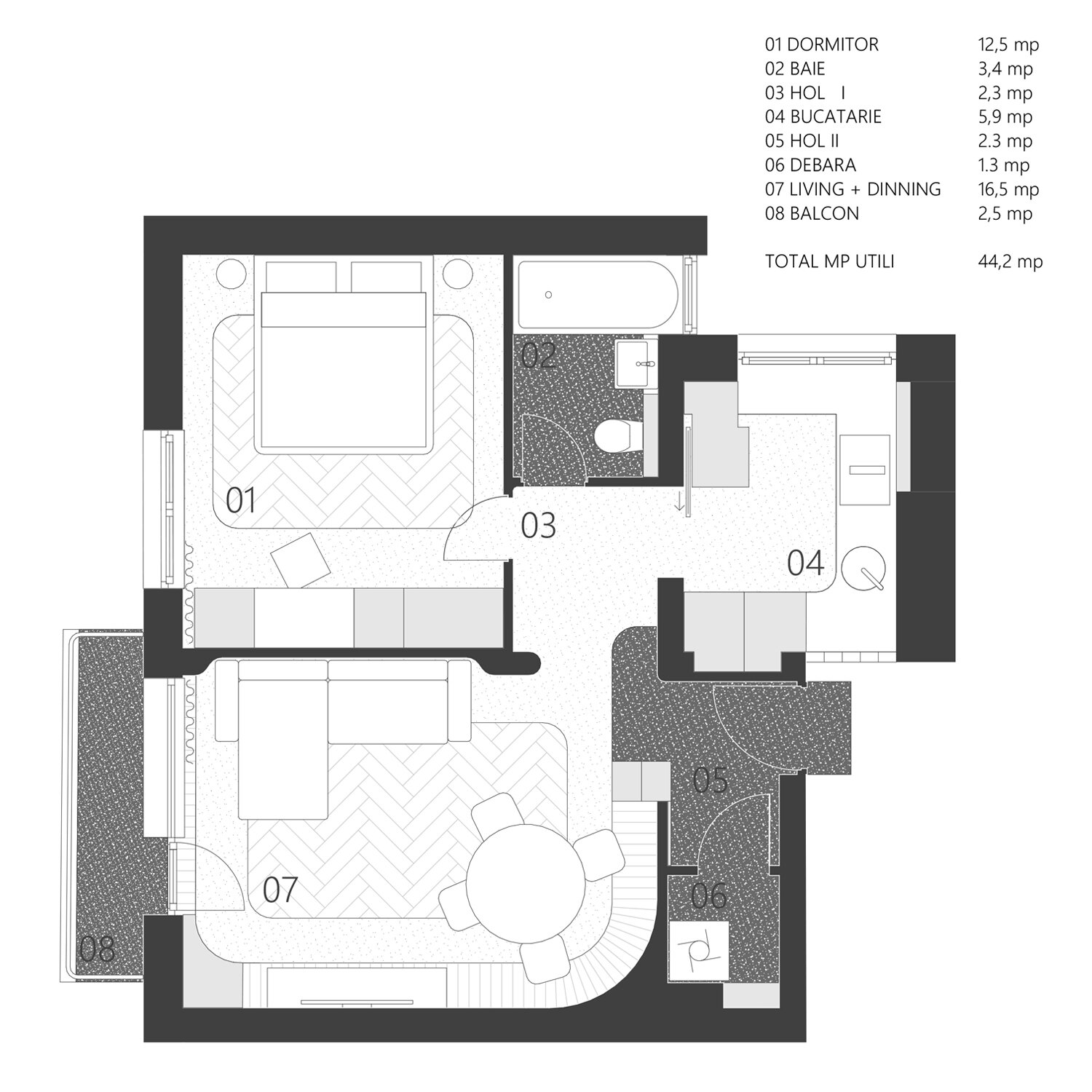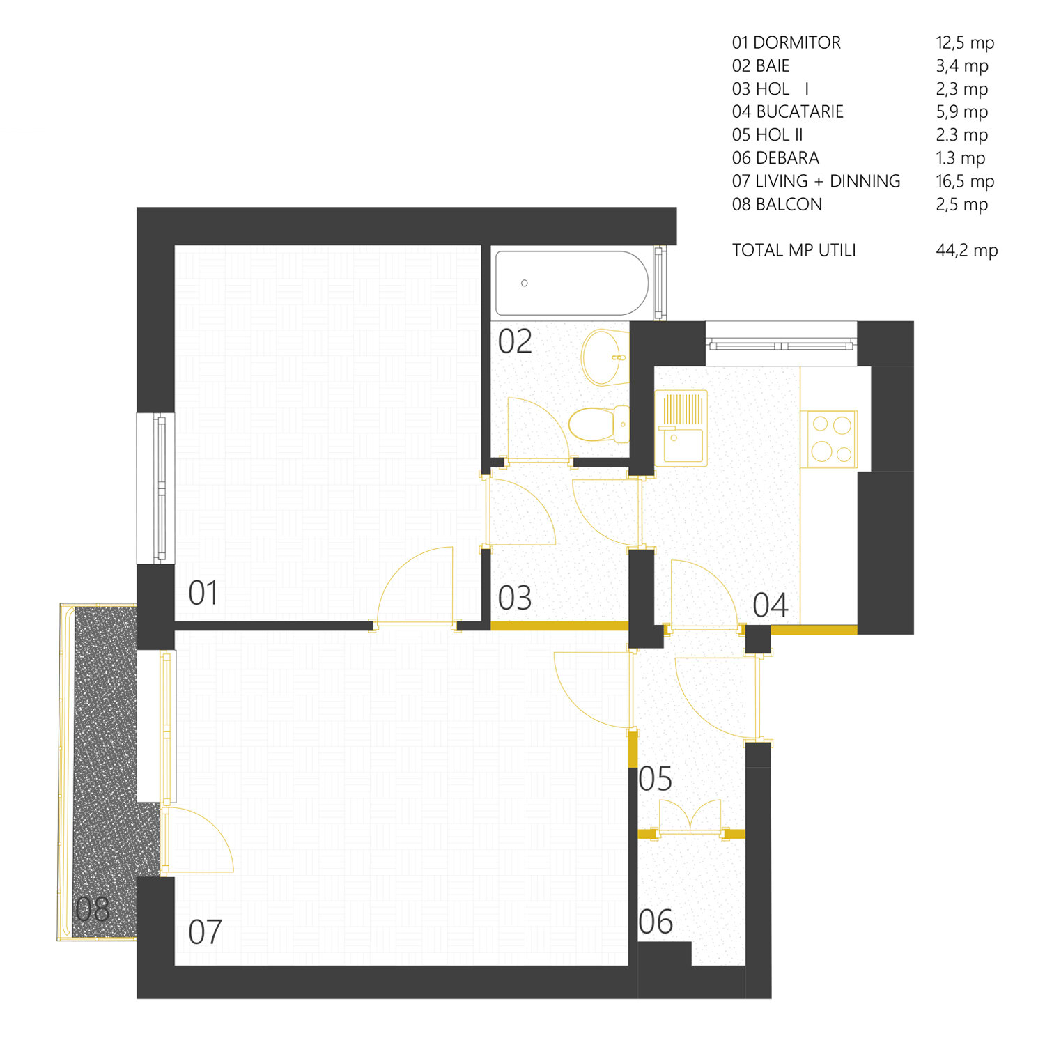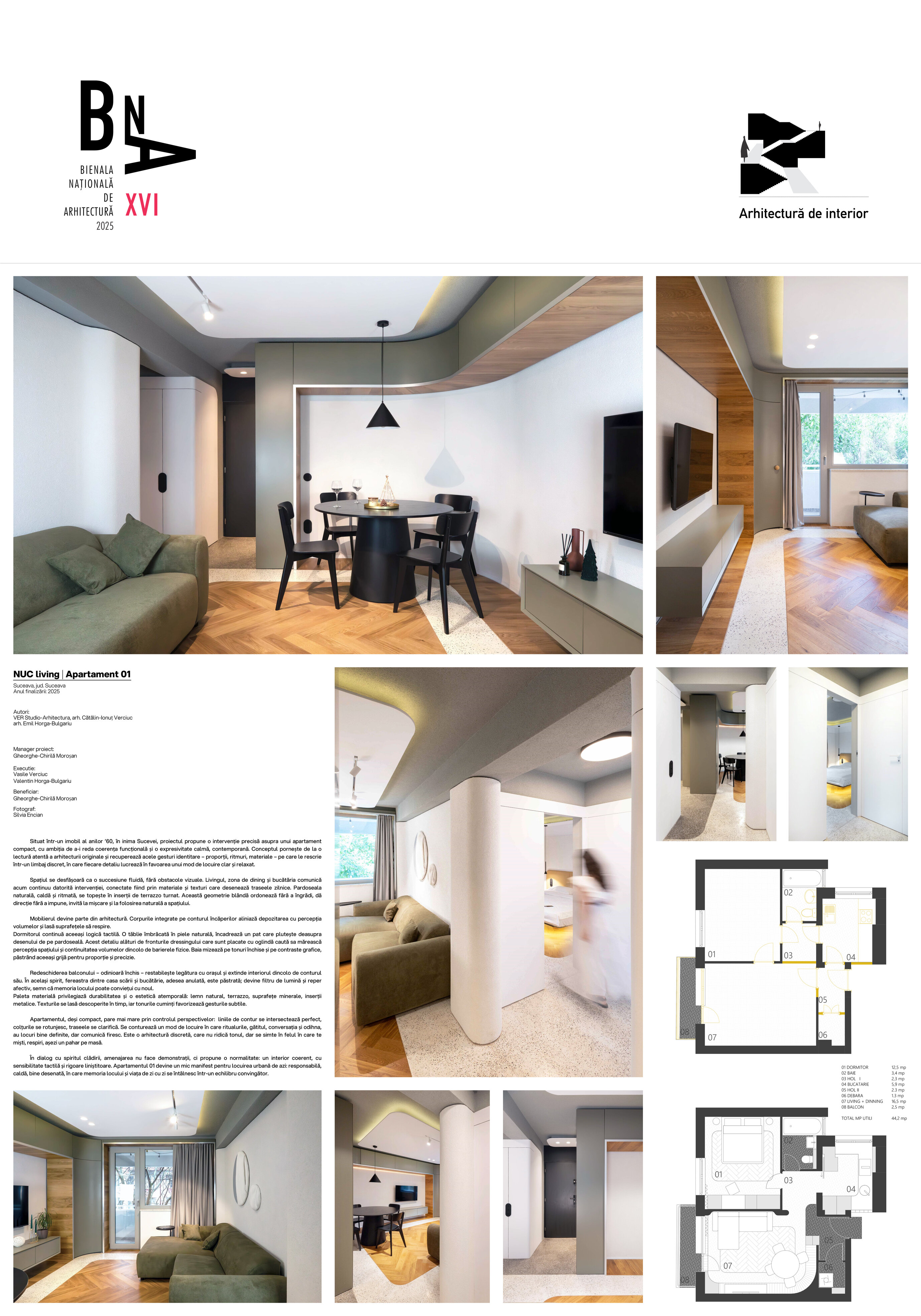 Situat într-un imobil al anilor ’60, în inima Sucevei, proiectul propune o intervenție precisă asupra unui apartament compact, cu ambiția de a-i reda coerența funcțională și o expresivitate calmă, contemporană. Conceptul pornește de la o lectură atentă a arhitecturii originale și recuperează acele gesturi identitare – proporții, ritmuri, materiale – pe care le rescrie într-un limbaj discret, în care fiecare detaliu lucrează în favoarea unui mod de locuire clar și relaxat. Spațiul se desfășoară ca o succesiune fluidă, fără obstacole vizuale. Livingul, zona de dining și bucătăria comunică acum continuu datorită intervenției, conectate fiind prin materiale și texturi care desenează traseele zilnice. Pardoseala naturală, caldă și ritmată, se topește în inserții de terrazzo turnat. Această geometrie blândă ordonează fără a îngrădi, dă direcție fără a impune, invită la mișcare și la folosirea naturală a spațiului. Mobilierul devine parte din arhitectură. Corpurile integrate pe conturul încăperilor aliniază depozitarea cu percepția volumelor și lasă suprafețele să respire. Dormitorul continuă aceeași logică tactilă. O tăblie îmbrăcată în piele naturală, încadrează un pat care plutește deasupra desenului de pe pardoseală. Acest detaliu alături de fronturile dressingului care sunt placate cu oglindă caută sa mărească percepția spațiului și continuitatea volumelor dincolo de barierele fizice. Baia mizează pe tonuri închise și pe contraste grafice, păstrând aceeași grijă pentru proporție și precizie. Redeschiderea balconului – odinioară închis – restabilește legătura cu orașul și extinde interiorul dincolo de conturul său. În același spirit, fereastra dintre casa scării și bucătărie, adesea anulată, este păstrată; devine filtru de lumină și reper afectiv, semn că memoria locului poate conviețui cu noul. Paleta materială privilegiază durabilitatea și o estetică atemporală: lemn natural, terrazzo, suprafețe minerale, inserții metalice. Texturile se lasă descoperite în timp, iar tonurile cuminți favorizează gesturile subtile. Apartamentul, deși compact, pare mai mare prin controlul perspectivelor: liniile de contur se intersectează perfect, colțurile se rotunjesc, traseele se clarifică. Se conturează un mod de locuire în care ritualurile, gătitul, conversația și odihna, au locuri bine definite, dar comunică firesc. Este o arhitectură discretă, care nu ridică tonul, dar se simte în felul în care te miști, respiri, așezi un pahar pe masă. În dialog cu spiritul clădirii, amenajarea nu face demonstrații, ci propune o normalitate: un interior coerent, cu sensibilitate tactilă și rigoare liniștitoare. Apartamentul 01 devine un mic manifest pentru locuirea urbană de azi: responsabilă, caldă, bine desenată, în care memoria locului și viața de zi cu zi se întâlnesc într-un echilibru convingător.