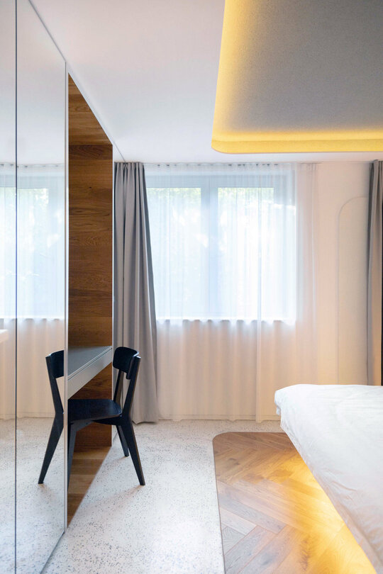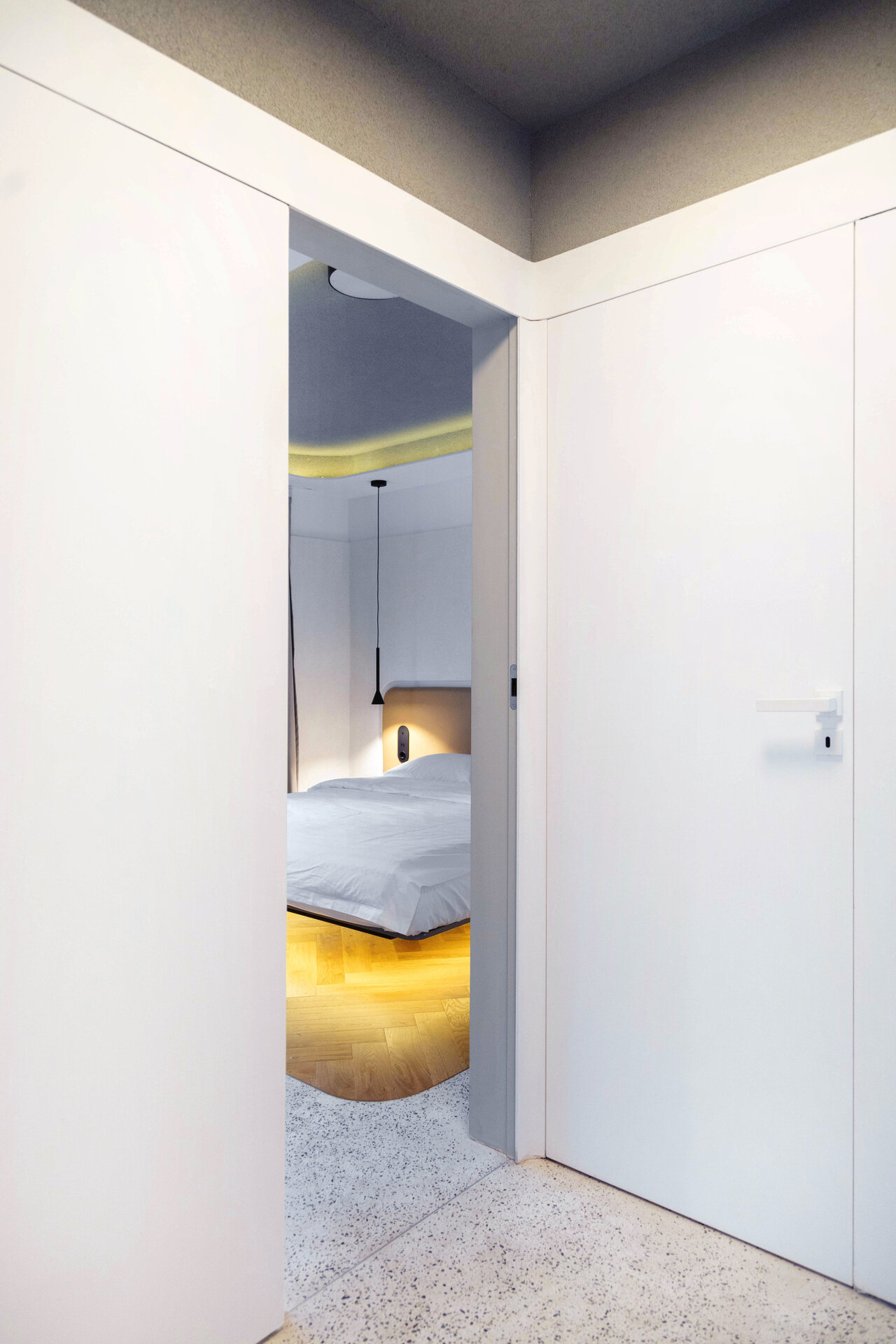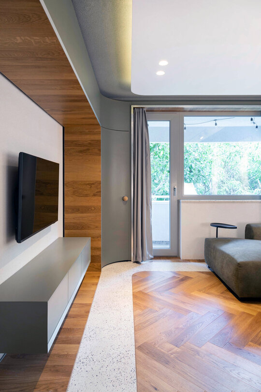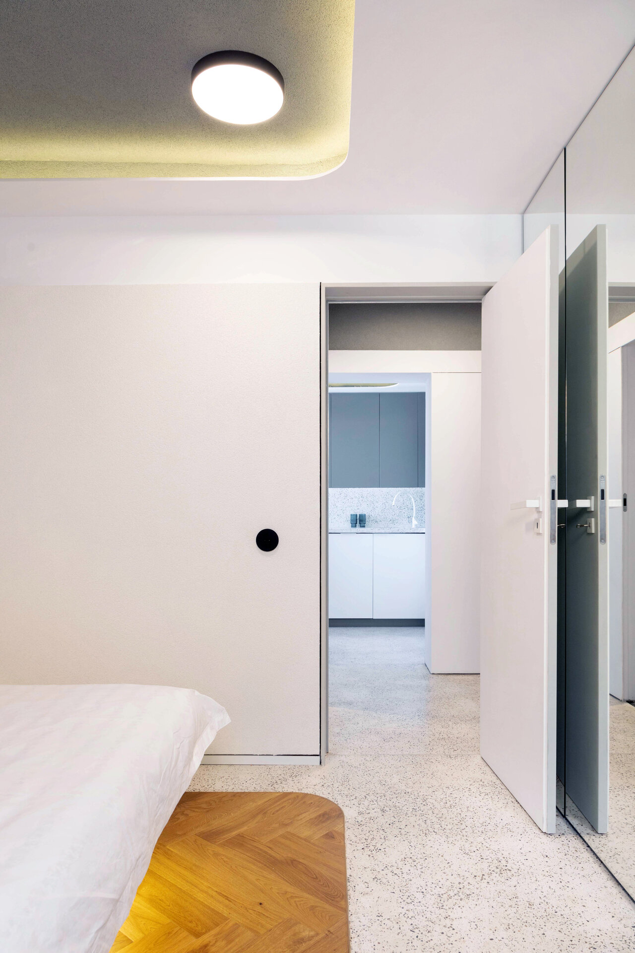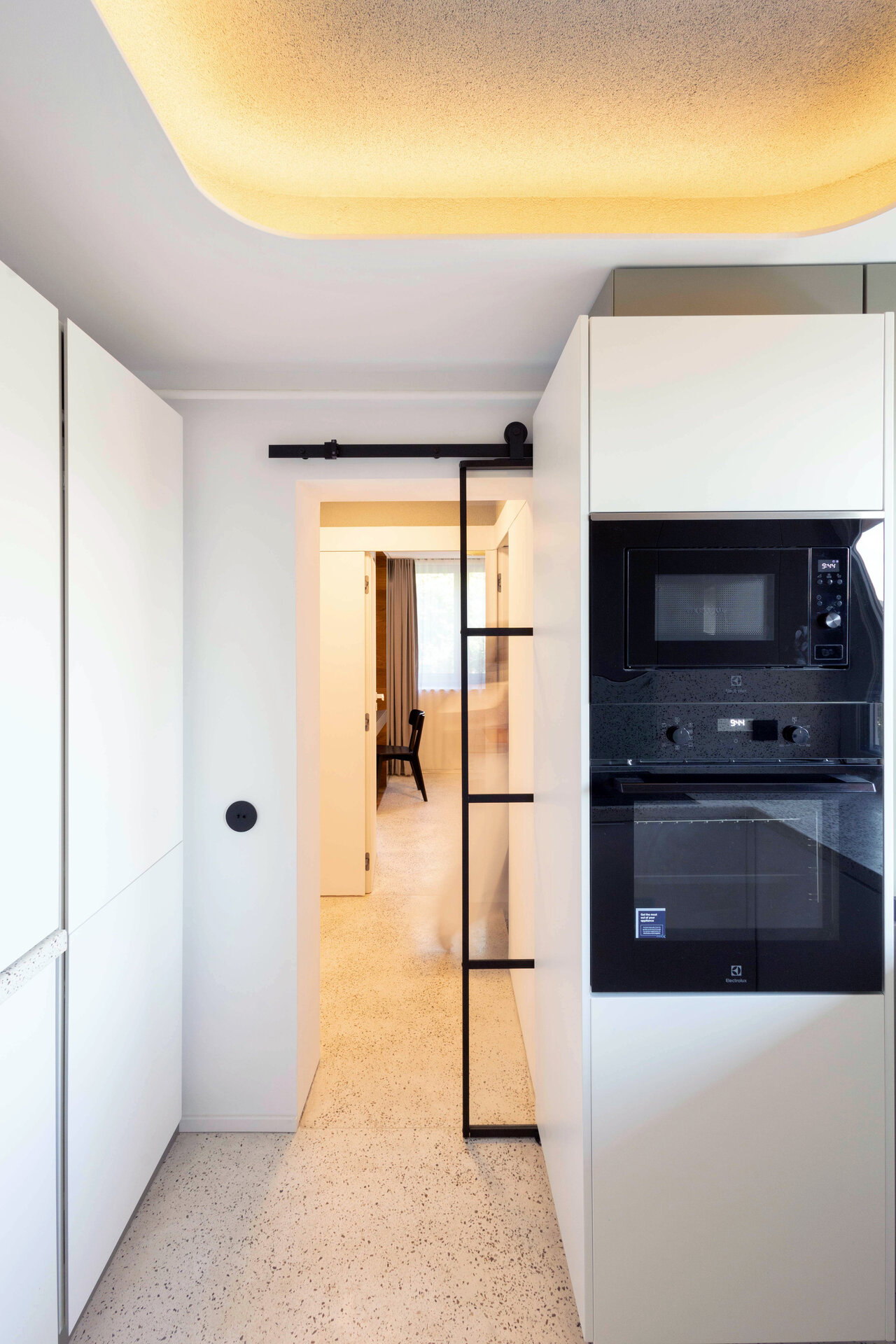 Situat într-un imobil al anilor ’60, în inima Sucevei, proiectul propune o intervenție precisă asupra unui apartament compact, cu ambiția de a-i reda coerența funcțională și o expresivitate calmă, contemporană. Conceptul pornește de la o lectură atentă a arhitecturii originale și recuperează acele gesturi identitare – proporții, ritmuri, materiale – pe care le rescrie într-un limbaj discret, în care fiecare detaliu lucrează în favoarea unui mod de locuire clar și relaxat. Spațiul se desfășoară ca o succesiune fluidă, fără obstacole vizuale. Livingul, zona de dining și bucătăria comunică acum continuu datorită intervenției, conectate fiind prin materiale și texturi care desenează traseele zilnice. Pardoseala naturală, caldă și ritmată, se topește în inserții de terrazzo turnat. Această geometrie blândă ordonează fără a îngrădi, dă direcție fără a impune, invită la mișcare și la folosirea naturală a spațiului. Mobilierul devine parte din arhitectură. Corpurile integrate pe conturul încăperilor aliniază depozitarea cu percepția volumelor și lasă suprafețele să respire. Dormitorul continuă aceeași logică tactilă. O tăblie îmbrăcată în piele naturală, încadrează un pat care plutește deasupra desenului de pe pardoseală. Acest detaliu alături de fronturile dressingului care sunt placate cu oglindă caută sa mărească percepția spațiului și continuitatea volumelor dincolo de barierele fizice. Baia mizează pe tonuri închise și pe contraste grafice, păstrând aceeași grijă pentru proporție și precizie. Redeschiderea balconului – odinioară închis – restabilește legătura cu orașul și extinde interiorul dincolo de conturul său. În același spirit, fereastra dintre casa scării și bucătărie, adesea anulată, este păstrată; devine filtru de lumină și reper afectiv, semn că memoria locului poate conviețui cu noul. Paleta materială privilegiază durabilitatea și o estetică atemporală: lemn natural, terrazzo, suprafețe minerale, inserții metalice. Texturile se lasă descoperite în timp, iar tonurile cuminți favorizează gesturile subtile. Apartamentul, deși compact, pare mai mare prin controlul perspectivelor: liniile de contur se intersectează perfect, colțurile se rotunjesc, traseele se clarifică. Se conturează un mod de locuire în care ritualurile, gătitul, conversația și odihna, au locuri bine definite, dar comunică firesc. Este o arhitectură discretă, care nu ridică tonul, dar se simte în felul în care te miști, respiri, așezi un pahar pe masă. În dialog cu spiritul clădirii, amenajarea nu face demonstrații, ci propune o normalitate: un interior coerent, cu sensibilitate tactilă și rigoare liniștitoare. Apartamentul 01 devine un mic manifest pentru locuirea urbană de azi: responsabilă, caldă, bine desenată, în care memoria locului și viața de zi cu zi se întâlnesc într-un echilibru convingător.