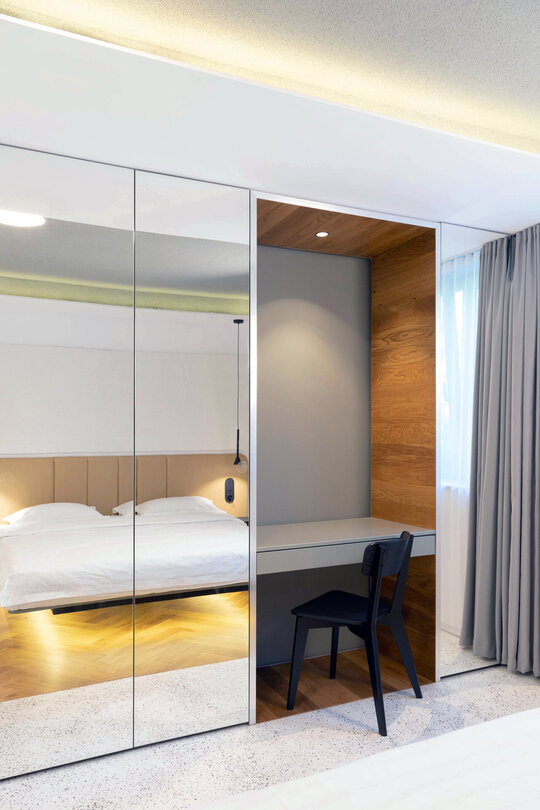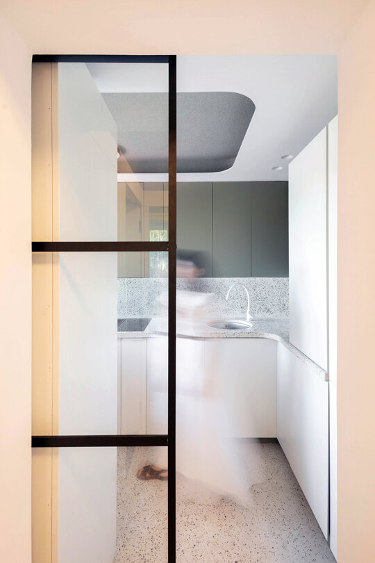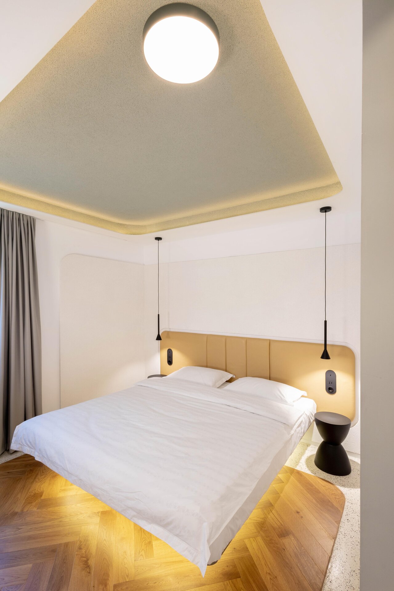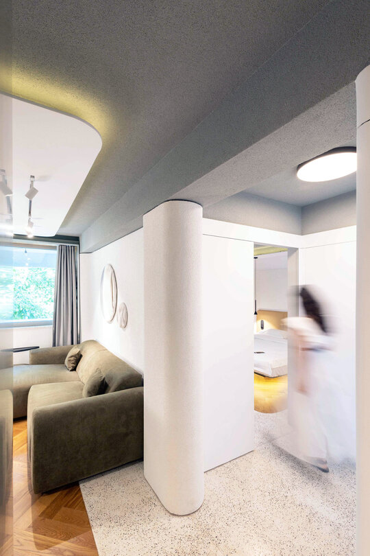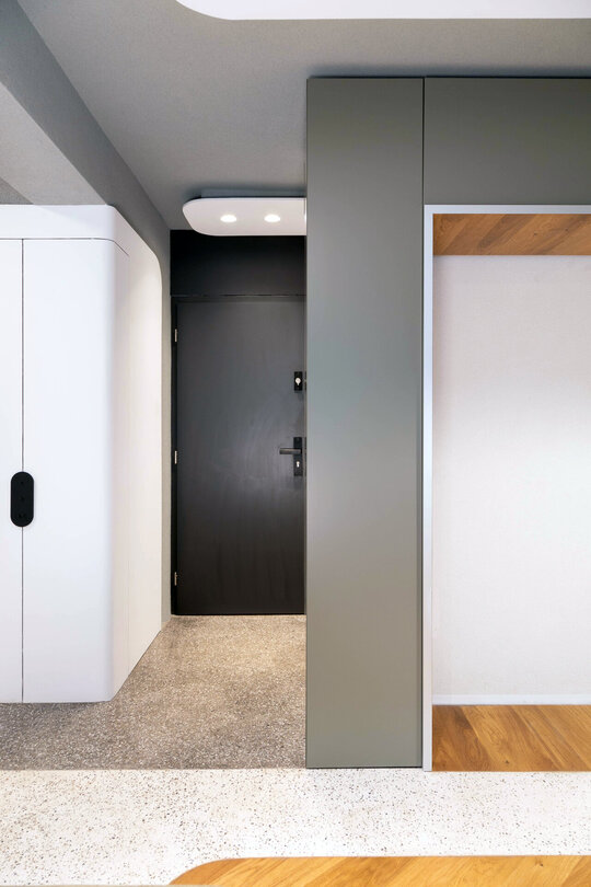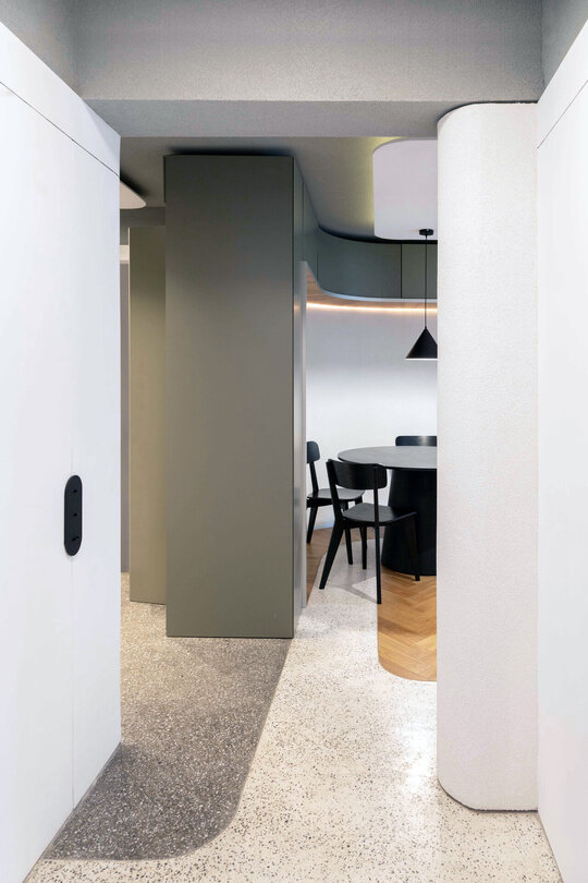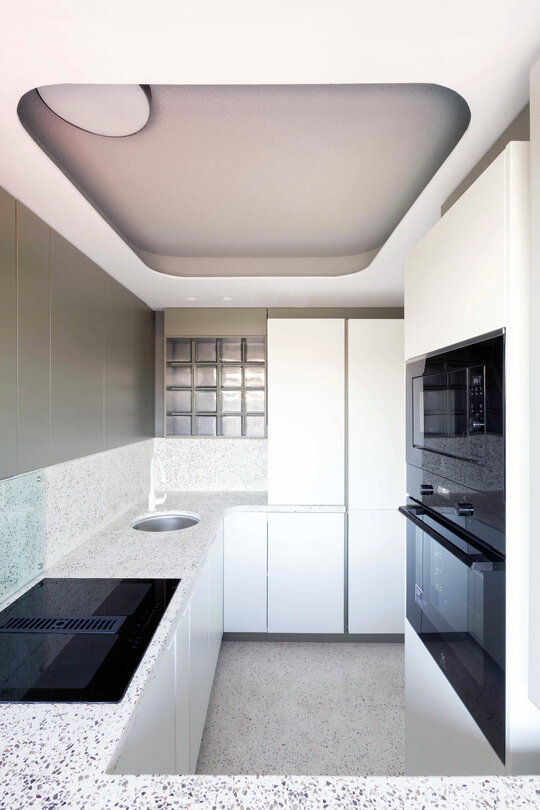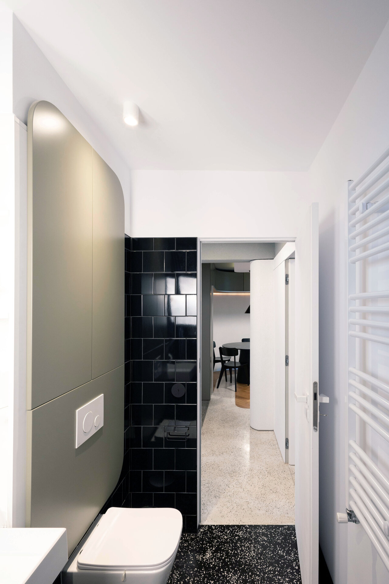 Situat într-un imobil al anilor ’60, în inima Sucevei, proiectul propune o intervenție precisă asupra unui apartament compact, cu ambiția de a-i reda coerența funcțională și o expresivitate calmă, contemporană. Conceptul pornește de la o lectură atentă a arhitecturii originale și recuperează acele gesturi identitare – proporții, ritmuri, materiale – pe care le rescrie într-un limbaj discret, în care fiecare detaliu lucrează în favoarea unui mod de locuire clar și relaxat. Spațiul se desfășoară ca o succesiune fluidă, fără obstacole vizuale. Livingul, zona de dining și bucătăria comunică acum continuu datorită intervenției, conectate fiind prin materiale și texturi care desenează traseele zilnice. Pardoseala naturală, caldă și ritmată, se topește în inserții de terrazzo turnat. Această geometrie blândă ordonează fără a îngrădi, dă direcție fără a impune, invită la mișcare și la folosirea naturală a spațiului. Mobilierul devine parte din arhitectură. Corpurile integrate pe conturul încăperilor aliniază depozitarea cu percepția volumelor și lasă suprafețele să respire. Dormitorul continuă aceeași logică tactilă. O tăblie îmbrăcată în piele naturală, încadrează un pat care plutește deasupra desenului de pe pardoseală. Acest detaliu alături de fronturile dressingului care sunt placate cu oglindă caută sa mărească percepția spațiului și continuitatea volumelor dincolo de barierele fizice. Baia mizează pe tonuri închise și pe contraste grafice, păstrând aceeași grijă pentru proporție și precizie. Redeschiderea balconului – odinioară închis – restabilește legătura cu orașul și extinde interiorul dincolo de conturul său. În același spirit, fereastra dintre casa scării și bucătărie, adesea anulată, este păstrată; devine filtru de lumină și reper afectiv, semn că memoria locului poate conviețui cu noul. Paleta materială privilegiază durabilitatea și o estetică atemporală: lemn natural, terrazzo, suprafețe minerale, inserții metalice. Texturile se lasă descoperite în timp, iar tonurile cuminți favorizează gesturile subtile. Apartamentul, deși compact, pare mai mare prin controlul perspectivelor: liniile de contur se intersectează perfect, colțurile se rotunjesc, traseele se clarifică. Se conturează un mod de locuire în care ritualurile, gătitul, conversația și odihna, au locuri bine definite, dar comunică firesc. Este o arhitectură discretă, care nu ridică tonul, dar se simte în felul în care te miști, respiri, așezi un pahar pe masă. În dialog cu spiritul clădirii, amenajarea nu face demonstrații, ci propune o normalitate: un interior coerent, cu sensibilitate tactilă și rigoare liniștitoare. Apartamentul 01 devine un mic manifest pentru locuirea urbană de azi: responsabilă, caldă, bine desenată, în care memoria locului și viața de zi cu zi se întâlnesc într-un echilibru convingător.