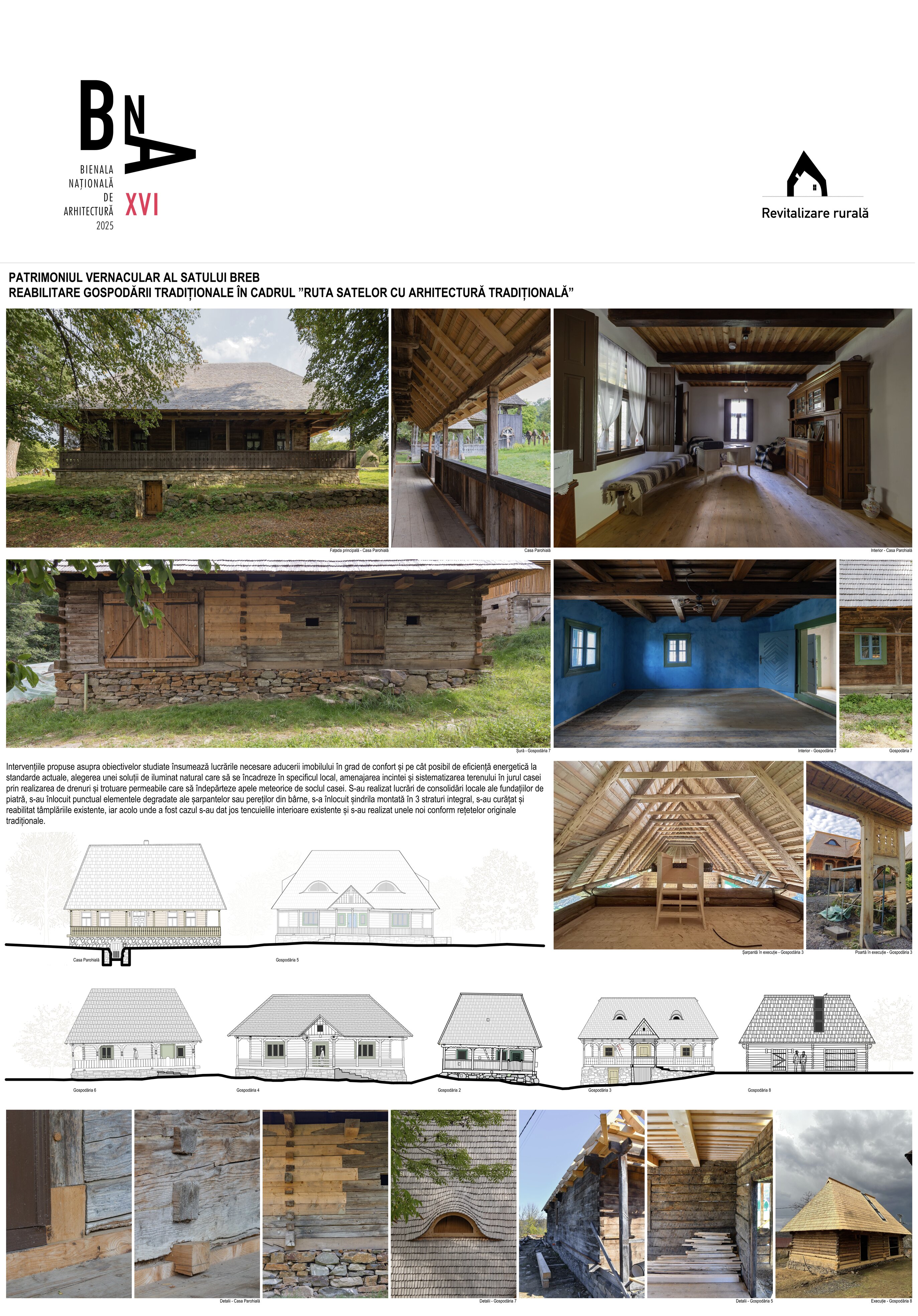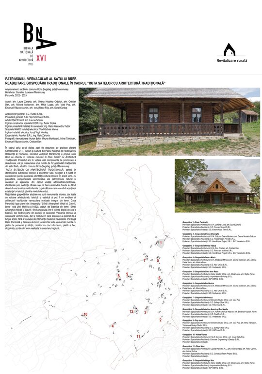 În cadrul celui de-al doilea apel de depunere de proiecte aferent Componentei C11 - Turism și Cultură din Planul Național de Redresare și Reziliență al României, Consiliul Județean Maramureș a propus satul Breb ca obiectiv în vederea includeii în Ruta Satelor cu Arhitectură Tradițională. Proiectul are în vedere atât componenta de promovare a obiectivului, cât și restaurarea unui număr de 12 gospodării tradiționale din satul Breb, situat în comuna Ocna-Șugatag, județul Maramureș. ”RUTA SATELOR CU ARHITECTURĂ TRADIȚIONALĂ” constă în identificarea substanței istorice a așezărilor sale, necesar a fi luată în considerare pentru păstrarea identității cultural-istorice. În acest sens, cu precădere, componentele semnificative ale patrimoniului natural și construit al așezărilor din cadrul unității administrativ-teritoriale, identificate prin evidenţe oficiale sau pe baza observării directe au făcut obiectul unei analize multicriteriale cuprinzătoare care a urmărit apariţia şi existenţa lor istorică până la nivelul de astăzi. Majoritatea gospodăriilor studiate nu sunt monumente istorice, dar toate au valoare arhitecturală, istorică și estetică și pot fi un emblem al arhitecturii tradiționale vernaculare realizate integral din lemn. Casa Parohială face parte din Ansamblul “Sfinții Arhangheli Mihail și Gavril”, Breb– cod LMI MM-II-a-A-04529, alături de Biserica de lemn “Sfinții Arhangheli Mihail și Gavril”, fiind amplasată într-o incintă alipită de cea a bisericii, dar făcând parte din același lot cadastral. Valoarea istorică se datorează vechimii sale, dar și modului în care aceasta s-a păstrat de-a lungul anilor, fără a fi nevoie de intervenții moderne ireversibile. Pe lângă Casa Parohială și Biserica de lemn, ansamblul este alcătuit din incinta cu pietre de pomeniri și sfințiri, cimitirul cu cruci din lemn, piatră și fier, clopotniță, porțile din lemn realizate în caracterul regiunii. Intervențiile propuse asupra obiectivelor studiate însumează lucrările necesare aducerii imobilului în grad de confort și pe cât posibil de eficiență energetică la standarde actuale, alegerea unei soluții de iluminat natural care să se încadreze în specificul local, amenajarea incintei și sistematizarea terenului în jurul casei prin realizarea de drenuri și trotuare permeabile care să îndepărteze apele meteorice de soclul casei. S-au realizat lucrări de consolidări locale ale fundațiilor de piatră, s-au înlocuit punctual elemente degradate ale șarpantelor sau pereților din bârne de lemn, s-a înlocuit șindrila montată în 3 straturi integral, s-au curățat și reabilitat tâmplăriile existente, iar acolo unde a fost cazul s-au dat jos tencuielile interioare existente și s-au realizat unele noi conform rețetelor originale tradiționale.