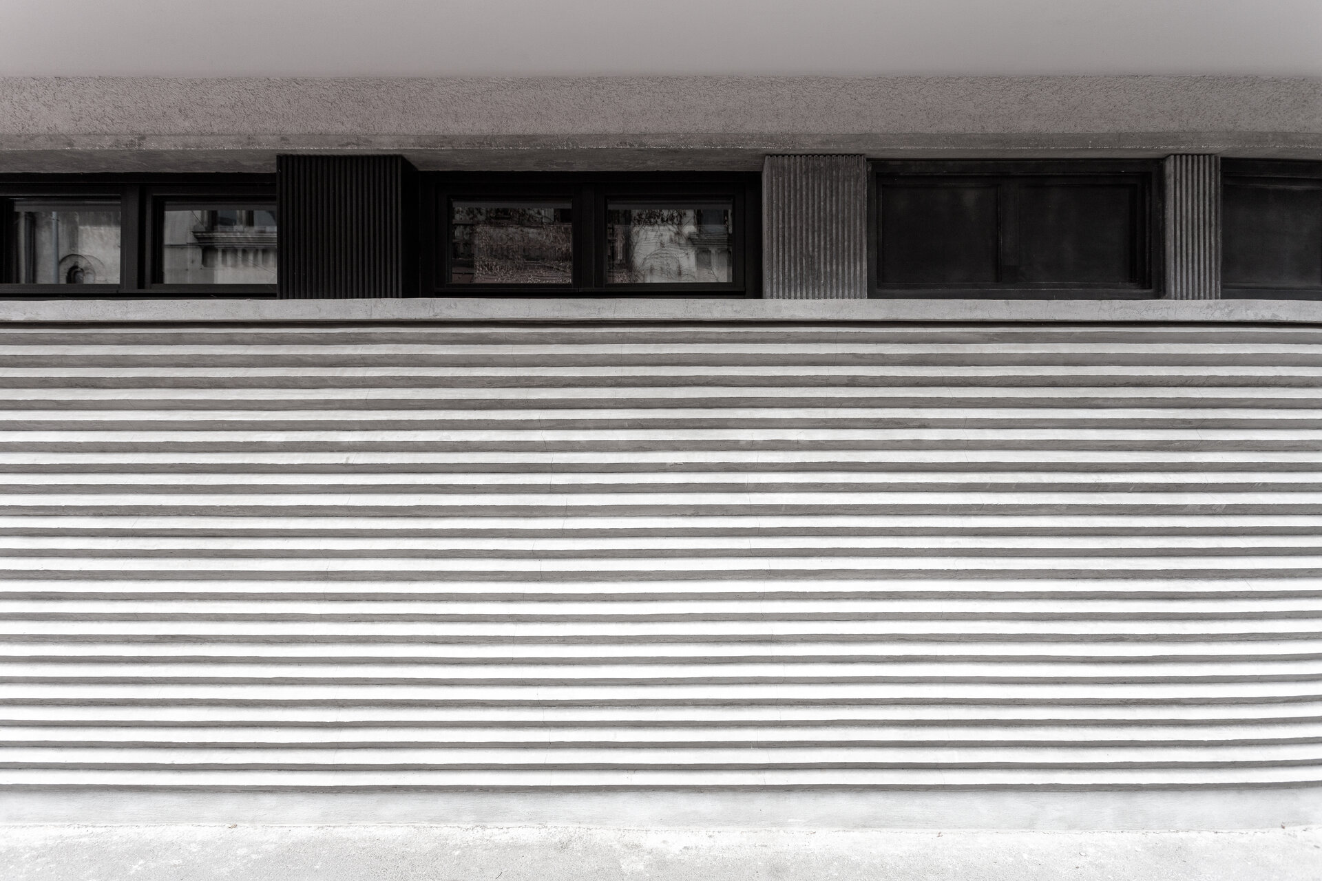 Intervenția propusă, realizată după consolidarea structurală deja finalizată, s-a concentrat pe realizarea elementelor volumetrice și de fațadă omise din proiectul inițial desenat de Sady Herivan, readucând astfel casa la coerența și eleganța concepției originale. Cel mai vizibil element reintrodus a fost fereastra de tip bandou de pe fațada Iustinian, care subliniază volumetria balconului de la etajul întâi. Aceasta a fost prevăzută deasupra unui soclu înalt, de-asemenea nerealizat în momentul construcției, format din linii orizontale clare, tipice limbajului art deco al epocii. Din motive structurale, golul bandoului nu a putut fi realizat în întregime, însă proiectul a propus o soluție de tip intarsie: în zonele unde nu se putea decupa fațada, s-au creat panouri de basso-relief din beton aparent, pigmentat negru, care reproduc ritmul golurilor și al montanților.