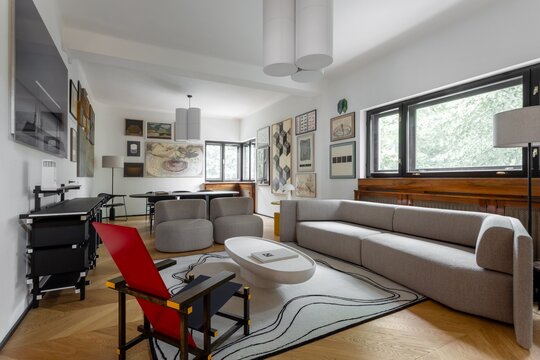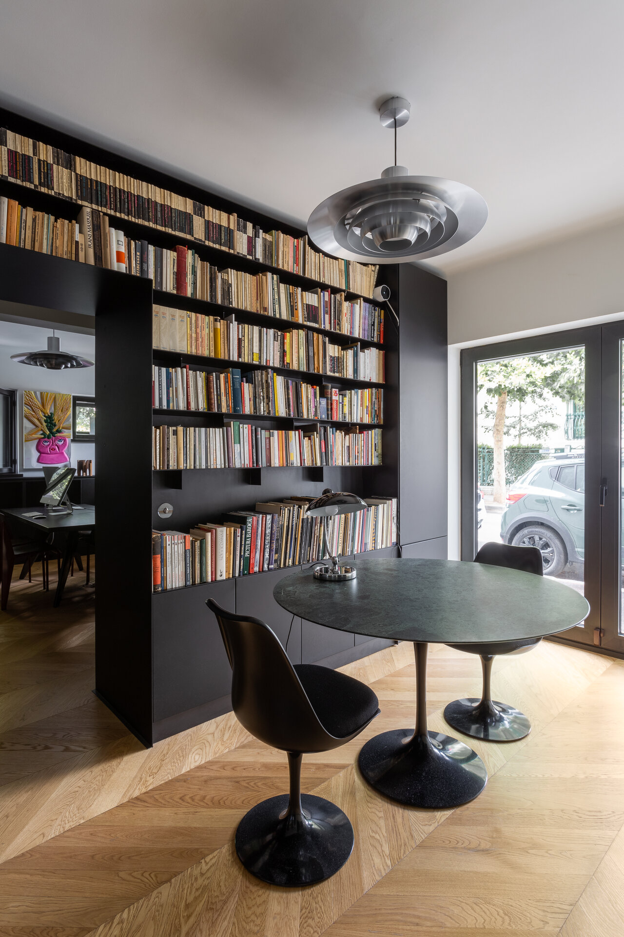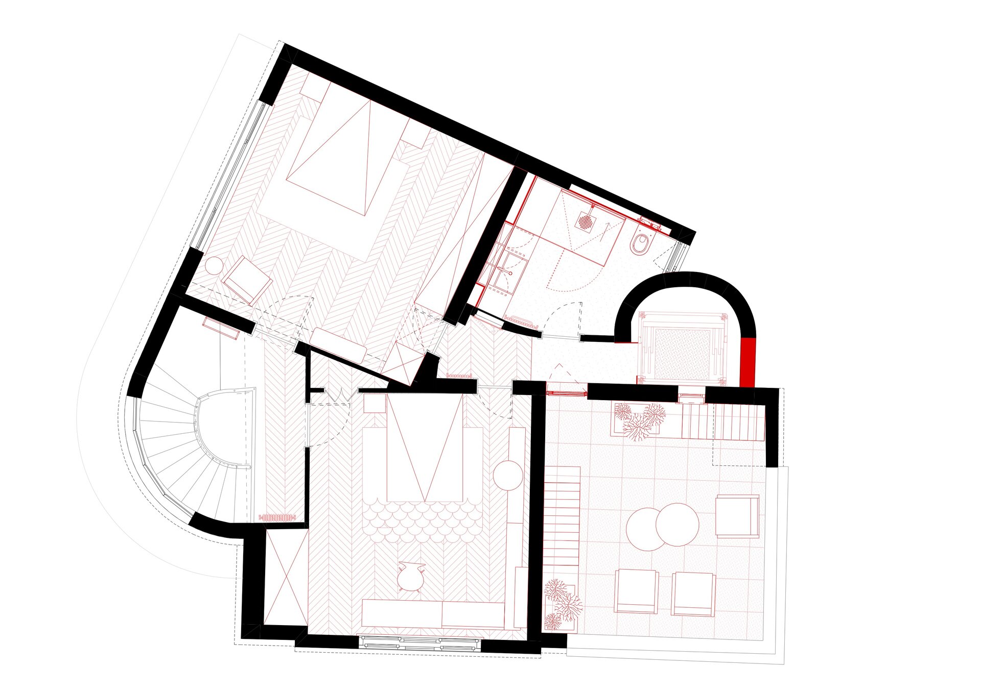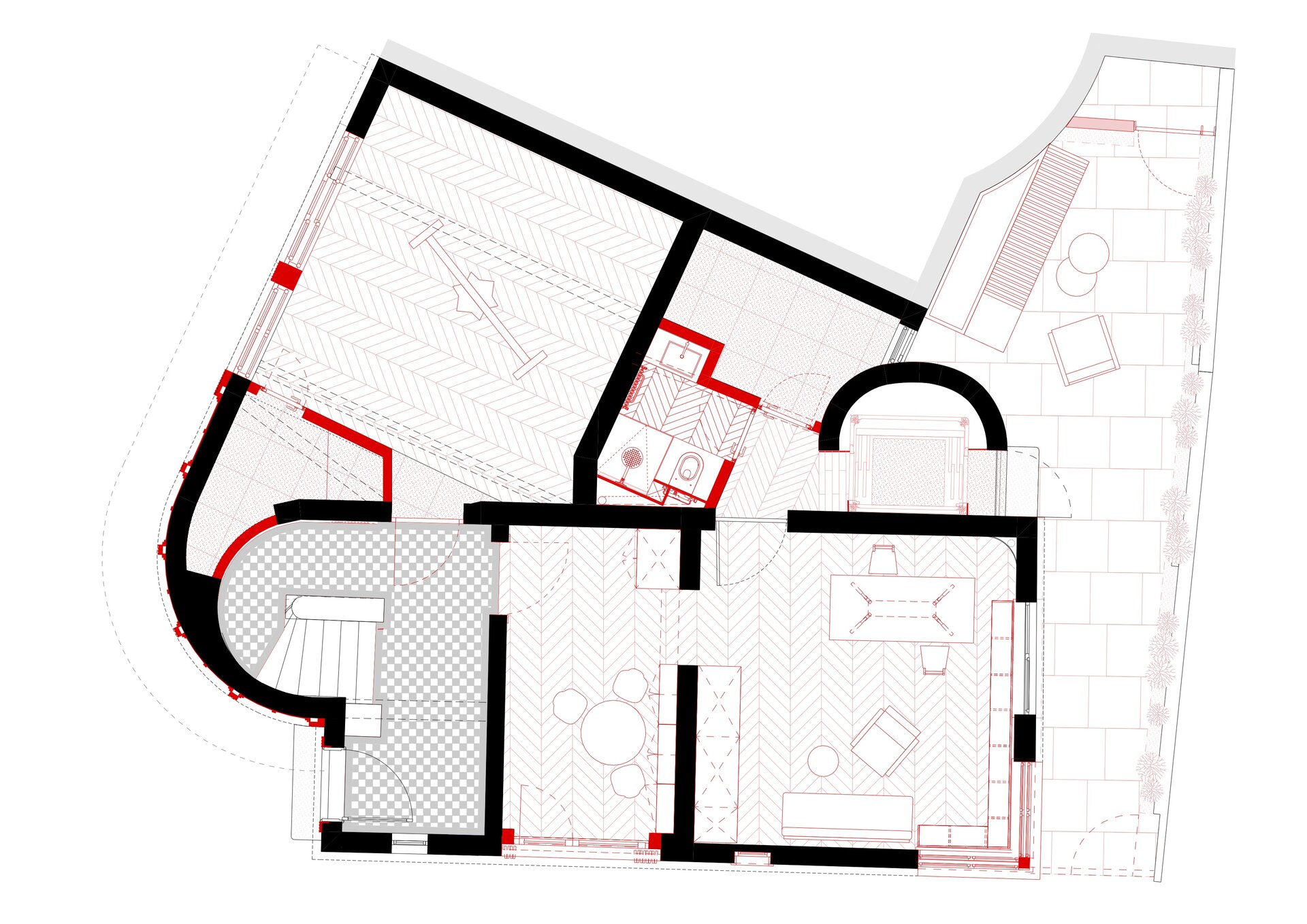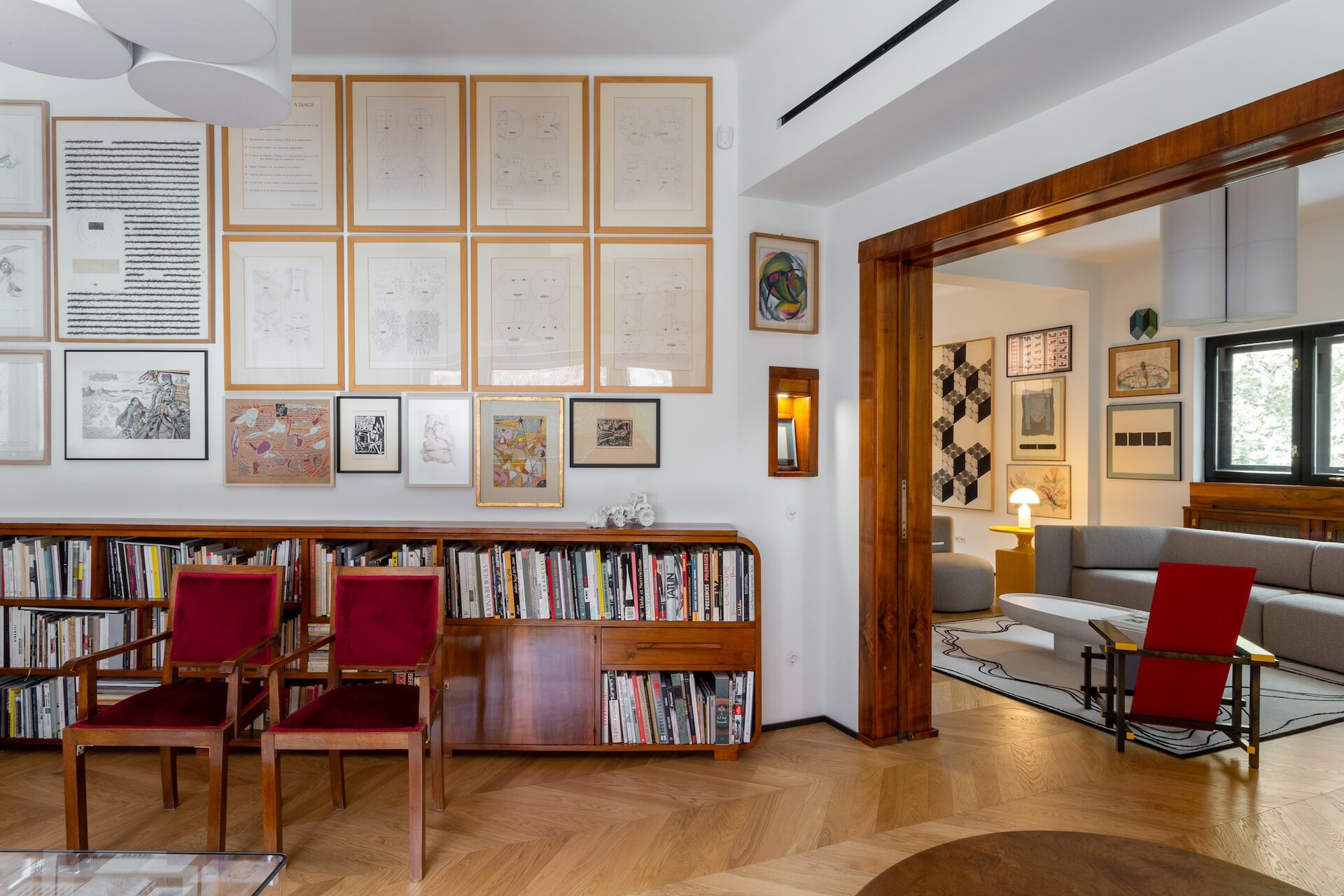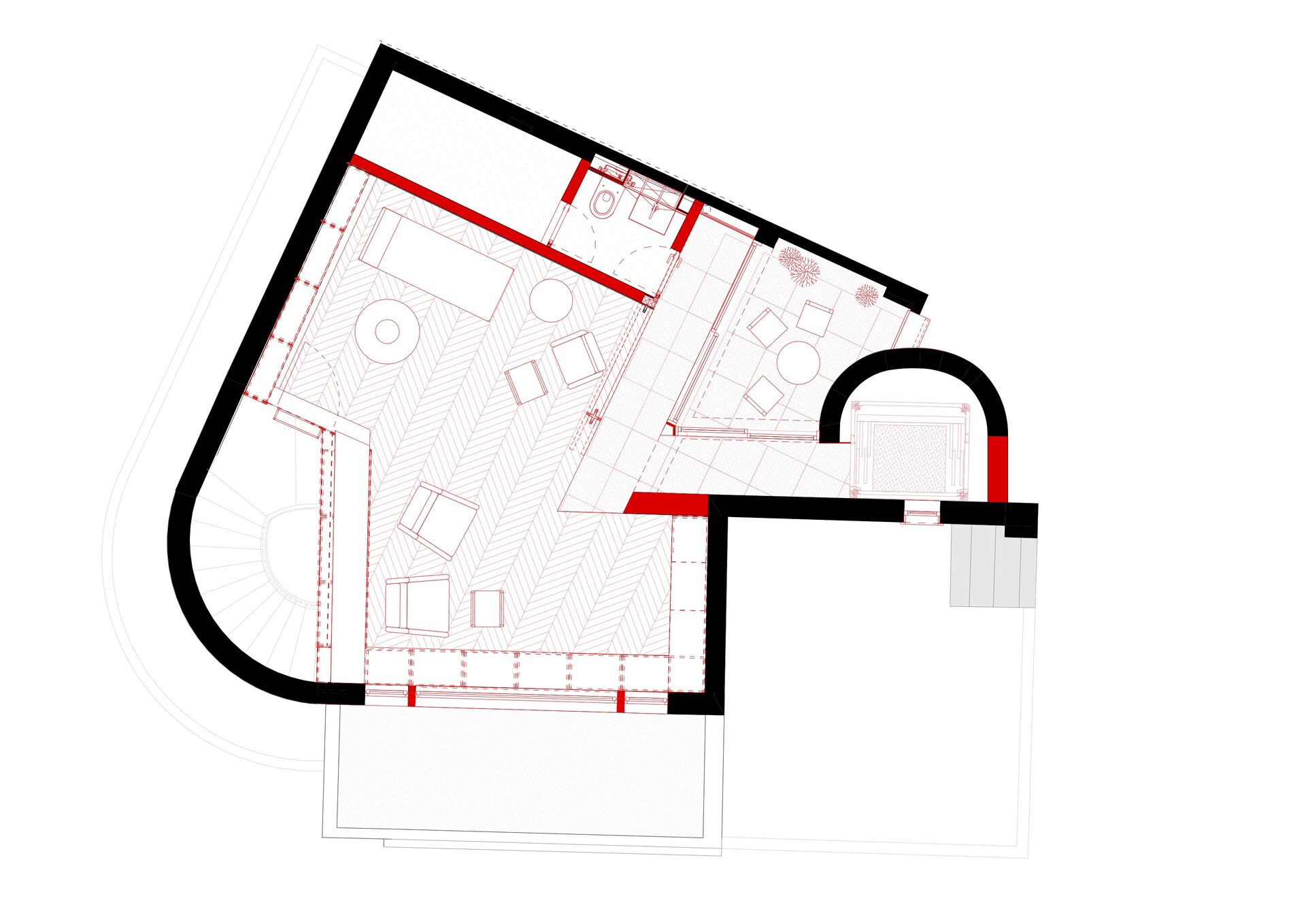 Din punct de vedere funcțional, proiectul a urmărit să creeze o relație flexibilă între viața privată și dimensiunea semi-publică a casei. Parterul găzduiește acum o mică galerie de artă, atelierul și biroul amenajat în fostul garaj, spații care pot fi deschise vizitatorilor cu ocazia unor expoziții sau evenimente. Etajul întâi a fost gândit ca o zonă de zi extinsă, cu un al doilea birou, o bucătărie și spații de întâlnire, destinate atât proprietarului, cât și curatorilor, artiștilor sau colecționarilor invitați. Etajul al doilea și mansarda păstrează caracterul intim și privat, fiind dedicate vieții de familie: dormitoare și un living personal. Podul a fost transformat într-un spațiu luminos și aerisit, prin deschiderea unei curți interioare de lumină și prin întreruperea parțială a planșeului, care creează o legătură vizuală directă cu scara principală.