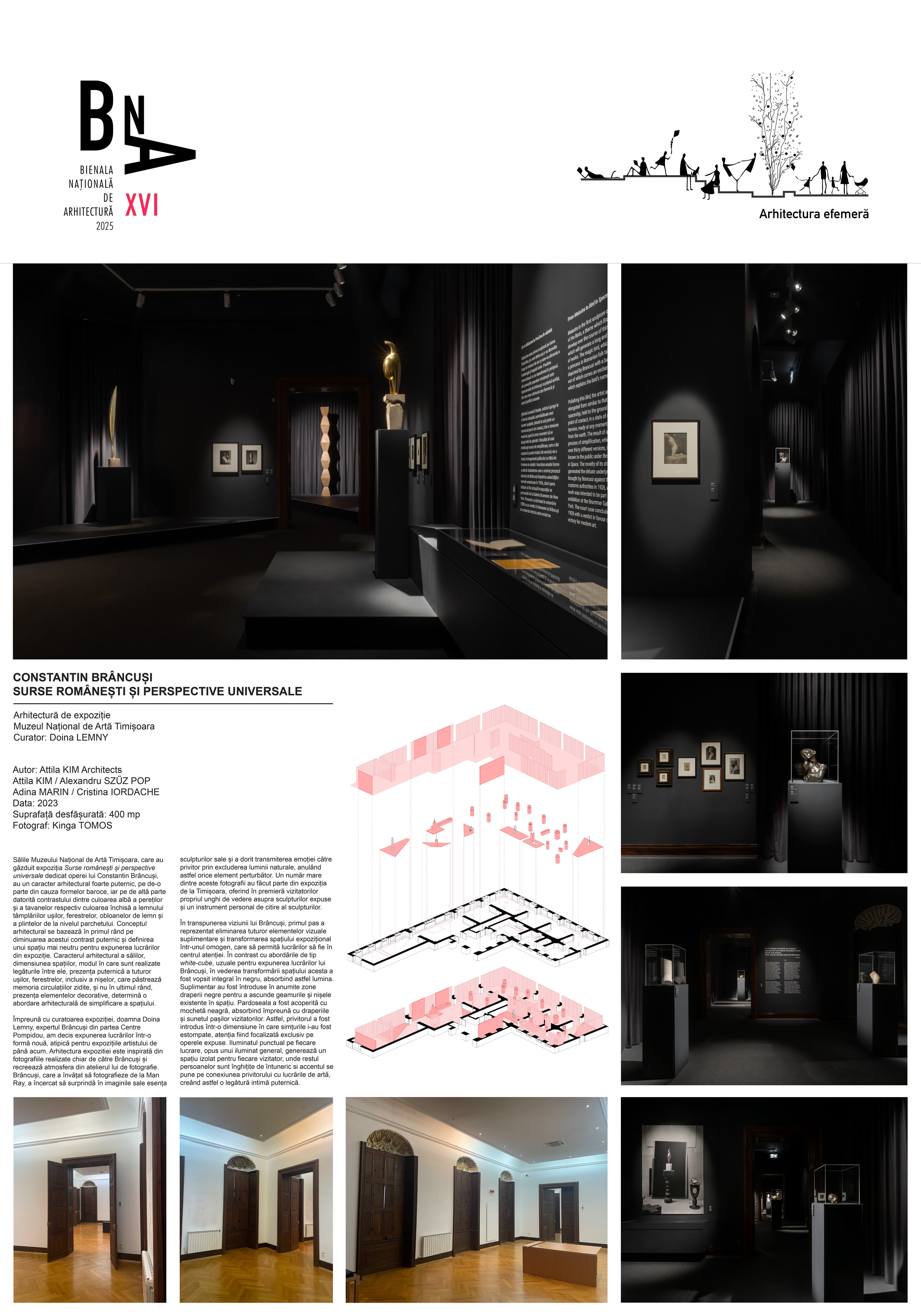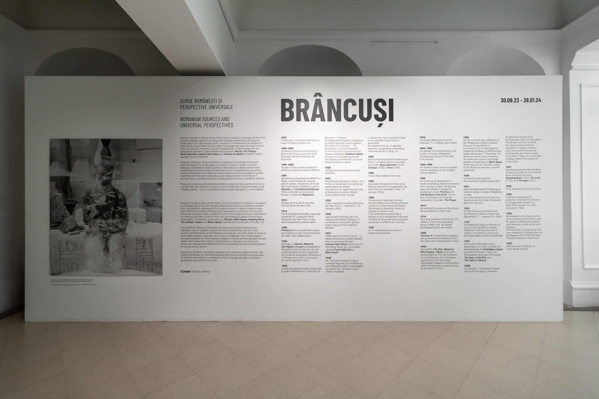 Clădirea Muzeului Național de Artă Timișoara, fostul palat episcopal catolic construit în secolul al 18-lea, care au găzduit expoziția Surse românești și perspective universale dedicată operei lui Constantin Brâncuși, reprezintă un cadru cu o identitate arhitecturală extrem de puternică. Caracterul sălilor este definit, pe de o parte, de proporțiile și ornamentica barocă, iar pe de altă parte, de contrastul intens dintre albul pereților și al tavanelor și tonurile închise ale tâmplăriilor de lemn, ale ușilor, ferestrelor, obloanelor și plintelor de la nivelul pardoselii. Această tensiune vizuală între suprafețele luminoase și cele întunecate creează un spațiu marcat de teatralitate, care poate deveni, în context expozițional, un obstacol în calea unei receptări calme și concentrate a operelor expuse.