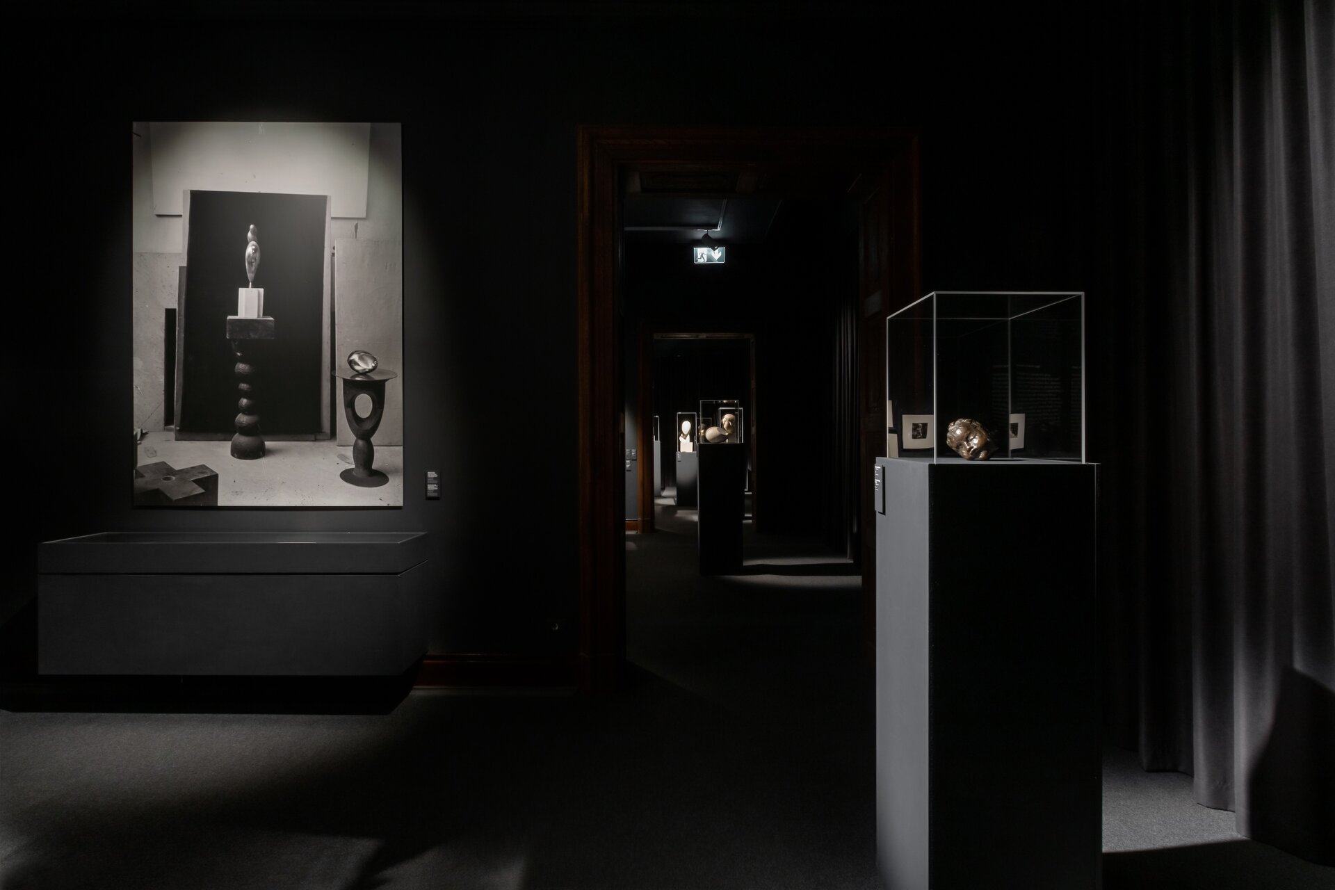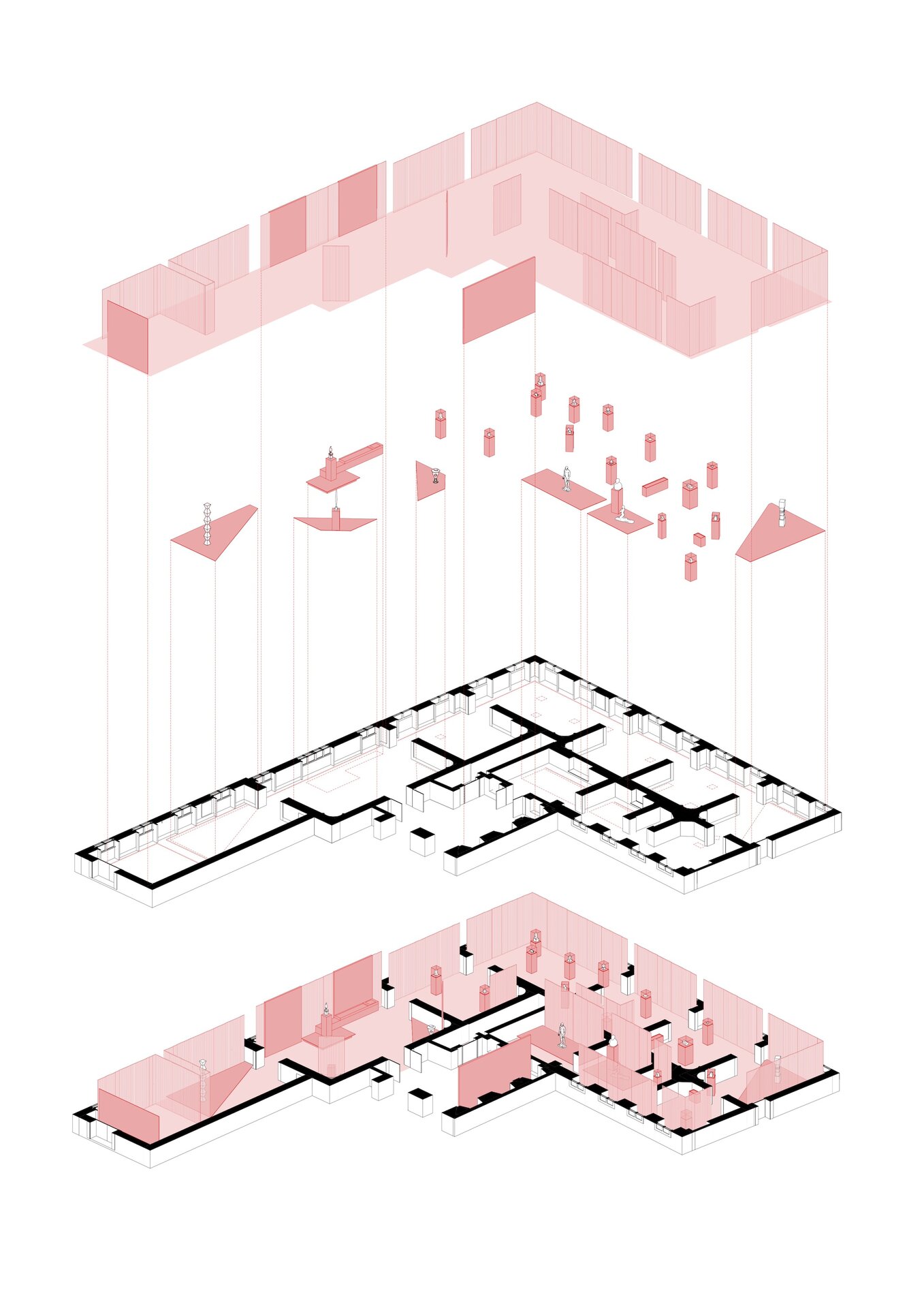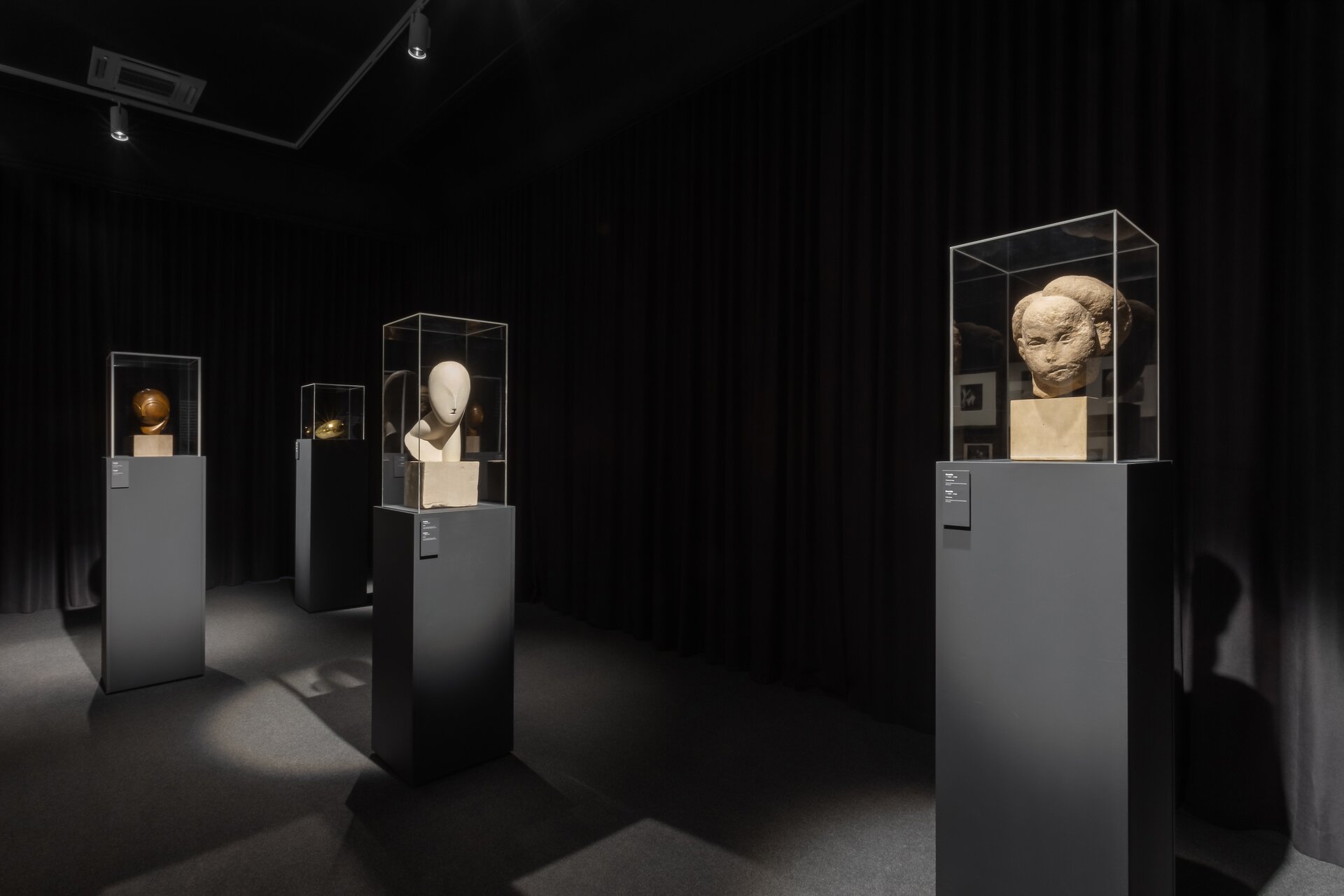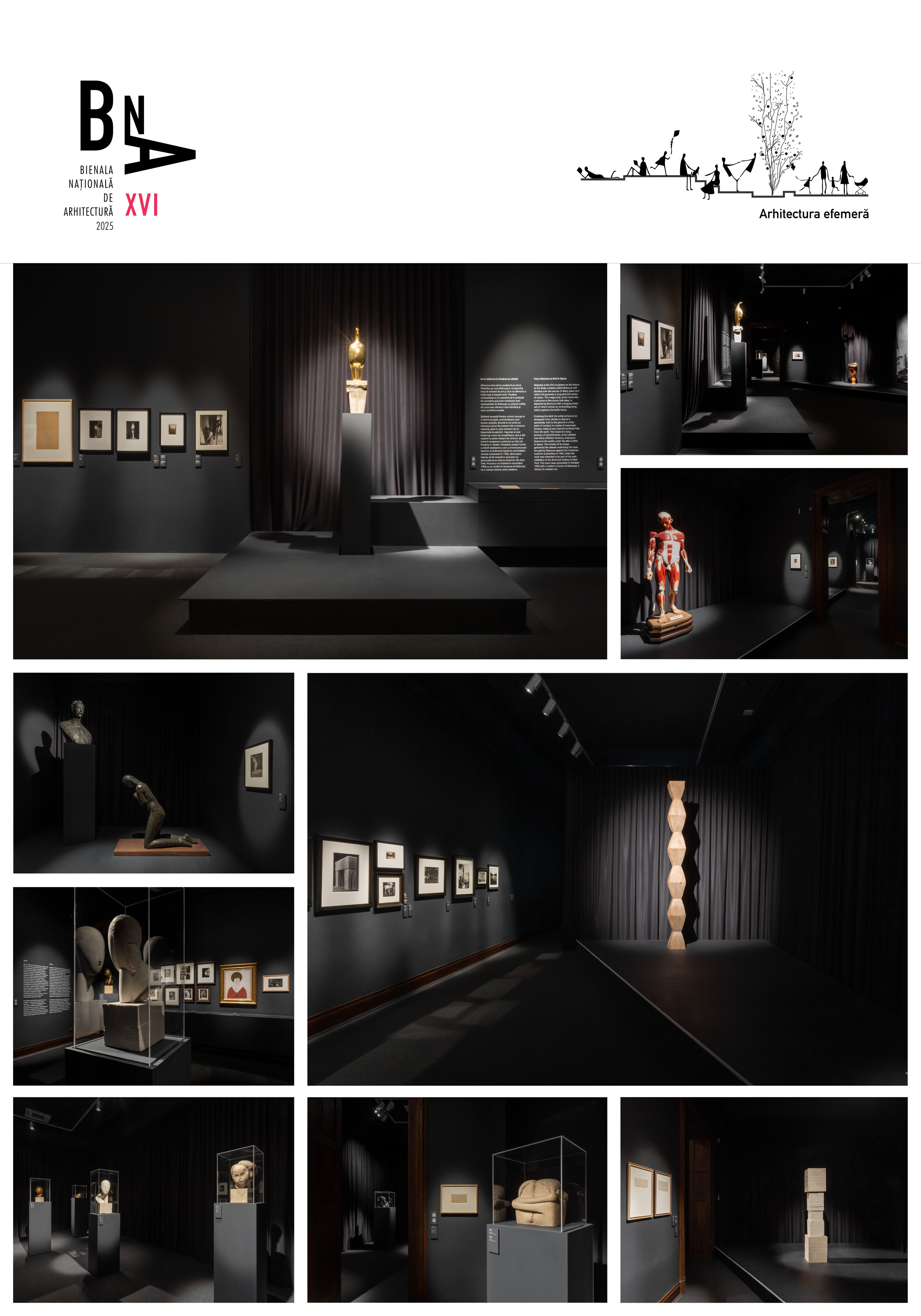 Pentru a transpune această viziune, primul pas a fost eliminarea tuturor elementelor vizuale secundare și transformarea sălilor într-un spațiu omogen, în care prezența arhitecturii existente să fie estompată. Spre deosebire de tradiționalul white cube, care oferă neutralitate prin albul pereților, aici s-a optat pentru o soluție radical diferită: vopsirea integrală a spațiului în negru. Această opțiune a absorbit lumina, a șters diferențele dintre suprafețe și a redus la minimum interferențele vizuale, construind un fundal compact, unificat.