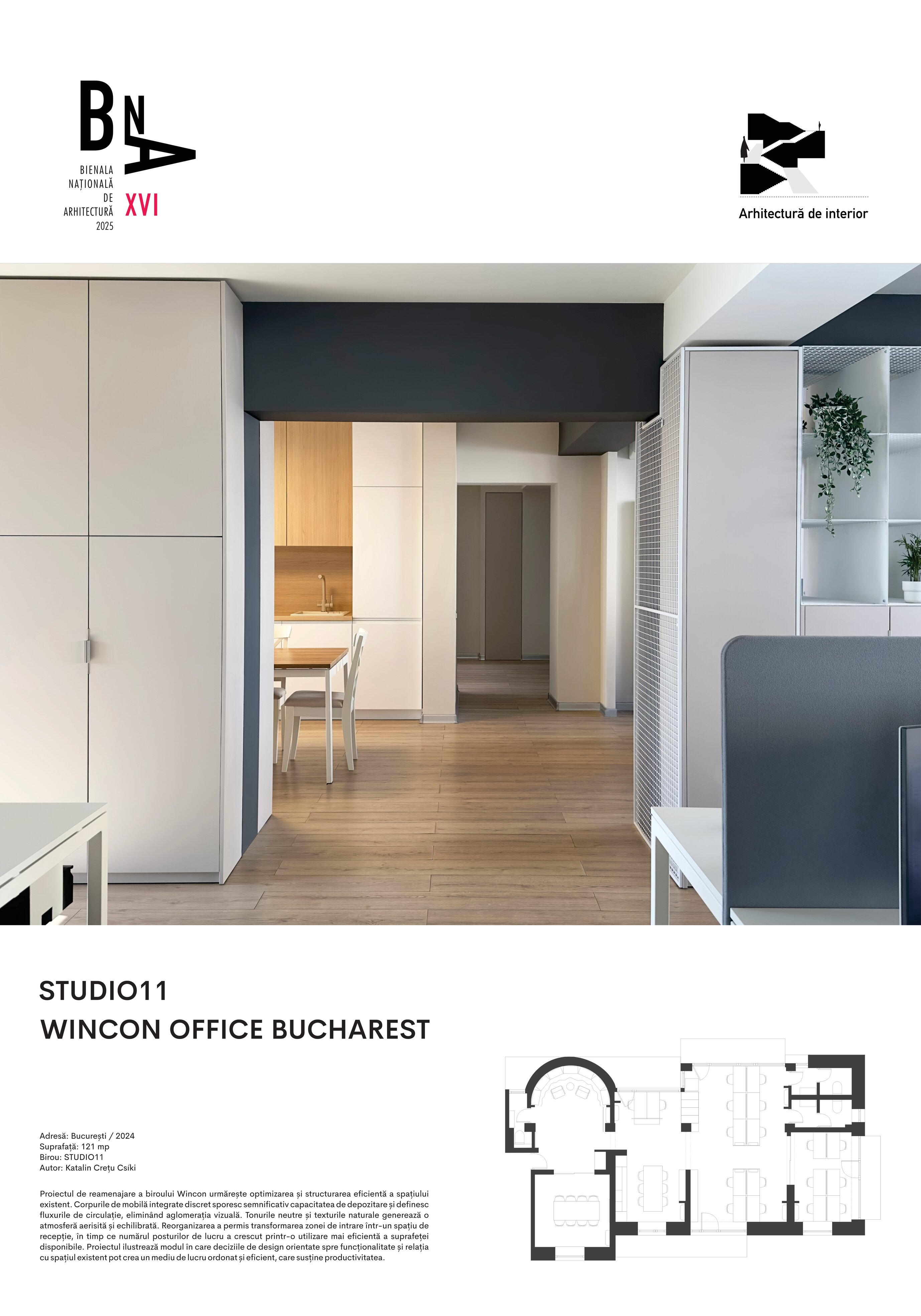 Proiectul de reamenajare a biroului Wincon urmărește optimizarea și structurarea eficientă a spațiului existent. Corpurile de mobilă integrate discret sporesc semnificativ capacitatea de depozitare și definesc fluxurile de circulație, eliminând aglomerația vizuală. Tonurile neutre și texturile naturale generează o atmosferă aerisită și echilibrată. Reorganizarea a permis transformarea zonei de intrare într-un spațiu de recepție, în timp ce numărul posturilor de lucru a crescut printr-o utilizare mai eficientă a suprafeței disponibile. Proiectul ilustrează modul în care deciziile de design orientate spre funcționalitate și relația cu spațiul existent pot crea un mediu de lucru ordonat și eficient, care susține productivitatea.