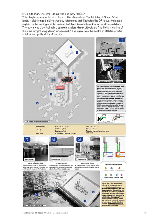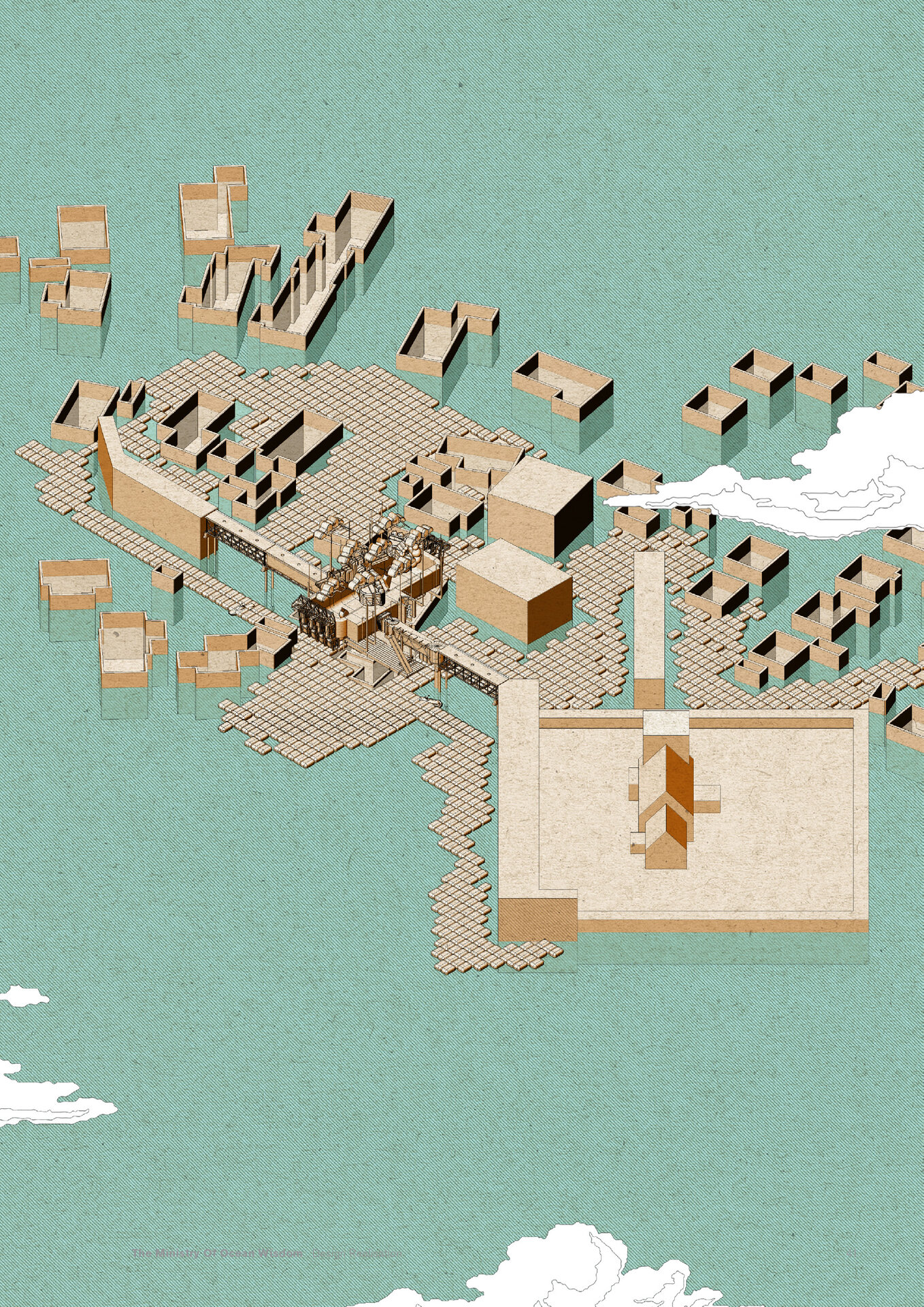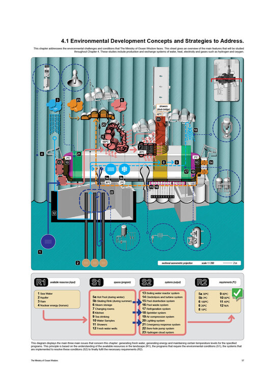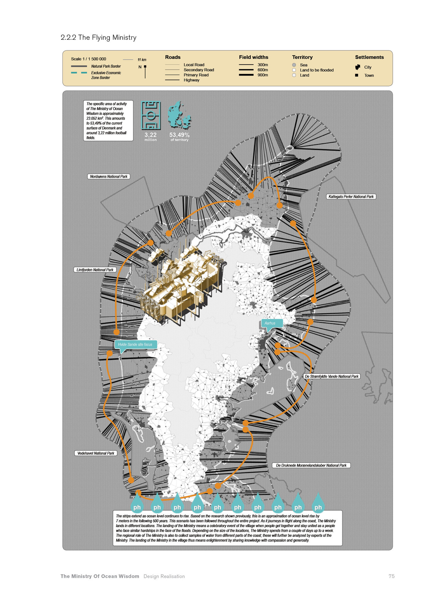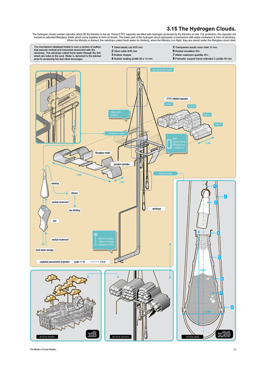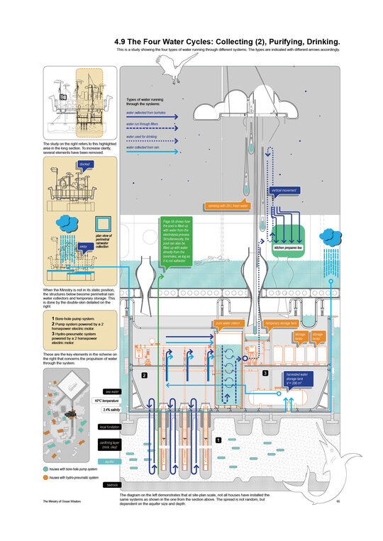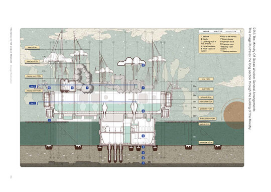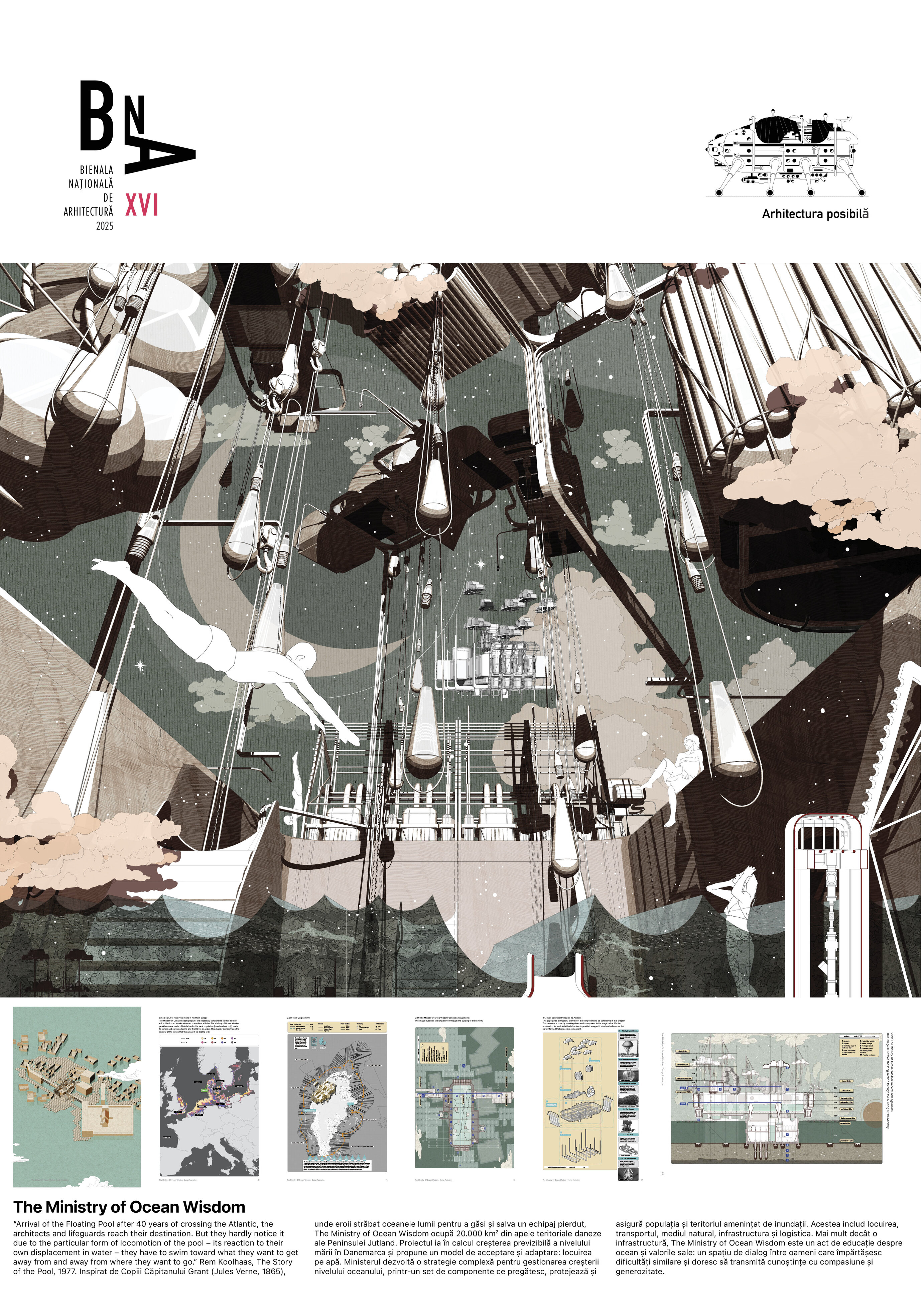 “Arrival of the Floating Pool after 40 years of crossing the Atlantic, the architects and lifeguards reach their destination. But they hardly notice it due to the particular form of locomotion of the pool – its reaction to their own displacement in water – they have to swim toward what they want to get away from and away from where they want to go.” Rem Koolhaas, The Story of the Pool, 1977. Inspirat de Copiii Căpitanului Grant (Jules Verne, 1865), unde eroii străbat oceanele lumii pentru a găsi și salva un echipaj pierdut, The Ministry of Ocean Wisdom ocupă 20.000 km² din apele teritoriale daneze ale Peninsulei Jutland. Proiectul ia în calcul creșterea previzibilă a nivelului mării în Danemarca și propune un model de acceptare și adaptare: locuirea pe apă. Ministerul dezvoltă o strategie complexă pentru gestionarea creșterii nivelului oceanului, printr-un set de componente ce pregătesc, protejează și asigură populația și teritoriul amenințat de inundații. Acestea includ locuirea, transportul, mediul natural, infrastructura și logistica. Mai mult decât o infrastructură, The Ministry of Ocean Wisdom este un act de educație despre ocean și valorile sale: un spațiu de dialog între oameni care împărtășesc dificultăți similare și doresc să transmită cunoștințe cu compasiune și generozitate.