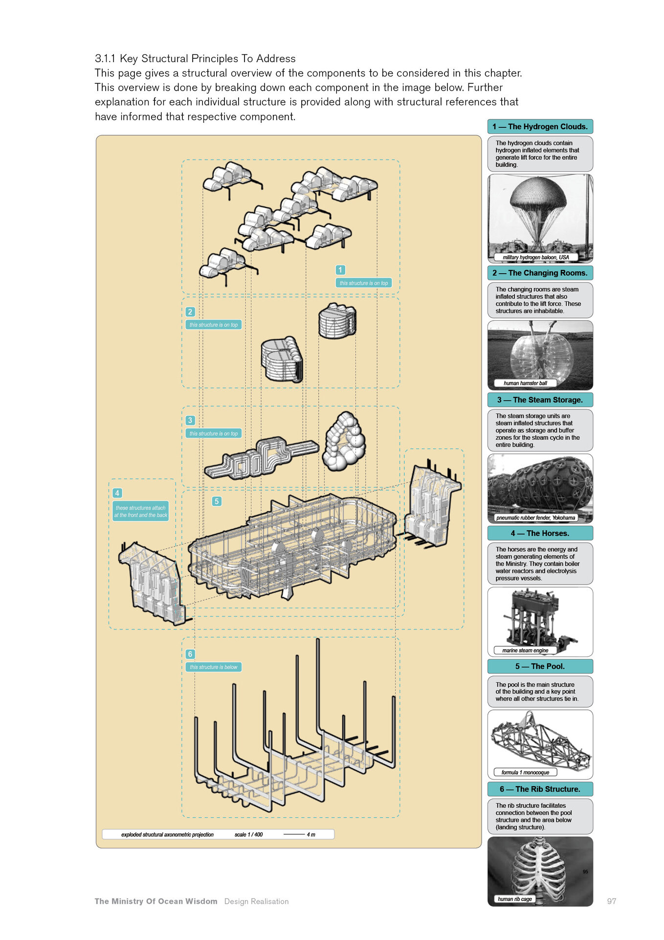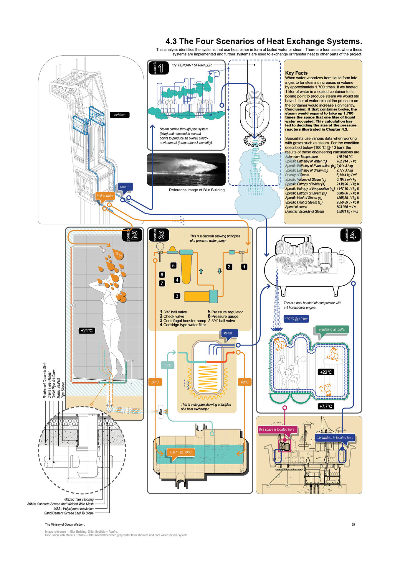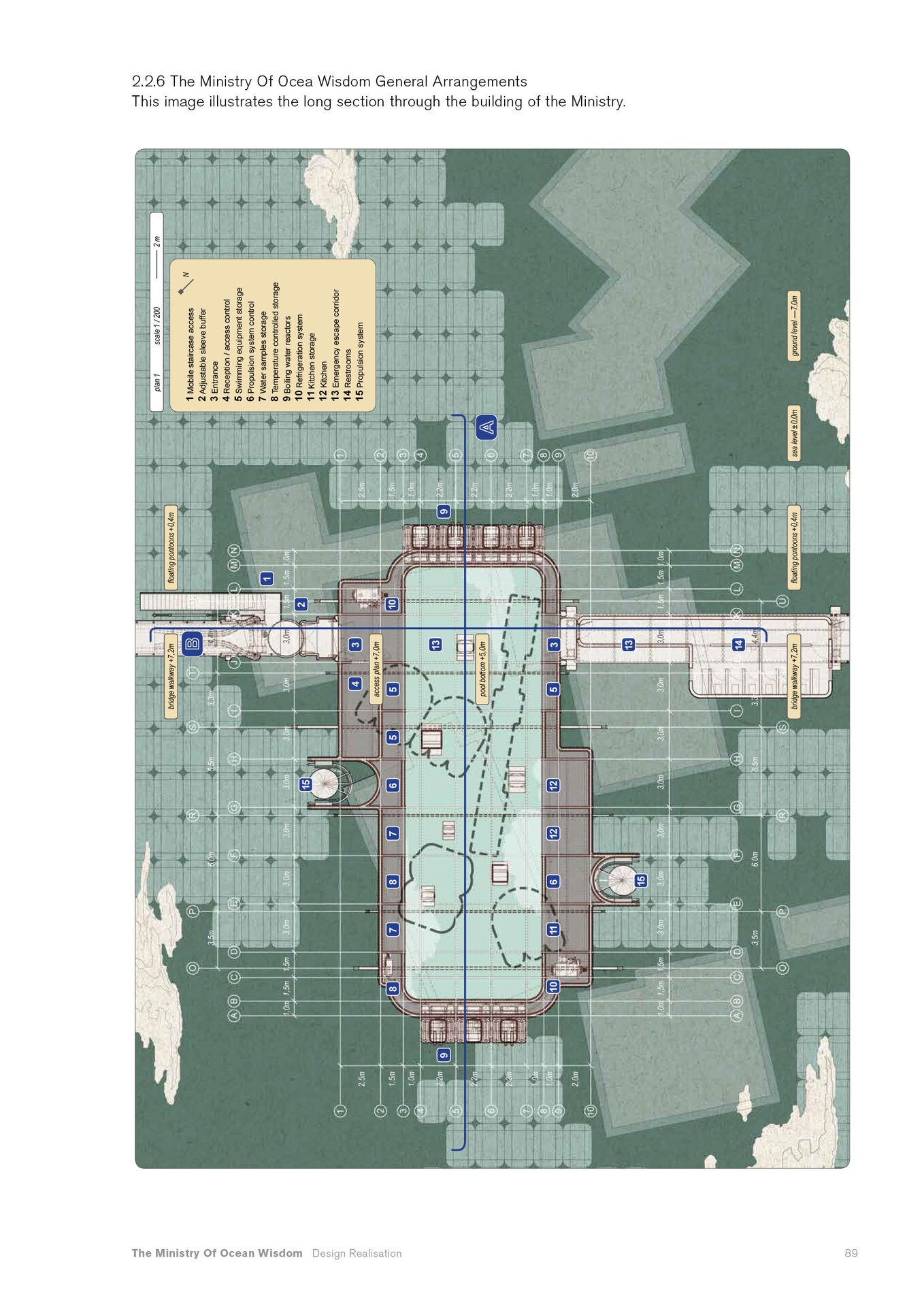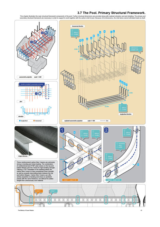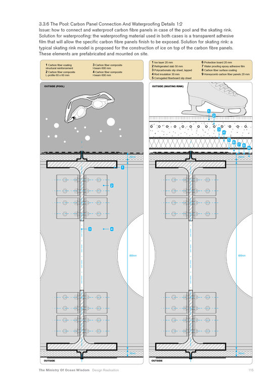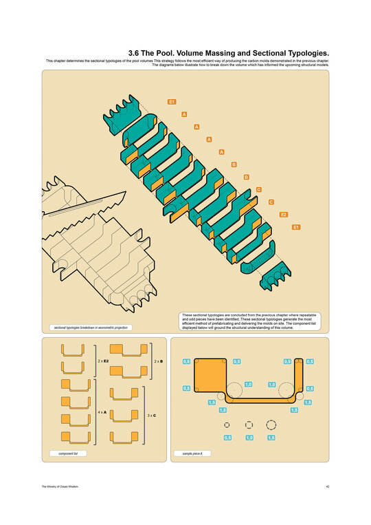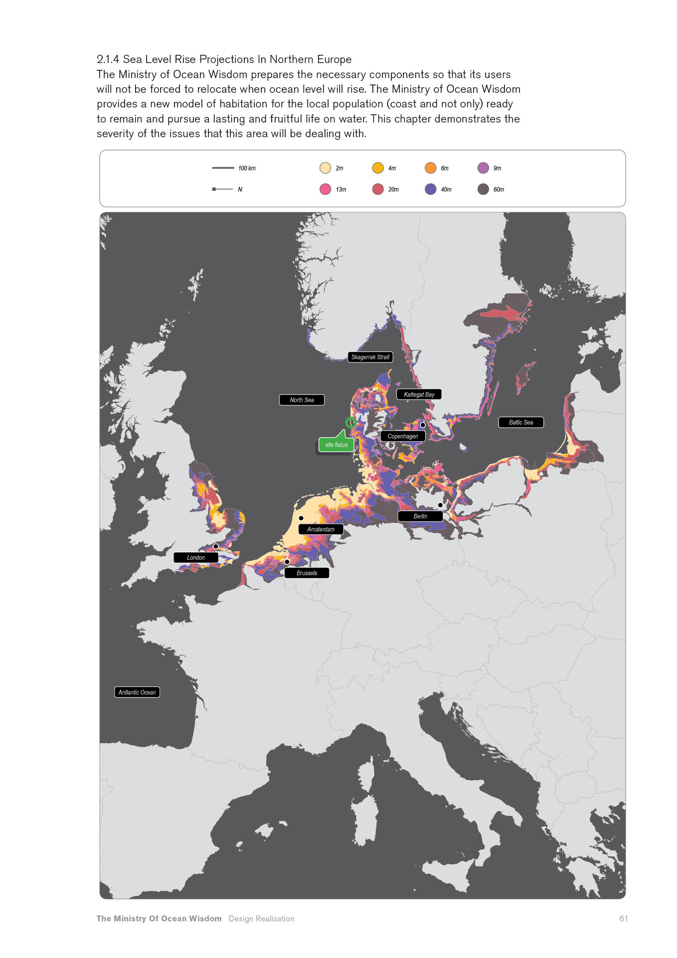 “Arrival of the Floating Pool after 40 years of crossing the Atlantic, the architects and lifeguards reach their destination. But they hardly notice it due to the particular form of locomotion of the pool – its reaction to their own displacement in water – they have to swim toward what they want to get away from and away from where they want to go.” Rem Koolhaas, The Story of the Pool, 1977. Inspirat de Copiii Căpitanului Grant (Jules Verne, 1865), unde eroii străbat oceanele lumii pentru a găsi și salva un echipaj pierdut, The Ministry of Ocean Wisdom ocupă 20.000 km² din apele teritoriale daneze ale Peninsulei Jutland. Proiectul ia în calcul creșterea previzibilă a nivelului mării în Danemarca și propune un model de acceptare și adaptare: locuirea pe apă. Ministerul dezvoltă o strategie complexă pentru gestionarea creșterii nivelului oceanului, printr-un set de componente ce pregătesc, protejează și asigură populația și teritoriul amenințat de inundații. Acestea includ locuirea, transportul, mediul natural, infrastructura și logistica. Mai mult decât o infrastructură, The Ministry of Ocean Wisdom este un act de educație despre ocean și valorile sale: un spațiu de dialog între oameni care împărtășesc dificultăți similare și doresc să transmită cunoștințe cu compasiune și generozitate.