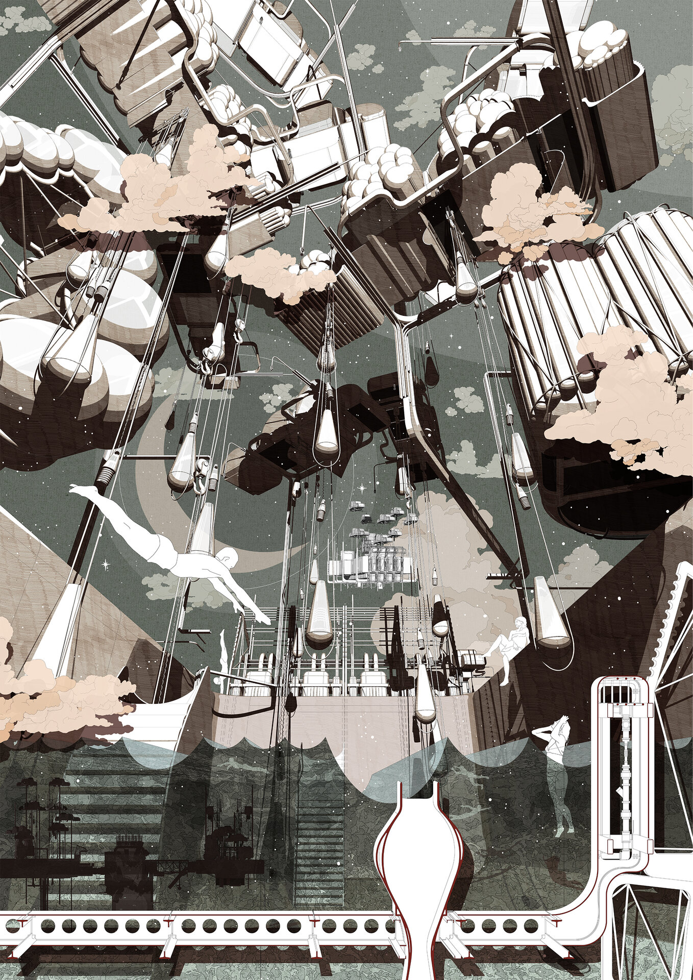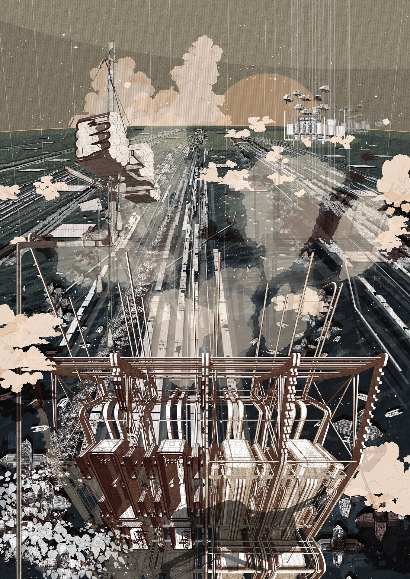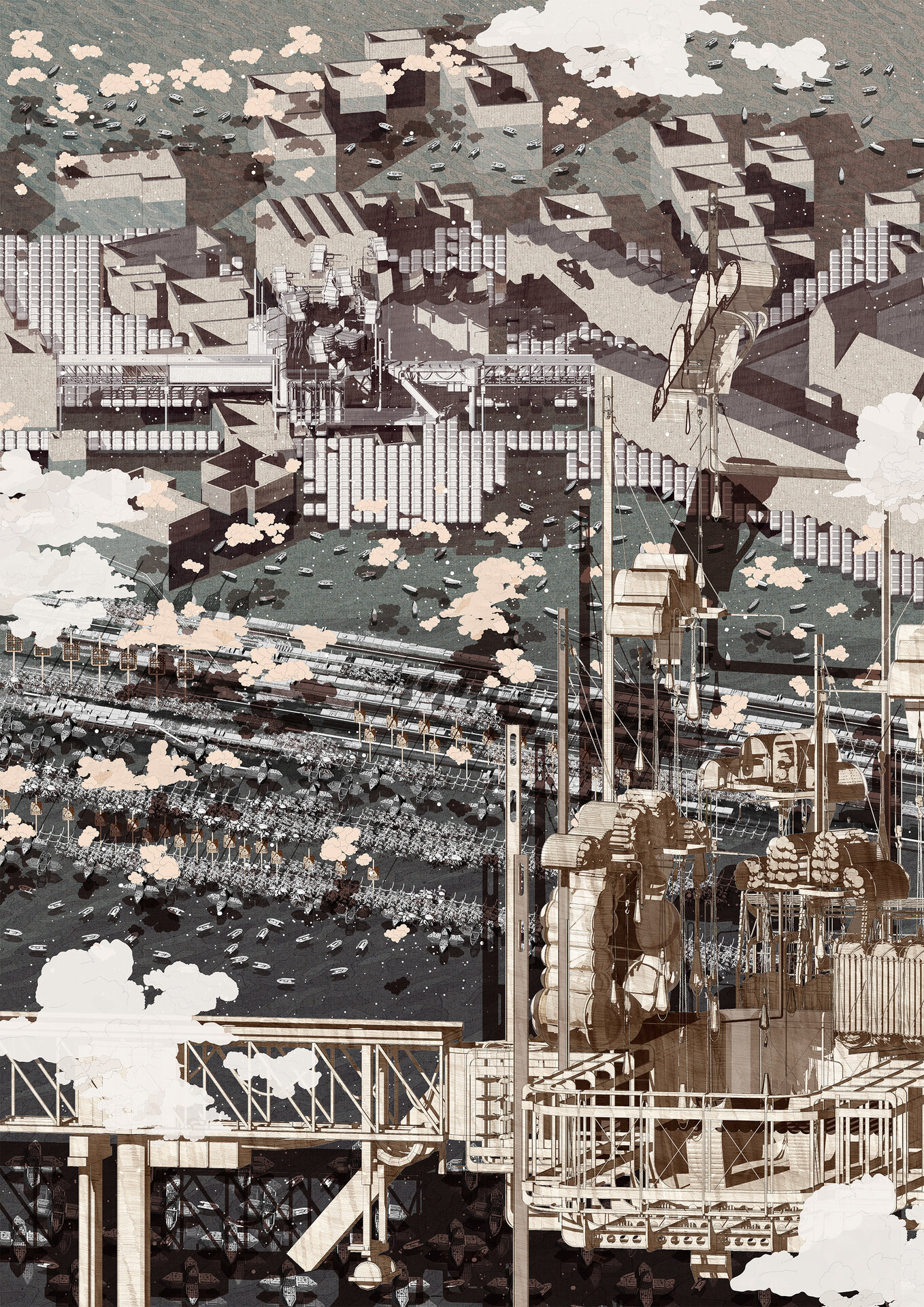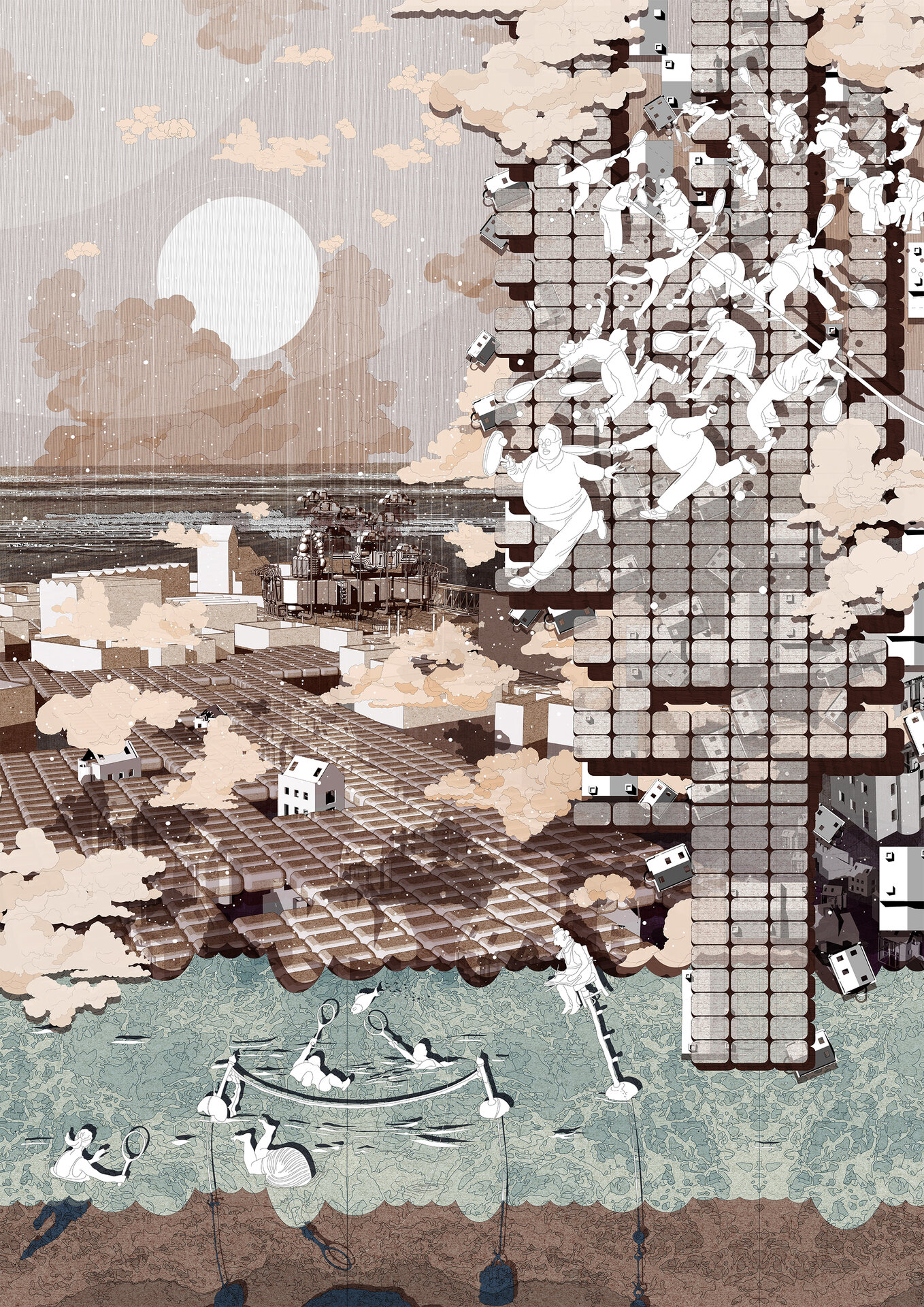 Proiectul investighează sustenabilitatea și provocările generate de schimbările climatice, precum și beneficiile reciproce ale abordării simultane a riscului și a modelării orașelor. Arhitectura devine un instrument care răspunde unei urgențe globale, dar o face printr-o combinație de narațiuni speculative și cunoaștere științifică actuală despre impactul mediului asupra societății. Efectele schimbărilor climatice asupra arhitecturii nu se reduc doar la variațiile meteorologice, ci implică transformări în comportament, demografie și presiuni economice. În acest sens, proiectul tratează clima ca pe o problemă de securitate, ceea ce obligă la regândirea sistemelor de arhitectură și urbanism într-o manieră radicală, multi-funcțională și inovatoare. Desenele nu documentează doar soluții, ci construiesc o poetică a viitorului. Ele cultivă optimism și o vitalitate impredictibil fragmentată, mai degrabă decât o unitate evidentă. Spațiul și elementele sale sunt prezentate în multiple registre de citire, devenind în același timp simbolice, speculative și tehnic viabile. Reprezentările utilizează alăturări de structuri narative, simboluri, ficțiune și instrumente de expunere tehnică pentru a genera arhitecturi sustenabile cu impact social și spațial. Ele arată că arhitectura, prin intermediul reprezentării, poate să articuleze noi moduri de viață și noi infrastructuri urbane, transformând criza climatică din amenințare iminentă în fascinație creativă.