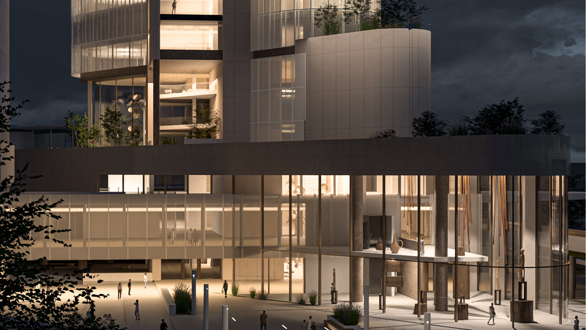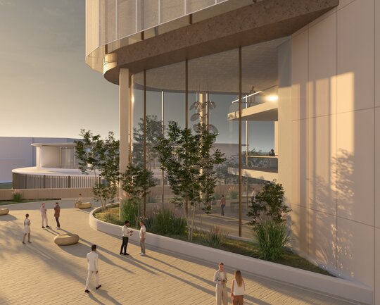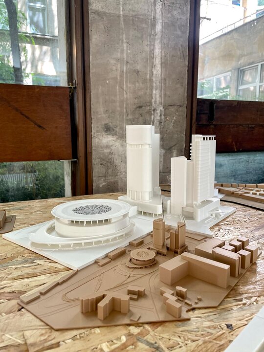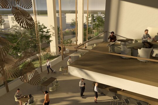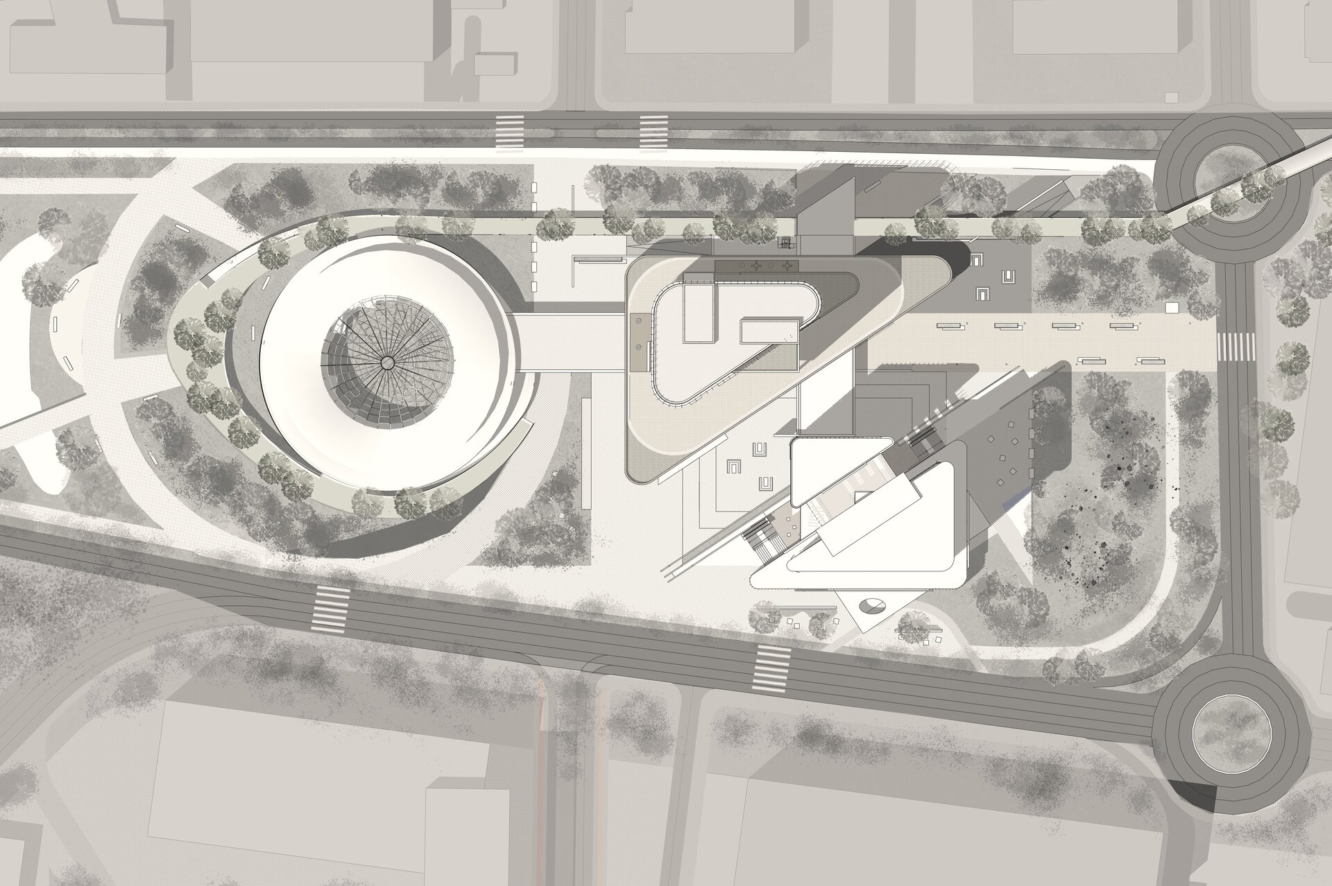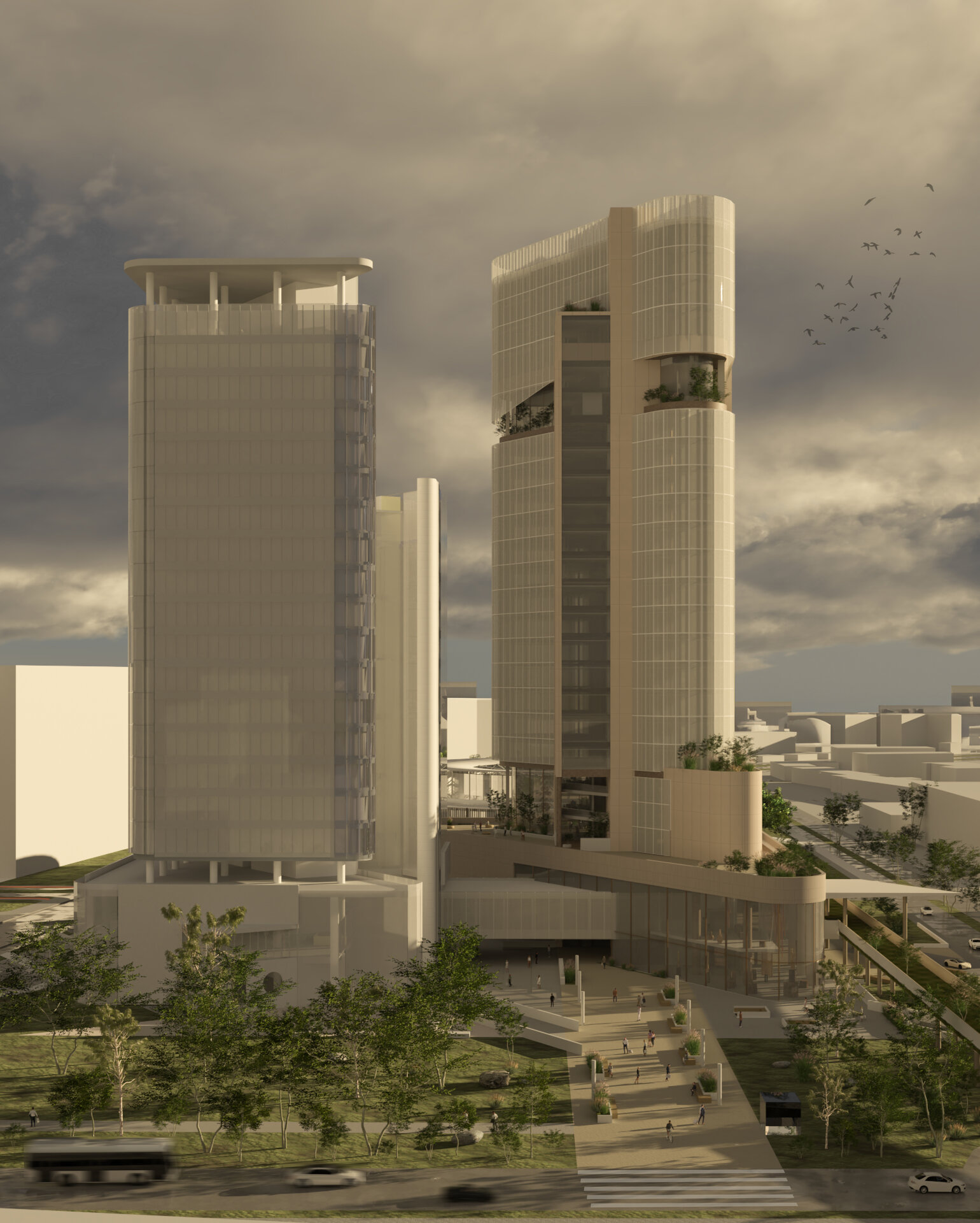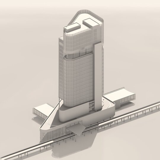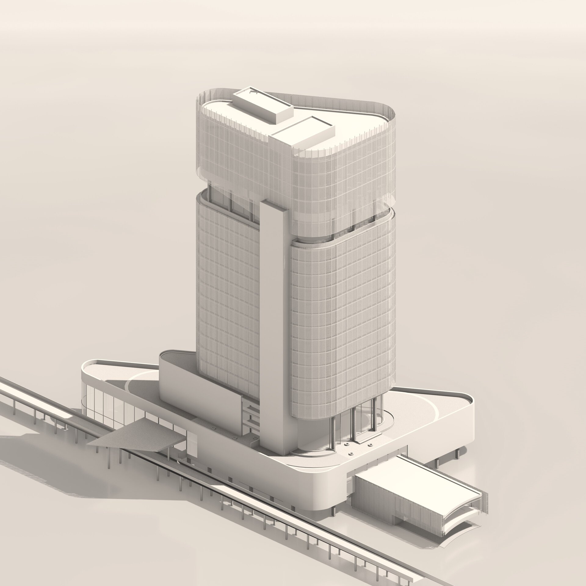 Volumetria este străpunsă de două elemente de tip „bridge”, care extind silueta și stabilesc conexiuni esențiale cu funcțiunile adiacente: nodul intermodal și centrul de conferințe. Aceste pasarele devin nu doar legături fizice, ci și gesturi urbane care ghidează și ordonează fluxurile pietonale, marcând în același timp intrările principale.