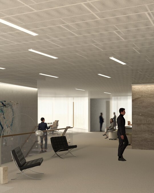 Sistemul de fațadă double-skin, alcătuit dintr-o cortină de sticlă protejată de panouri metalice de tip mesh dispuse perimetral, contribuie la performanța energetică și la identitatea vizuală a clădirii. Zonele cheie sunt lăsate libere, deschizând perspective asupra orașului și oferind spațiilor interioare priveliști spectaculoase.