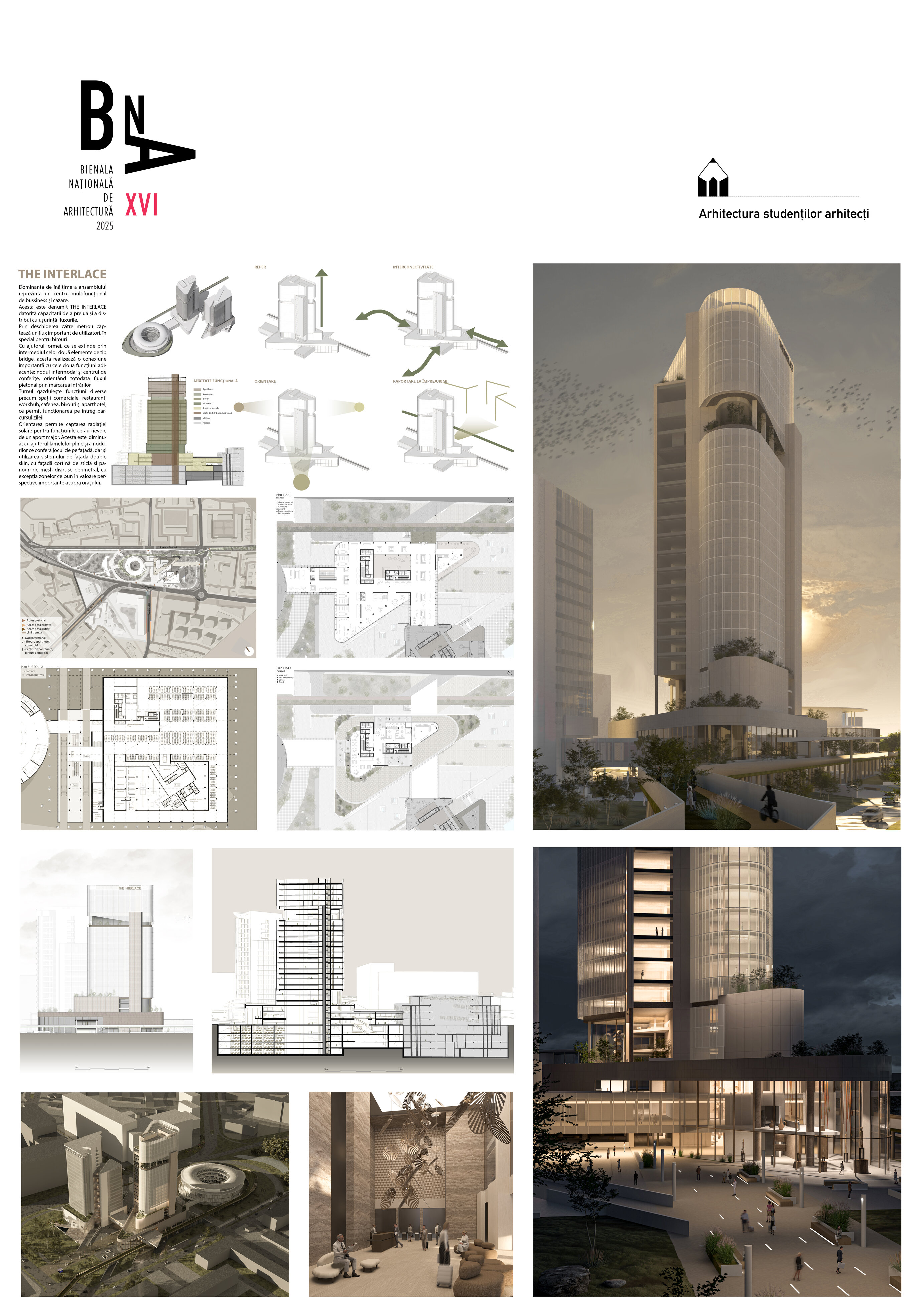 Dominanta de înălțime este gândită ca un centru multifuncțional, care îmbină funcțiuni comerciale, de business și cazare. Denumirea The Interlace reflectă capacitatea clădirii de a prelua și redistribui cu ușurință fluxurile urbane și pietonale. Legătura directă cu stația de metrou aduce un aflux semnificativ de utilizatori, în special pentru birouri, consolidând rolul de hub conectat la transportul public.