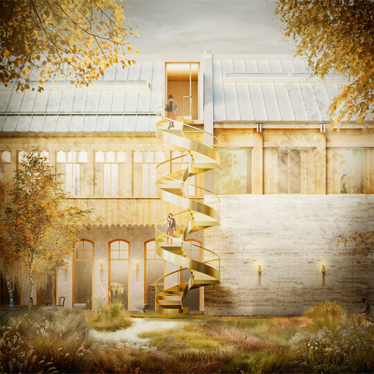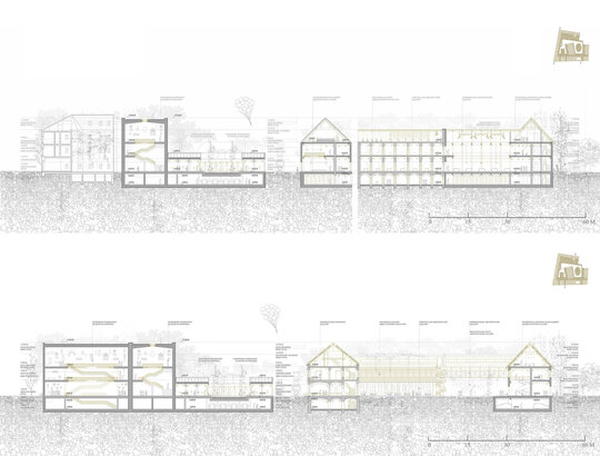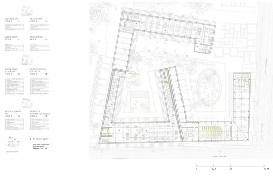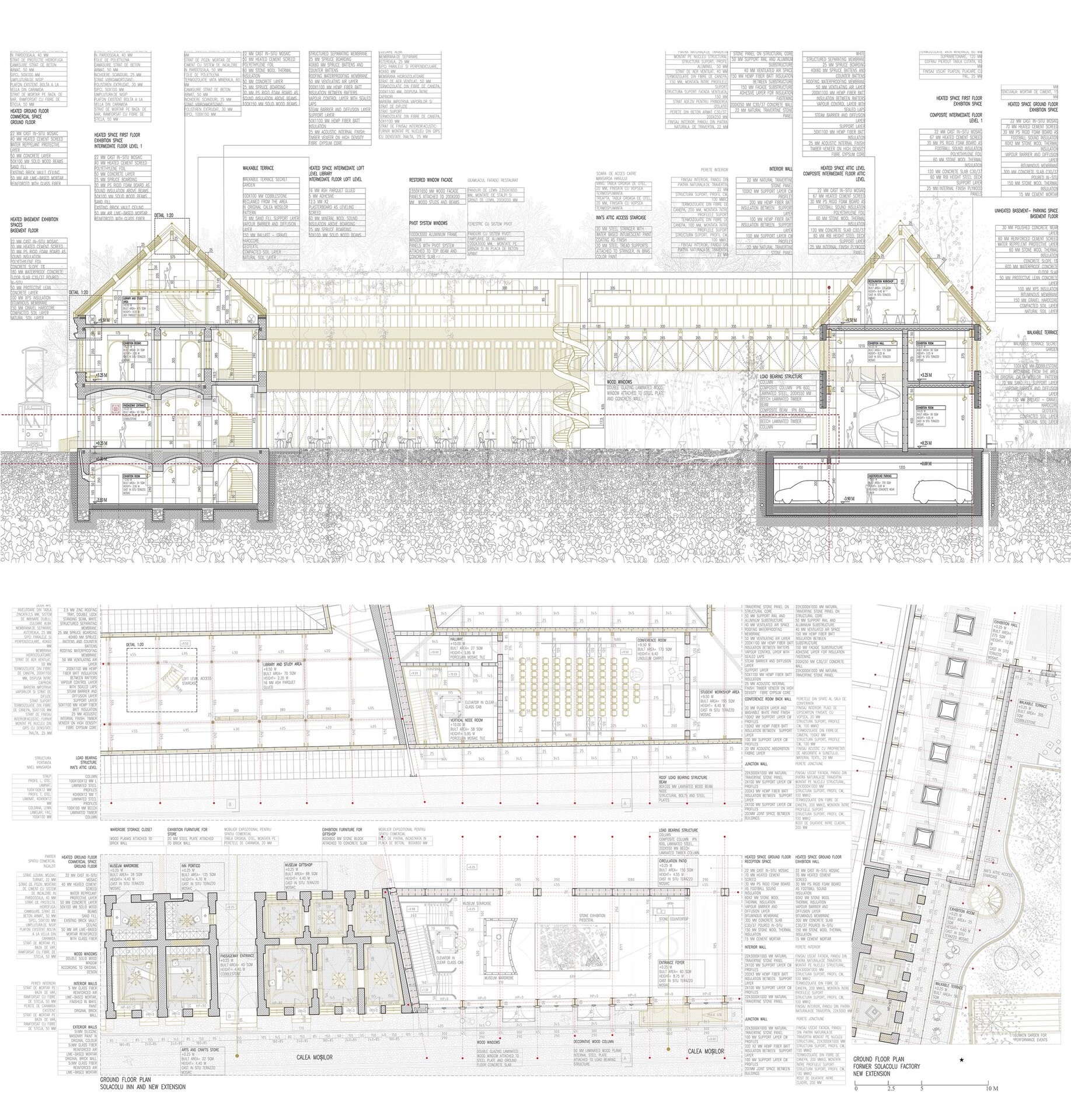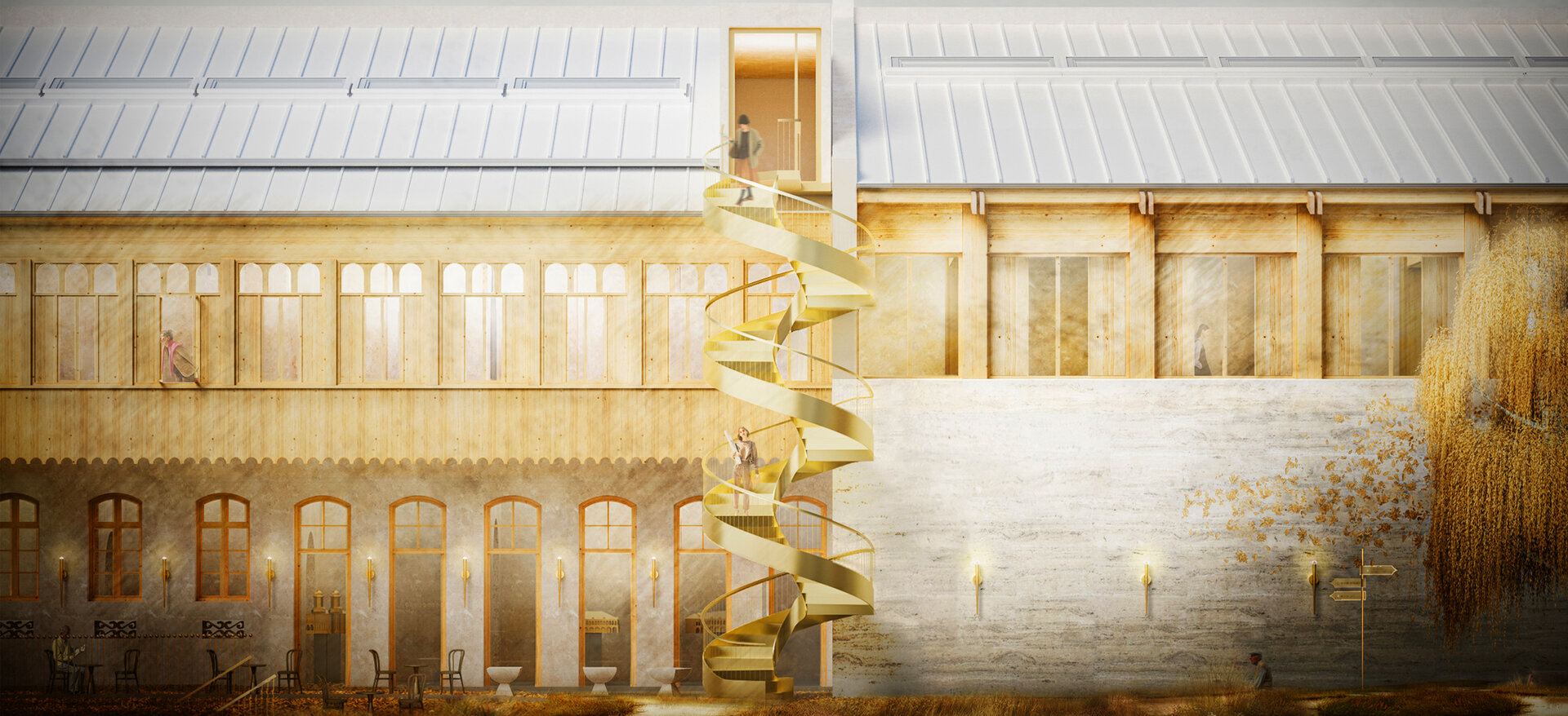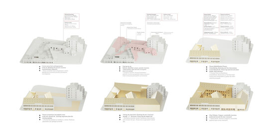 Forma fragmentată devine o curte interioară permeabilă cu țesutul prin extinderile reversibile inspirate din formele compacte ale caravanserailor și hanurilor. Noile structuri folosesc un sistem hibrid de lemn lamelar și coloane de oțel, pentru a onora influențele tradiționale ale sitului. Prin reimaginarea sitului, proiectul transformă Hanul Solacolu într-un centru cultural și educațional vibrant, care împletește conservarea patrimoniului cu soluțiile arhitecturii contemporane. Acesta servește ca un model durabil și estetic pentru revitalizarea ruinelor, nu ca artefact static, ci ca o infrastructură socială dinamică, concepută pentru nevoile actuale ale comunității.