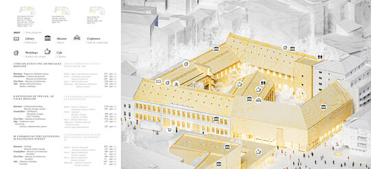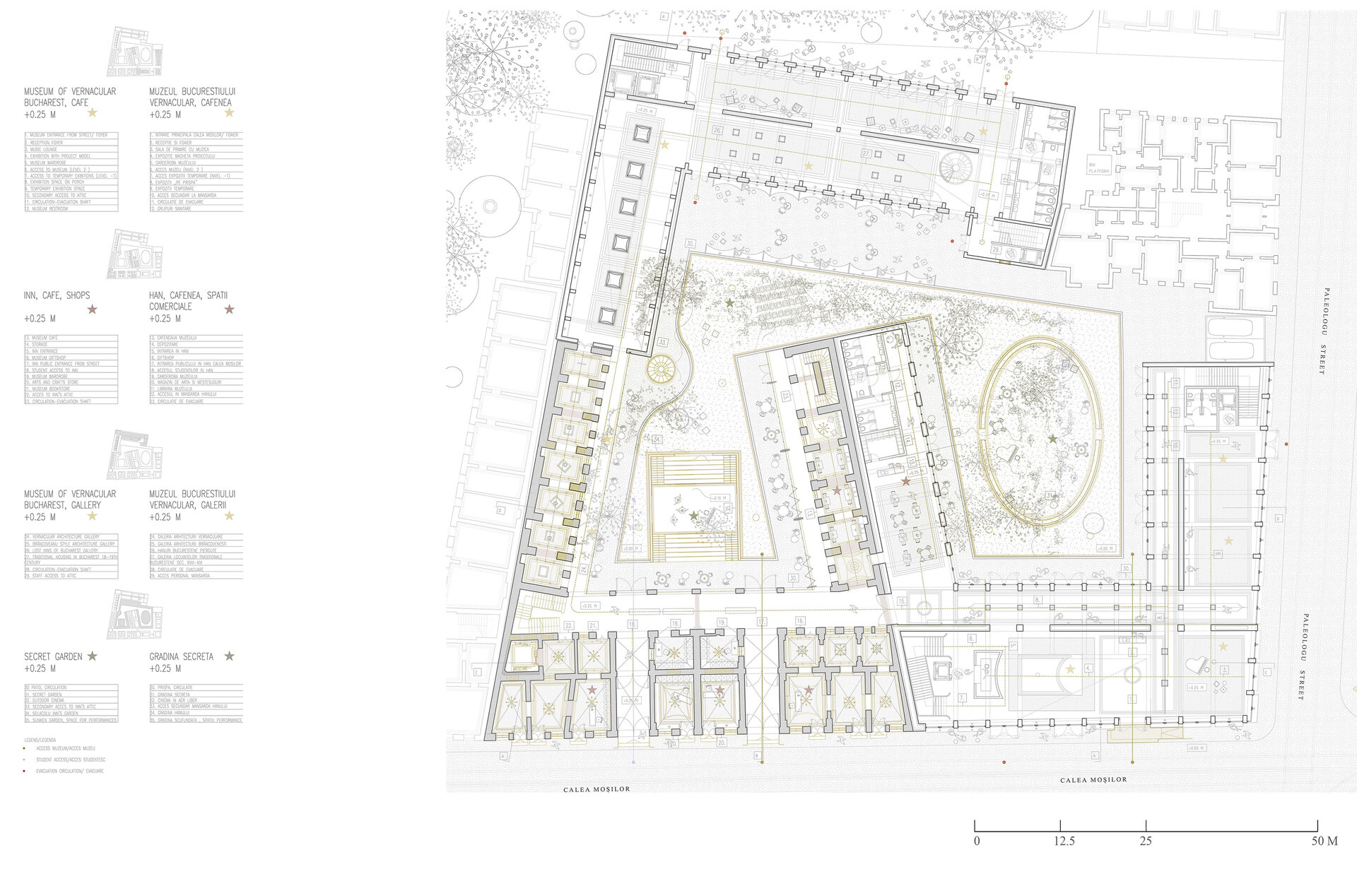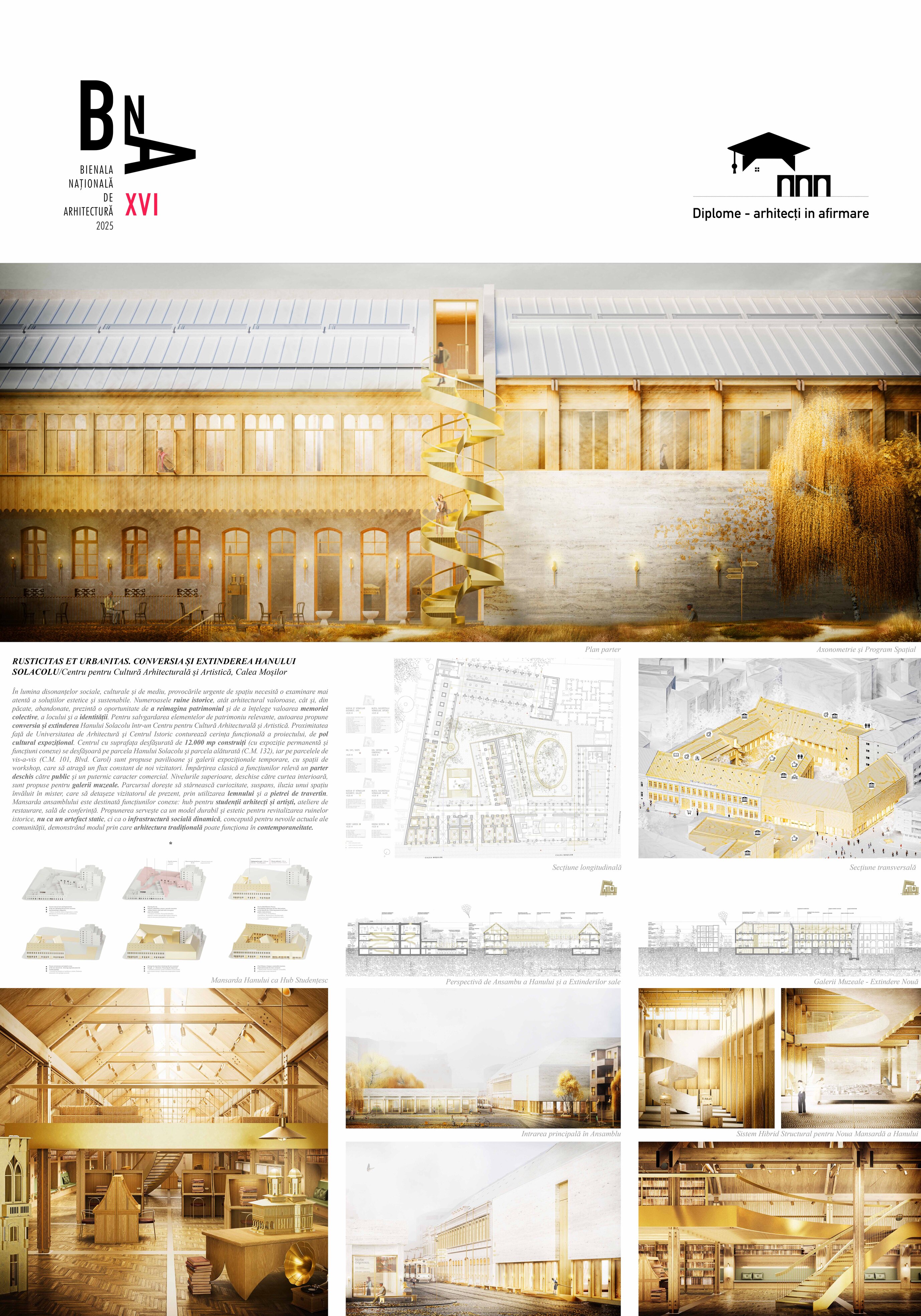 Hanul Solacolu este o ruină istorică de semnificație socio-culturală, ascuns în zona istorică a Bucureștiului, pe strada Calea Moșilor. Pentru salvgardarea elementelor de patrimoniu relevante, autoarea propune conversia și extinderea clădirii într-un Centru de Cultură Arhitecturală și Artistică. Ansamblul cu suprafața de 12.000 mp se desfășoară pe parcela Hanului și parcela alăturată, iar pe parcelele de vis-a-vis sunt propuse galerii expoziționale temporare și ateliere, care să atragă un flux constant de vizitatori. Programul funcțional pune la dispoziție un parter deschis publicului, cu un puternic caracter comercial, iar nivelul superior, deschis către curtea interioară, este propus pentru galerii muzeale. Traseul spațial este conceput pentru a detașa vizitatorii de prezent prin utilizarea materialelor naturale precum lemnul și piatra de travertin. Mansarda ansamblului este destinată funcțiunilor conexe: un hub pentru studenții arhitecți și artiști și o sală de conferința ca loc de întâlnire între diverse arii interdisciplinare.