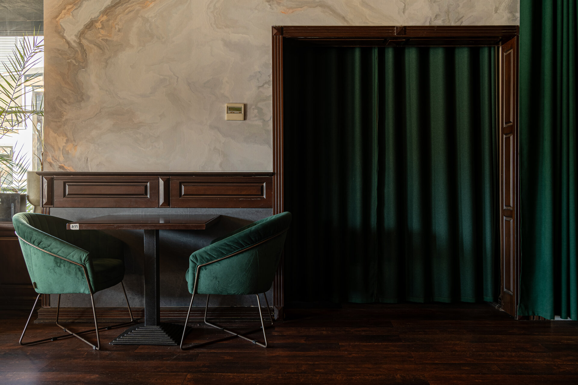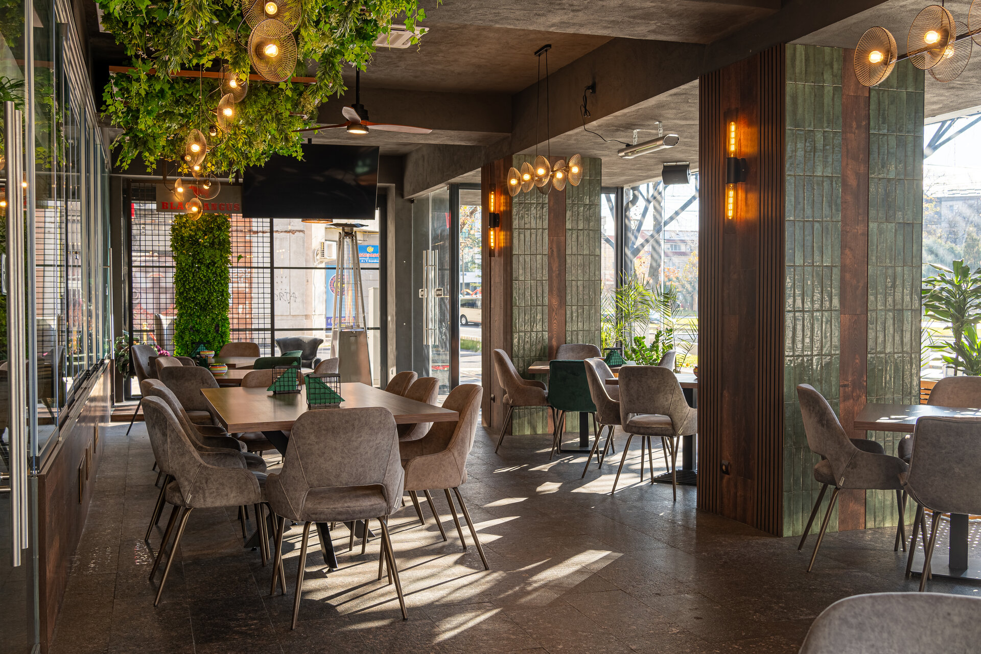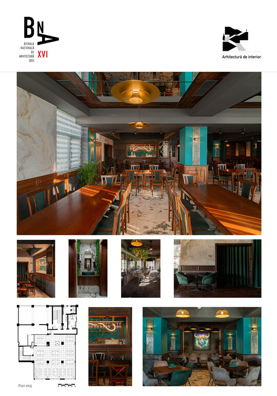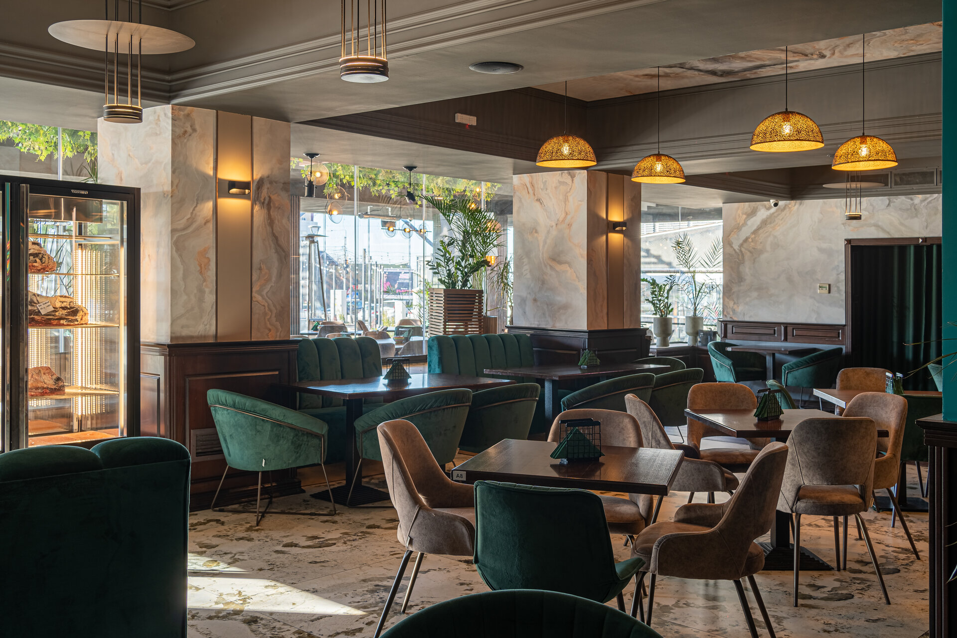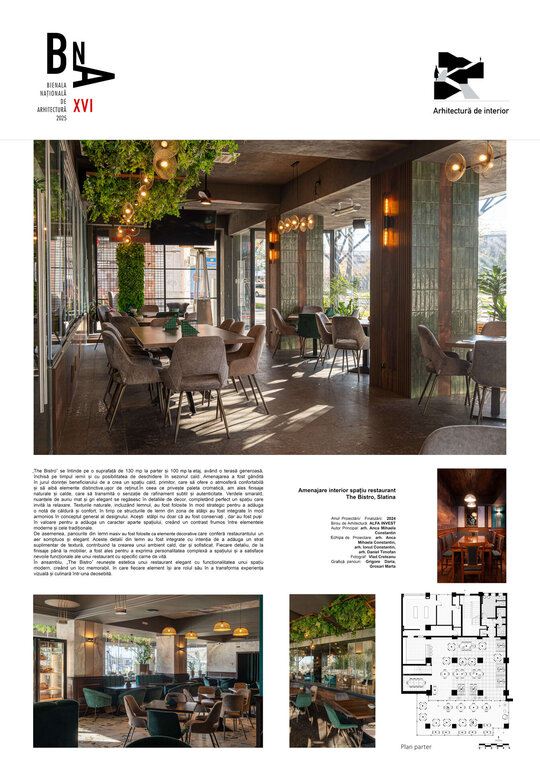 “The Bistro” se întinde pe o suprafață de 130 mp la parter și 100 mp la etaj, având o terasă generoasă, închisă pe timpul iernii și cu posibilitatea de deschidere în sezonul cald. Amenajarea a fost gândită în jurul dorinței beneficiarului de a crea un spațiu cald, primitor, care să ofere o atmosferă confortabilă și să aibă elemente distinctive, ușor de reținut. În ceea ce privește paleta cromatică, am ales finisaje naturale și calde, care să transmit o senzație de rafinament subtil și autenticitate. Verdele smarald, nuanțele de auriu mat și gri elegant se regăsesc în detaliile de decor, completând perfect un spațiu care invită la relaxare. Texturile naturale, incluzând lemnul, au fost folosite în mod strategic pentru a adăuga o notă de căldură și confort, în timp ce structurile de lemn din zona de stâlpi au fost integrate în mod armonios în conceptul general al designului. Acești stâlpi nu doar ca au fost conservați, dar au fost puși în valoare pentru a adăuga un caracter aparte spațiului, creând un contrast frumos între elementele moderne și cele tradiționale.