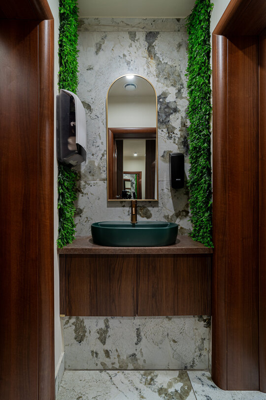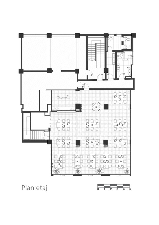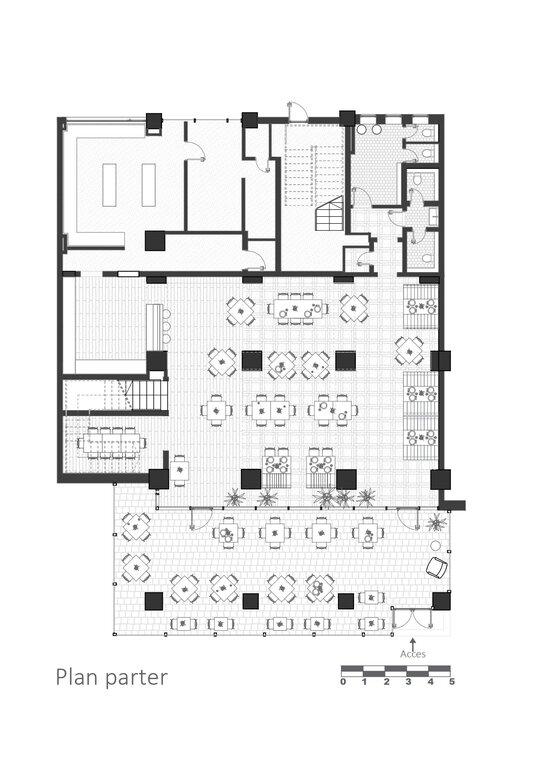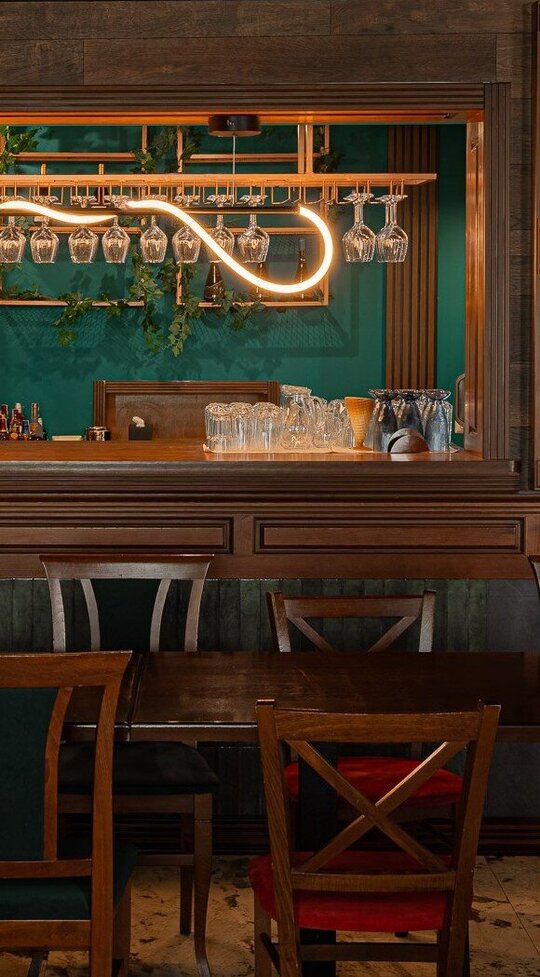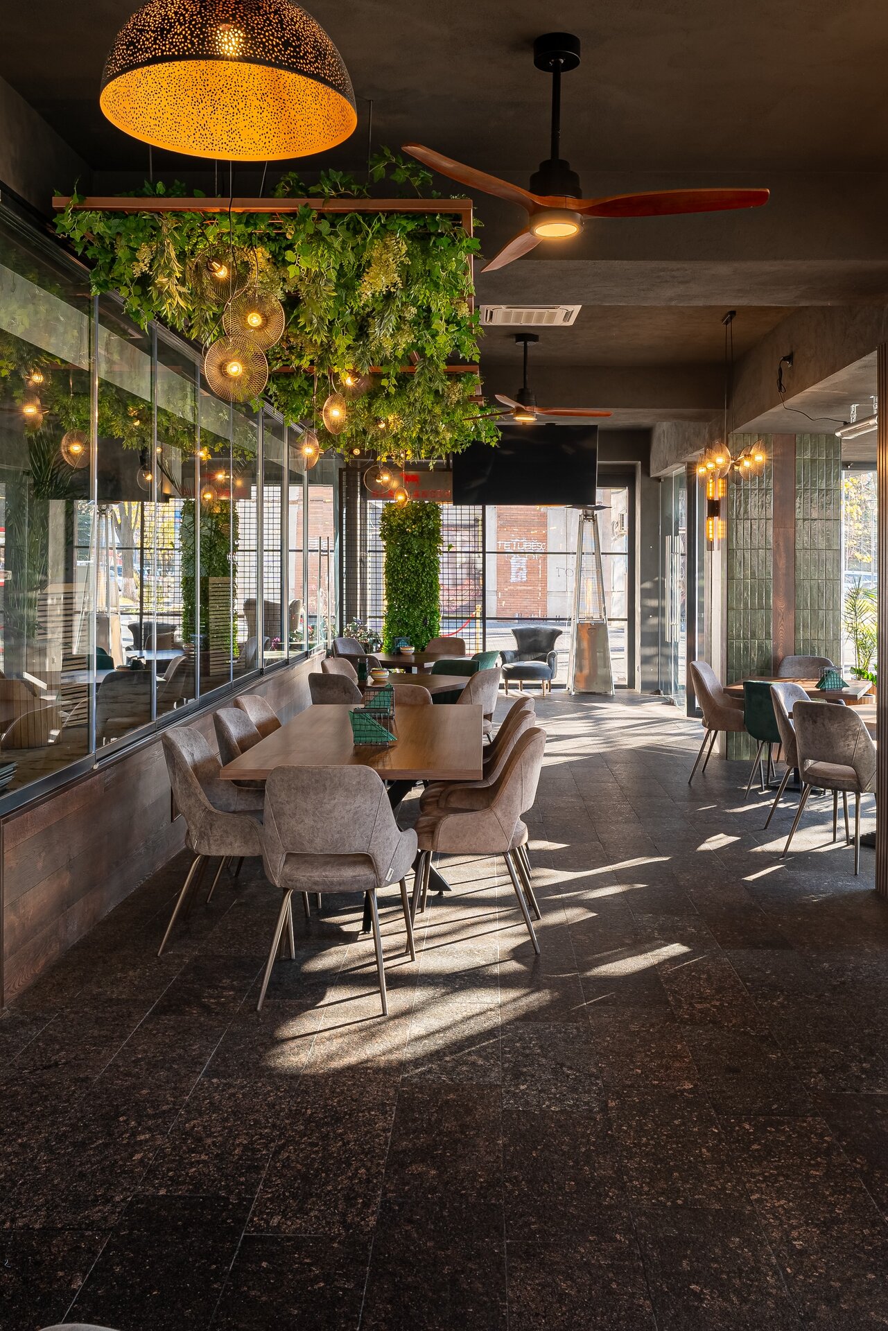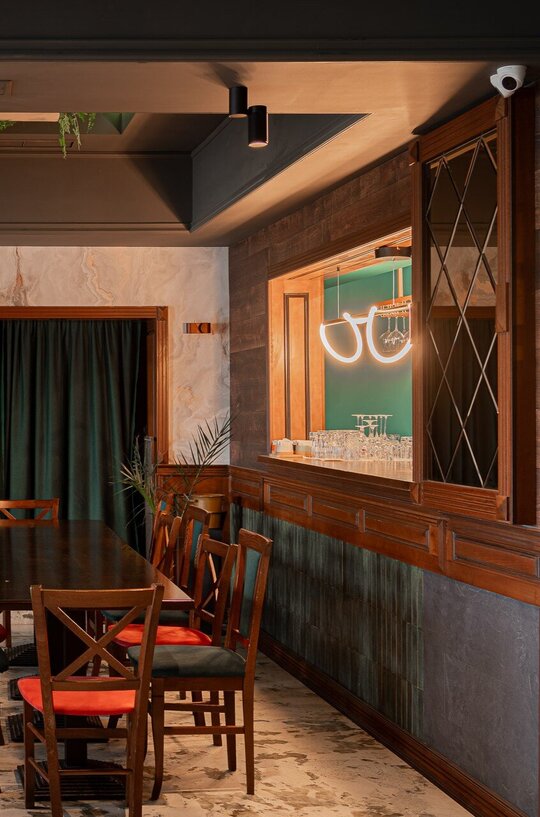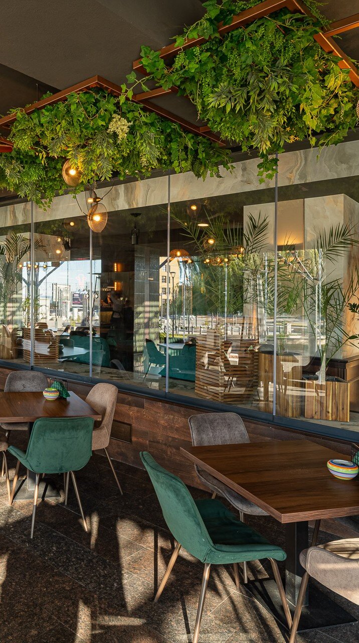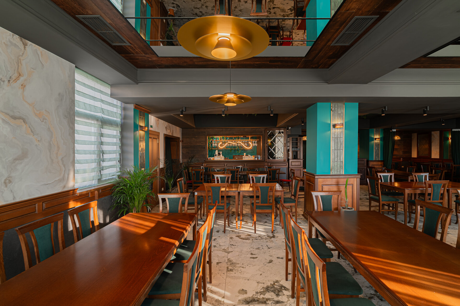 “The Bistro” se întinde pe o suprafață de 130 mp la parter și 100 mp la etaj, având o terasă generoasă, închisă pe timpul iernii și cu posibilitatea de deschidere în sezonul cald. Amenajarea a fost gândită în jurul dorinței beneficiarului de a crea un spațiu cald, primitor, care să ofere o atmosferă confortabilă și să aibă elemente distinctive, ușor de reținut. În ceea ce privește paleta cromatică, am ales finisaje naturale și calde, care să transmit o senzație de rafinament subtil și autenticitate. Verdele smarald, nuanțele de auriu mat și gri elegant se regăsesc în detaliile de decor, completând perfect un spațiu care invită la relaxare. Texturile naturale, incluzând lemnul, au fost folosite în mod strategic pentru a adăuga o notă de căldură și confort, în timp ce structurile de lemn din zona de stâlpi au fost integrate în mod armonios în conceptul general al designului. Acești stâlpi nu doar ca au fost conservați, dar au fost puși în valoare pentru a adăuga un caracter aparte spațiului, creând un contrast frumos între elementele moderne și cele tradiționale.