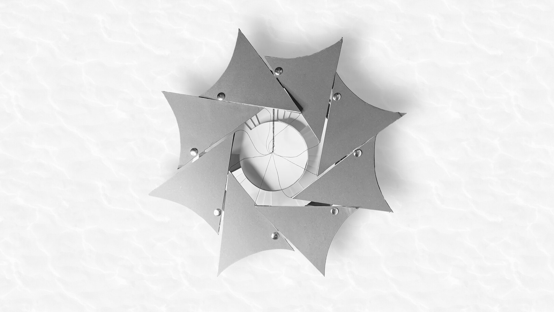 A doua componentă, mai dificilă, a fost proiectarea acoperișului mobil. Ideea mi-a venit analizând modul în care se mișcă diafragma unei camere foto, acea parte care reglează lumina și claritatea imaginii. Am realizat o serie de schițe în care am încercat să transpun această mecanică într-o formă arhitecturală. Procesul nu a fost simplu, dar tocmai această provocare l-a făcut fascinant. Am construit un prototip din hârtie, câteva sfori și o bandă adezivă sclipitoare pe care o aveam acasă. Am început să leg sforile într-un mod care să imite deschiderea și închiderea diafragmei. Spre surprinderea mea, experimentul a funcționat: maqueta se putea deschide și închide doar prin tragerea a două sfori. Acest moment a reprezentat pentru mine o mică victorie, pentru că am reușit să trec de la o simplă idee teoretică la un obiect funcțional, chiar dacă la scară redusă.