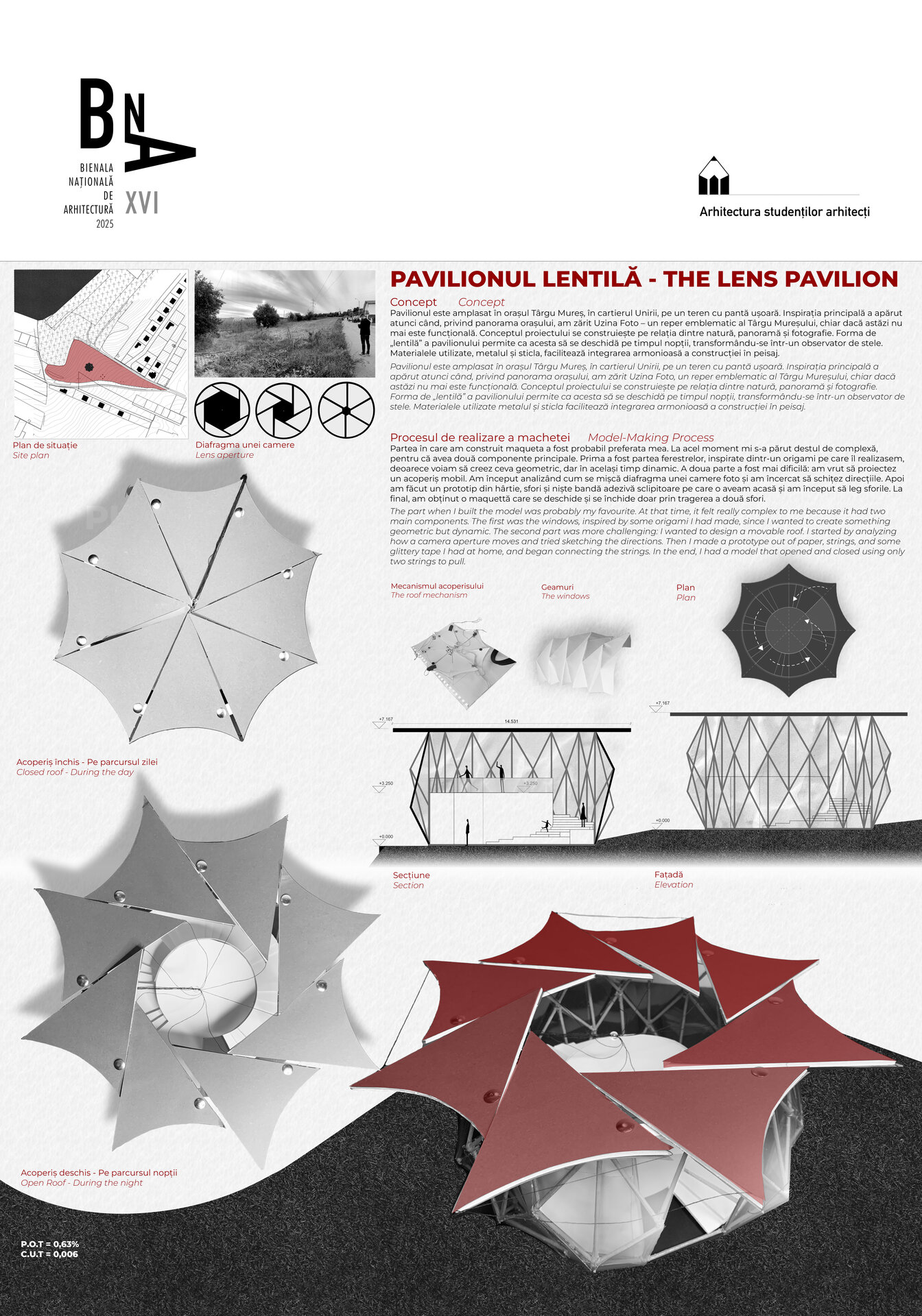 Forma pavilionului a fost gândită ca o „lentilă” arhitecturală. Alegerea nu este întâmplătoare, pentru că lentila este instrumentul prin care privim, concentrăm lumina și descoperim noi perspective. Pavilionul devine astfel o metaforă a actului de a observa: ziua, cadrul panoramic al orașului și al naturii, iar noaptea, spectacolul cerului înstelat. Din acest motiv, pavilionul are un mecanism care îi permite să se deschidă pe timpul nopții, transformându-se într-un adevărat observator astronomic. Ideea de transformare și dinamism este esențială în concept, pavilionul nefiind doar un spațiu static, ci o construcție vie, care își schimbă funcția și expresia odată cu trecerea timpului.