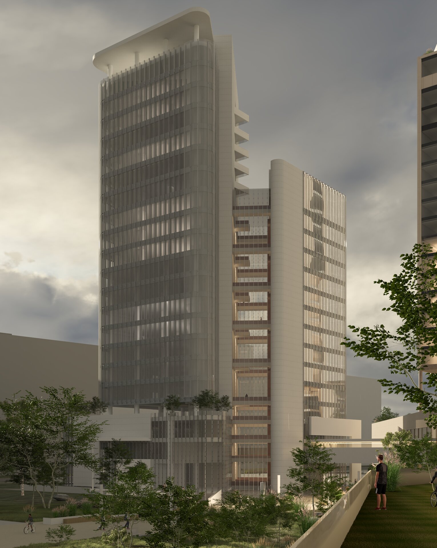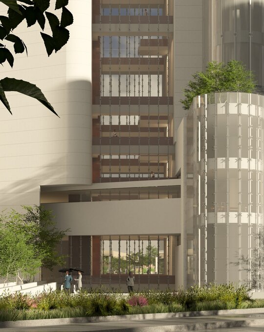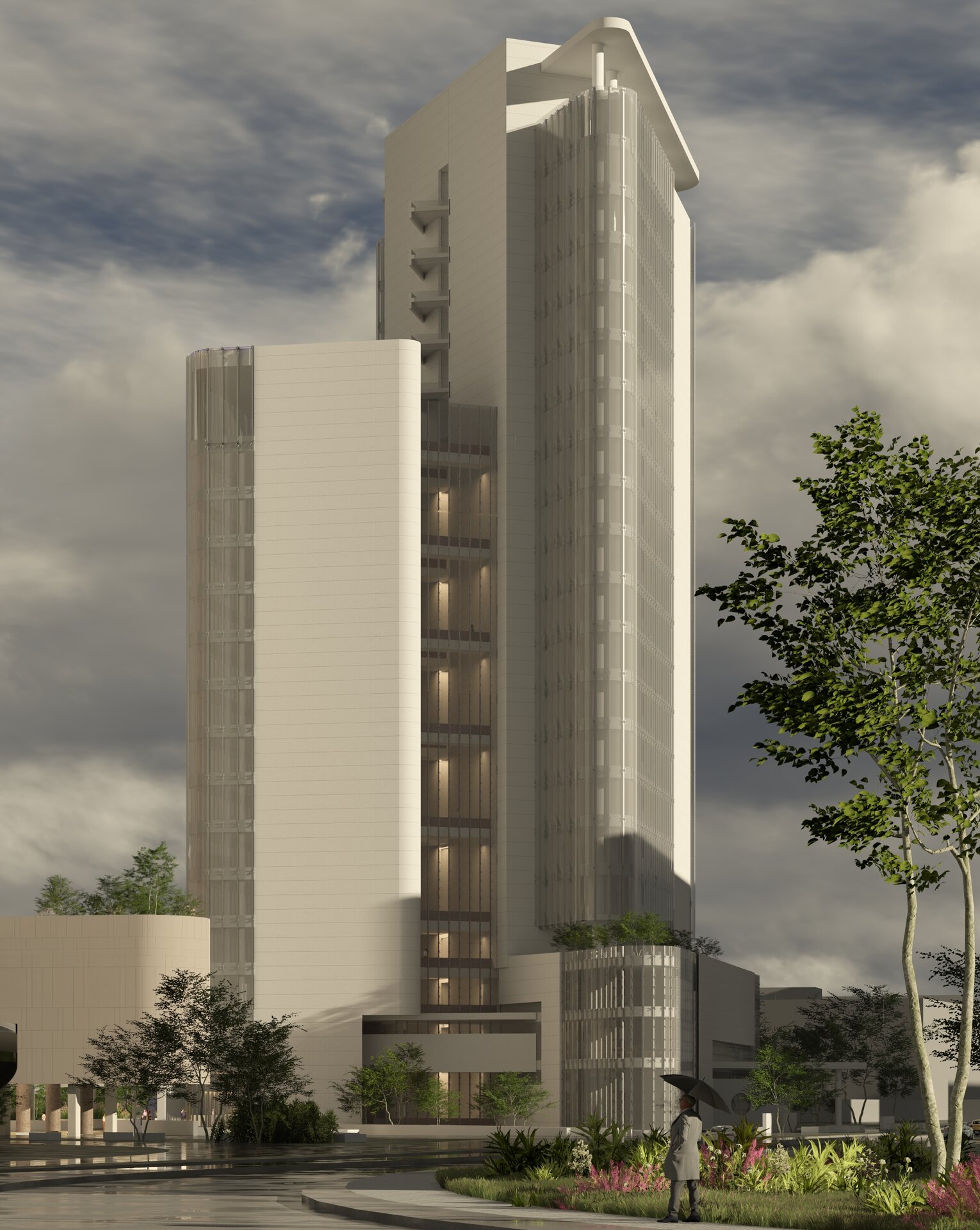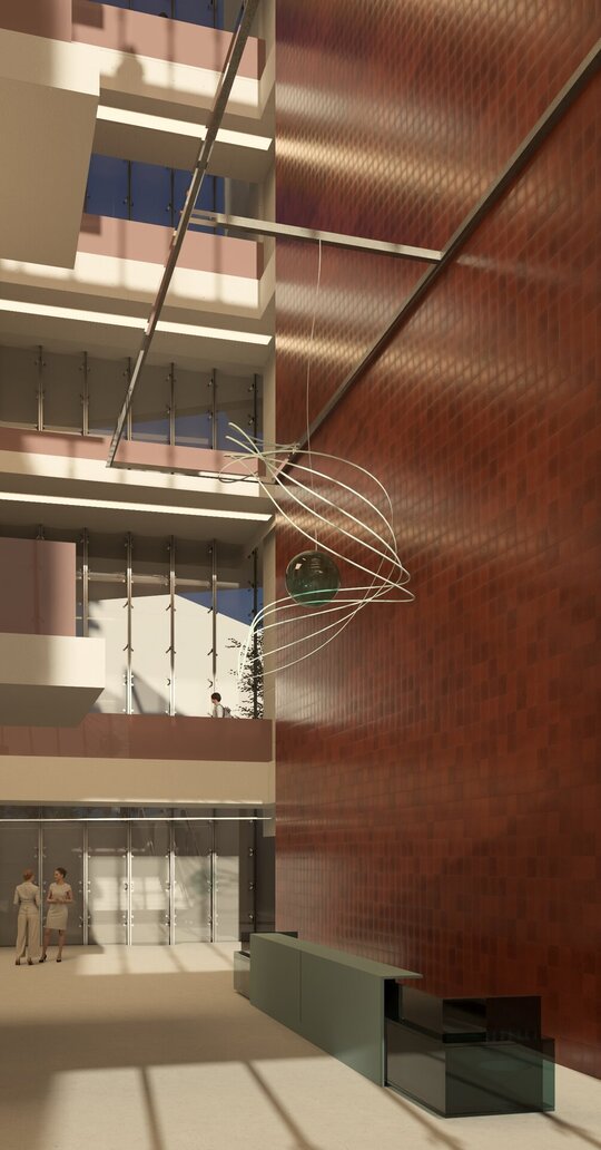 Din punct de vedere al materialității, contrastul dintre plinul plăcilor ceramice și transparența suprafețelor vitrate de tip double skin evidențiază spațiul median de tranziție dintre cele două turnuri.