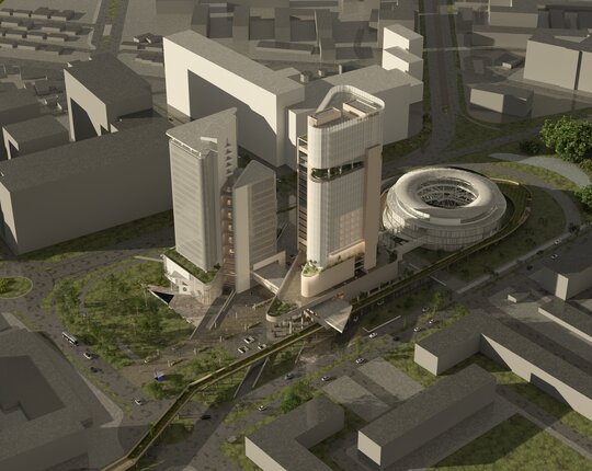 În acest ansamblu, obiectul arhitectural realizat este Centrul de Conferințe și Birouri. Rolul său este de a prelua fluxurile de utilizatori direcționate atât din partea Nodului Intermodal, ce reprezintă conexiunea principală cu metroul Academia Militară cât și din partea complexului de birouri adiacent și a le distribui spre coridoarele de circulație. Toate cele trei construcții sunt interconectate atât printr-un subsol comun, dotat cu o galerie comercială, ce pune în valoare conexiunea cu metroul, cât și la nivel suprateran, printr-un corp suspendat deasupra pieței comune.