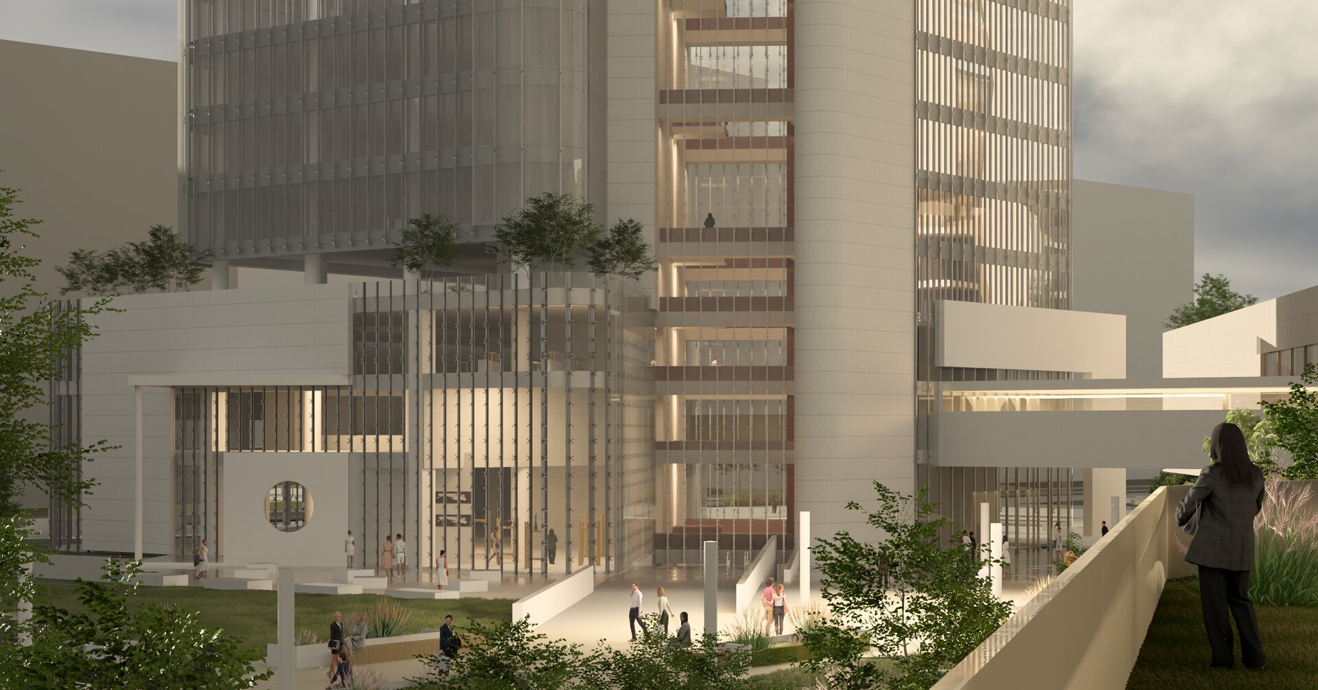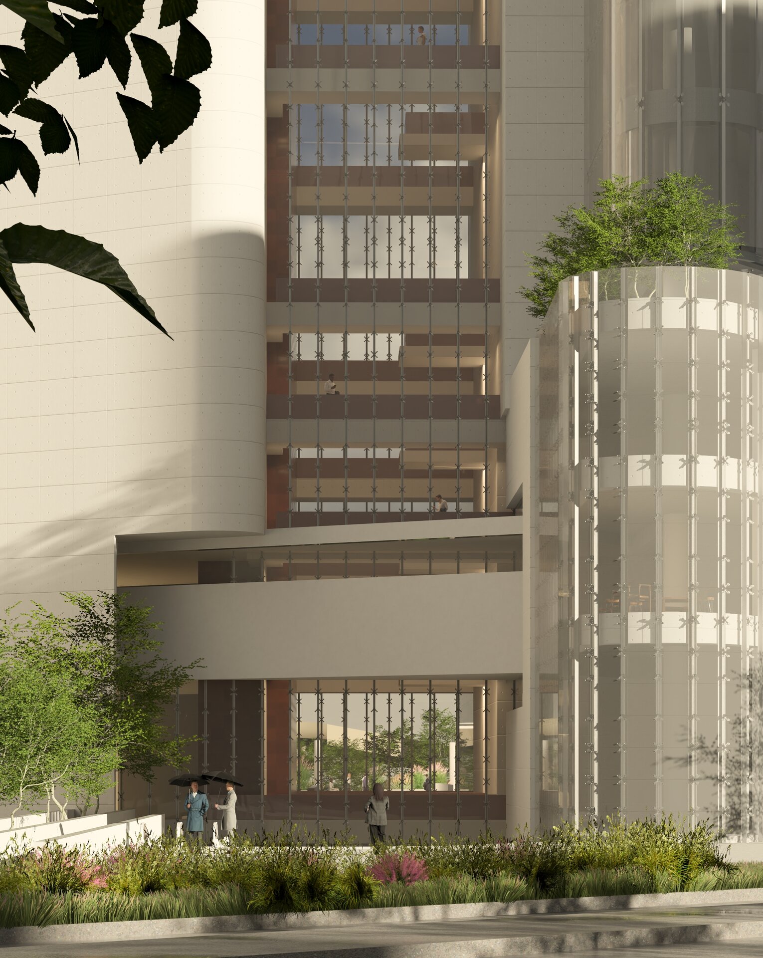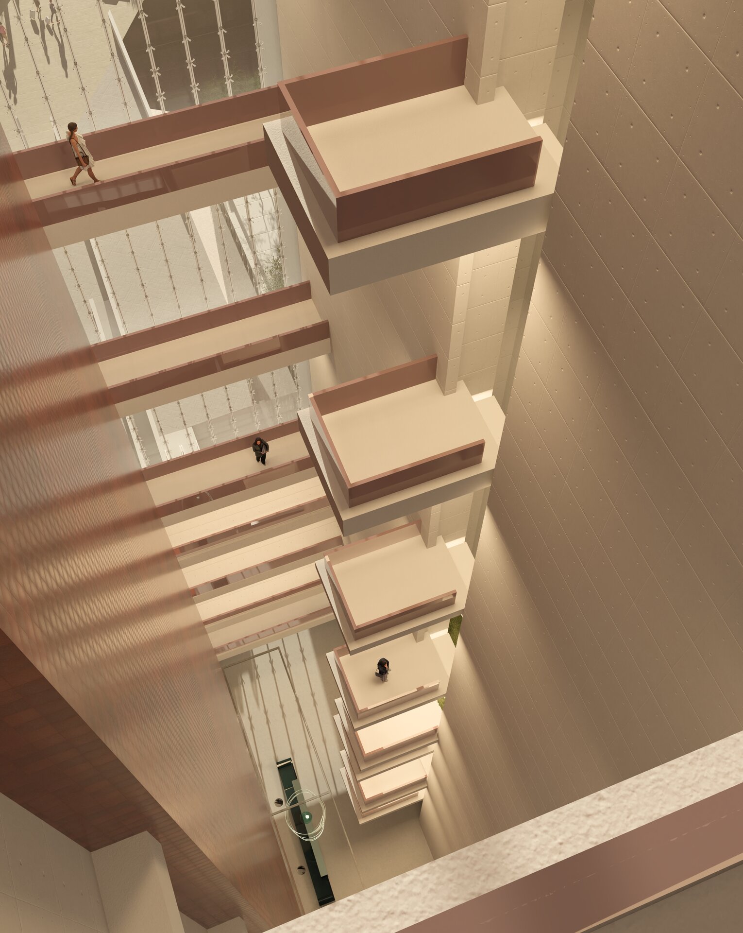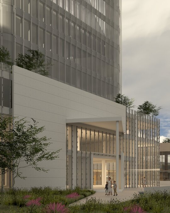 Accesul principal al clădirii se realizează de la nivelul -1, poziționat în spațiul de tranziție dintre cele două turnuri, de unde este primit fluxul cel mai consistent de utilizatori, întărit de prezența metroului. Acesta este accentuat prin realizarea unei piețe scufundate, ce acuză verticalitatea spațiului median descris anterior, oferind o perspectivă ascendentă dinamică asupra pasarelelor.