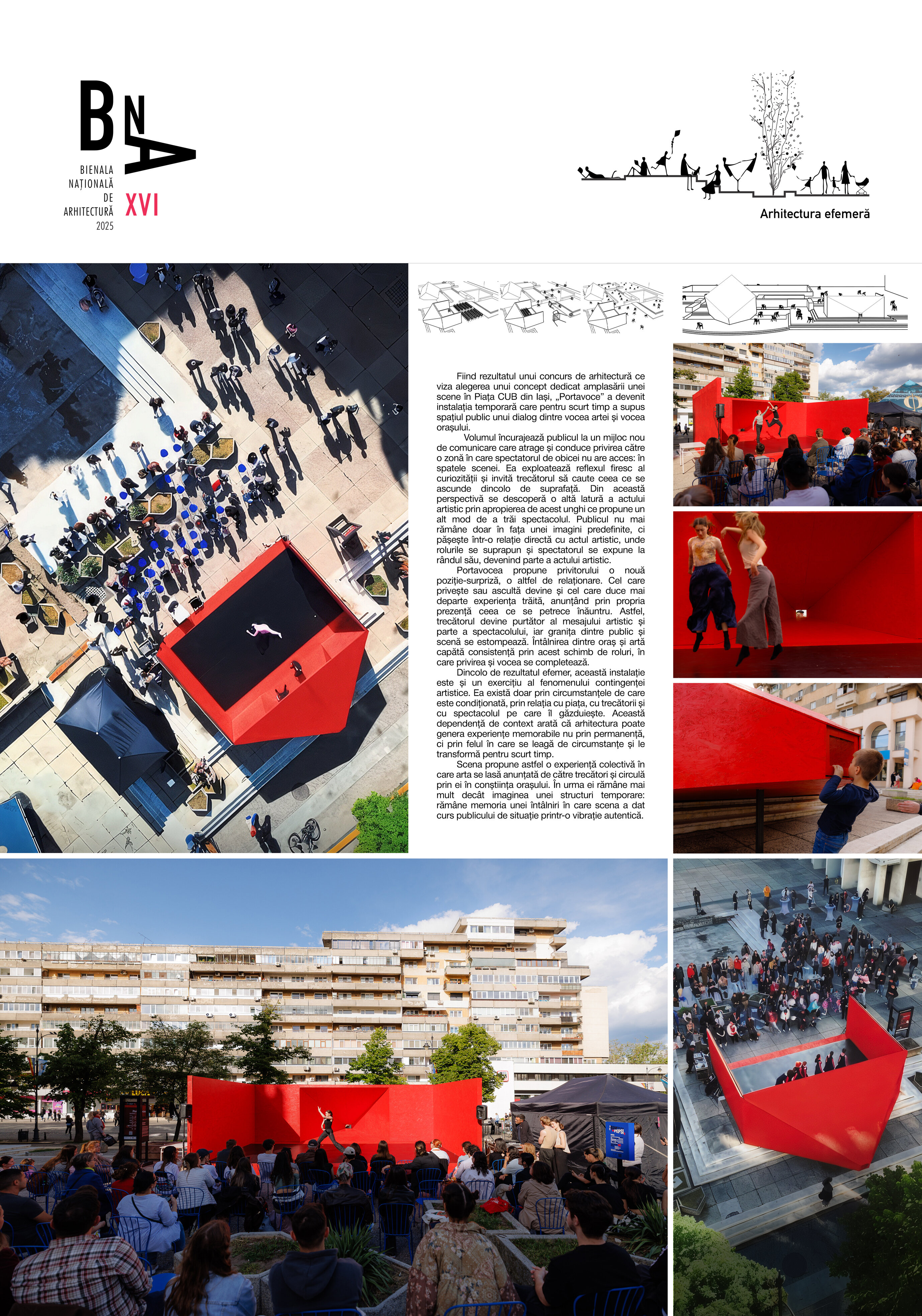 Fiind rezultatul unui concurs de arhitectură ce viza alegerea unui concept dedicat amplasării unei scene în Piața CUB din Iași, „Portavoce” a devenit instalația temporară care pentru scurt timp a supus spațiul public unui dialog dintre vocea artei și vocea orașului.