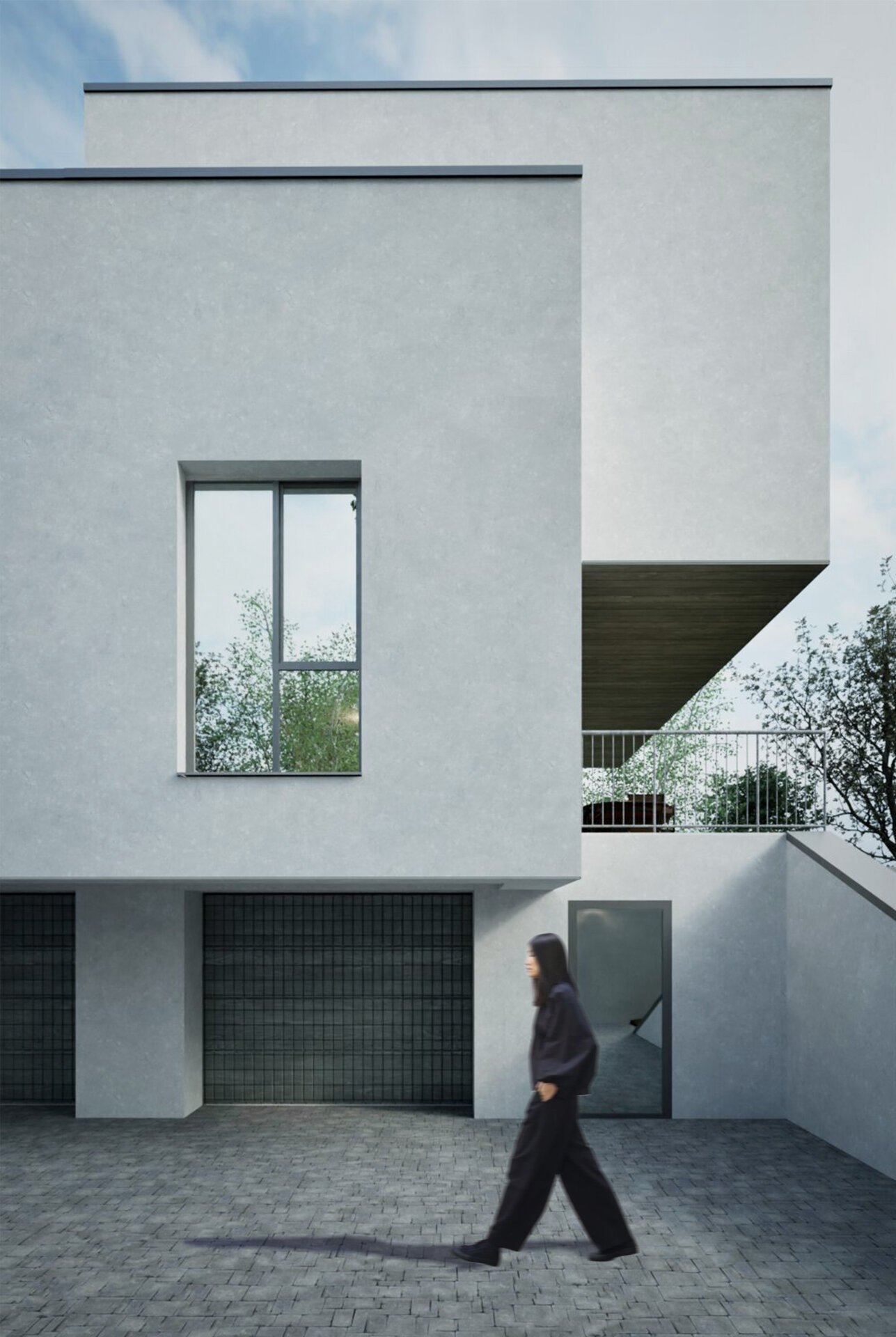 Volumetria este definită de jocul dintre retrageri și extensii, care adaugă dinamism și expresivitate. Trei console majore – peste accesul pietonal, peste garaj și peste terasa livingului – marchează deschiderea casei către exterior și dau volumului o expresie sculpturală. Pe latura opusă, dormitorul matrimonial este completat de o logie proprie, gândită ca un spațiu exterior intim și protejat, care adaugă profunzime relației dintre interior și grădină.