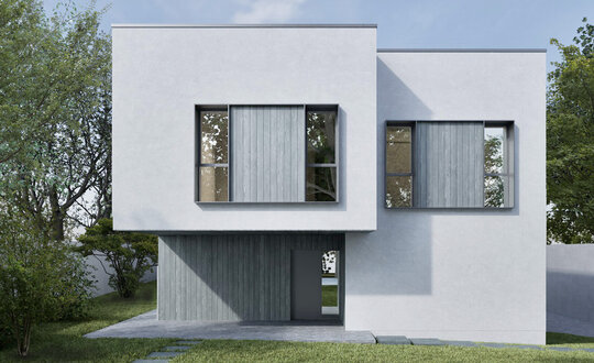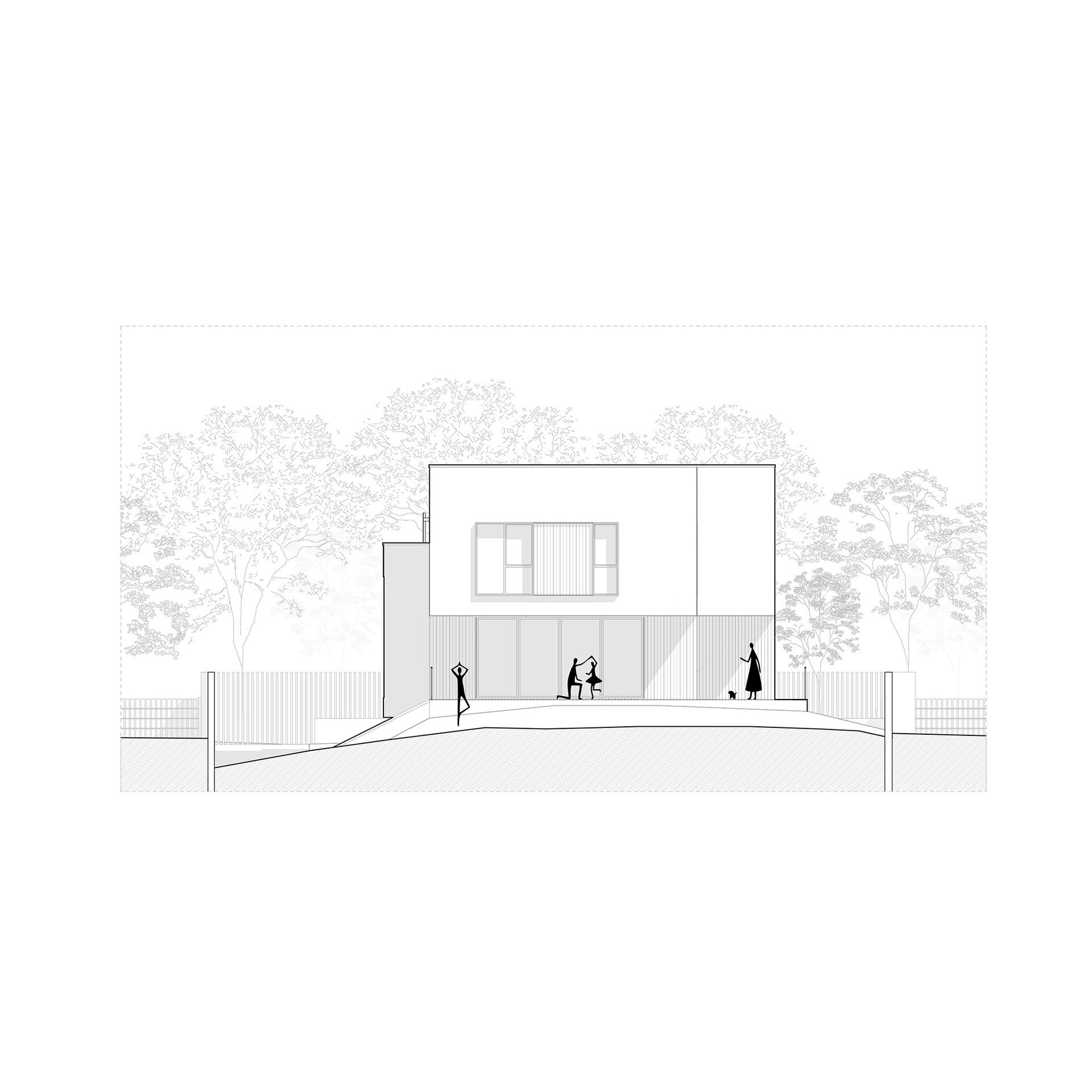 Arhitectura casei este marcată de claritate volumetrică și de contrastul dintre plin și vitrat. Două volume simple, articulate prin console și retrageri, sunt finisate într-o tencuială deschisă și accente de lemn, compunând o imagine contemporană, sobră și caldă în același timp.