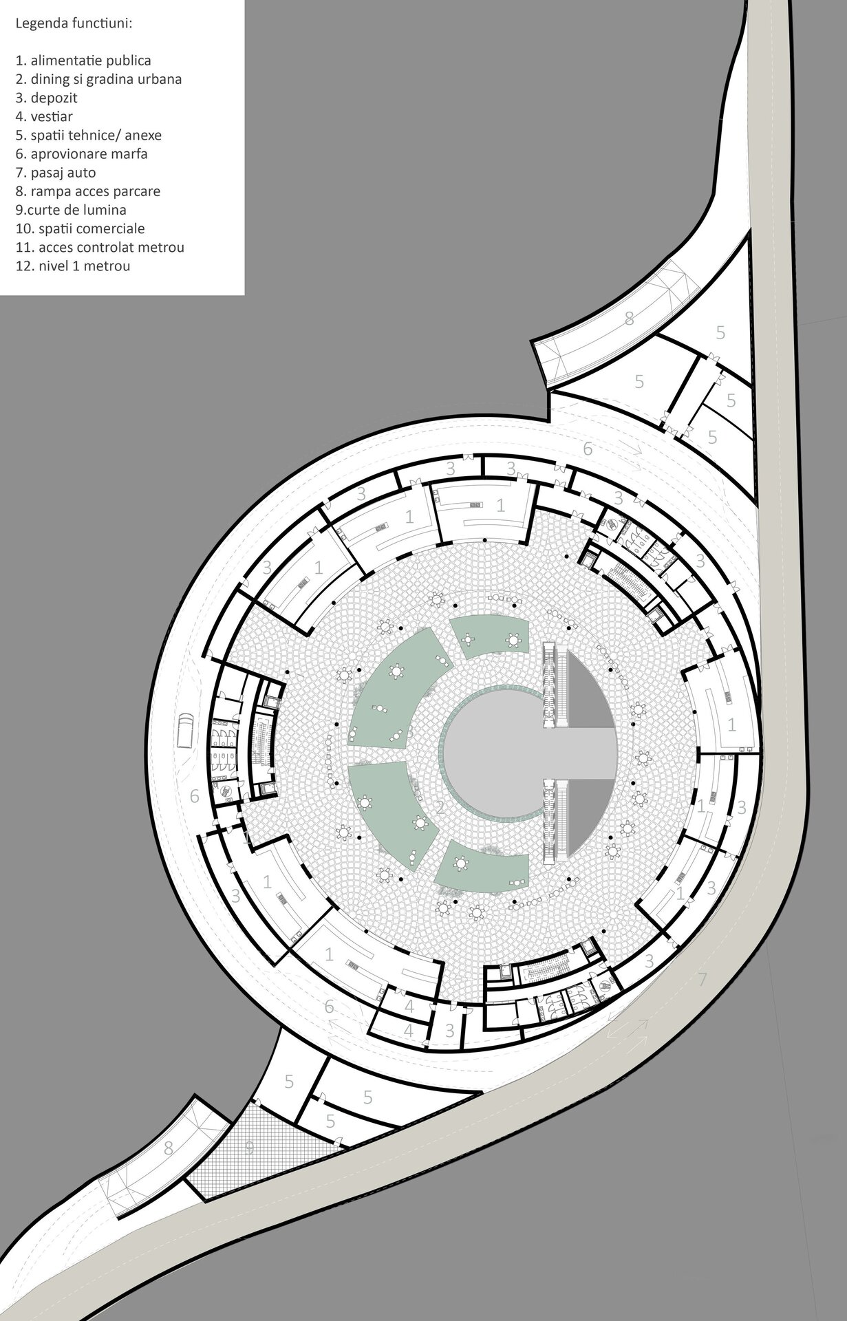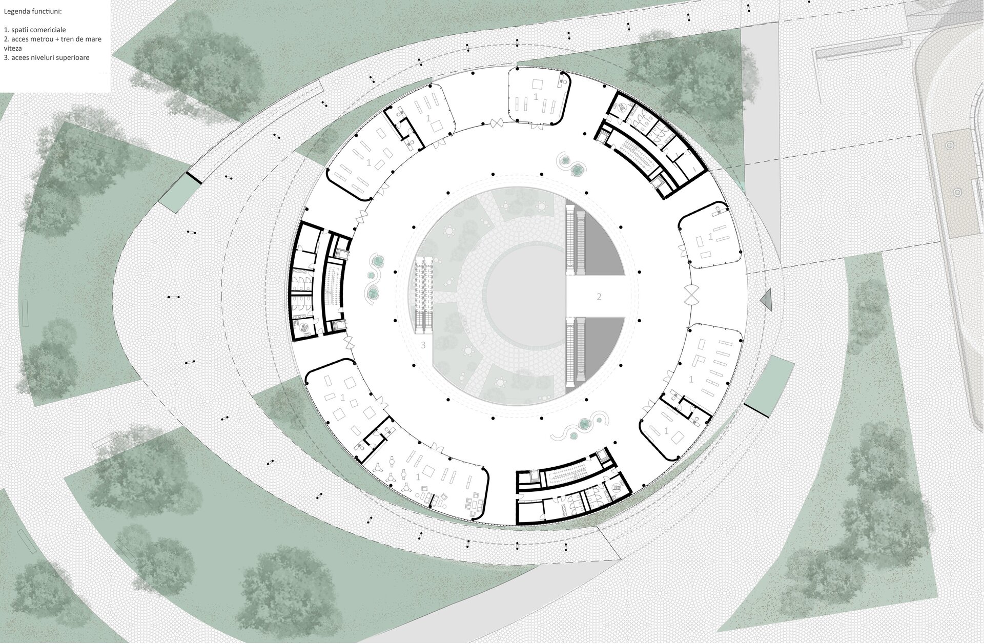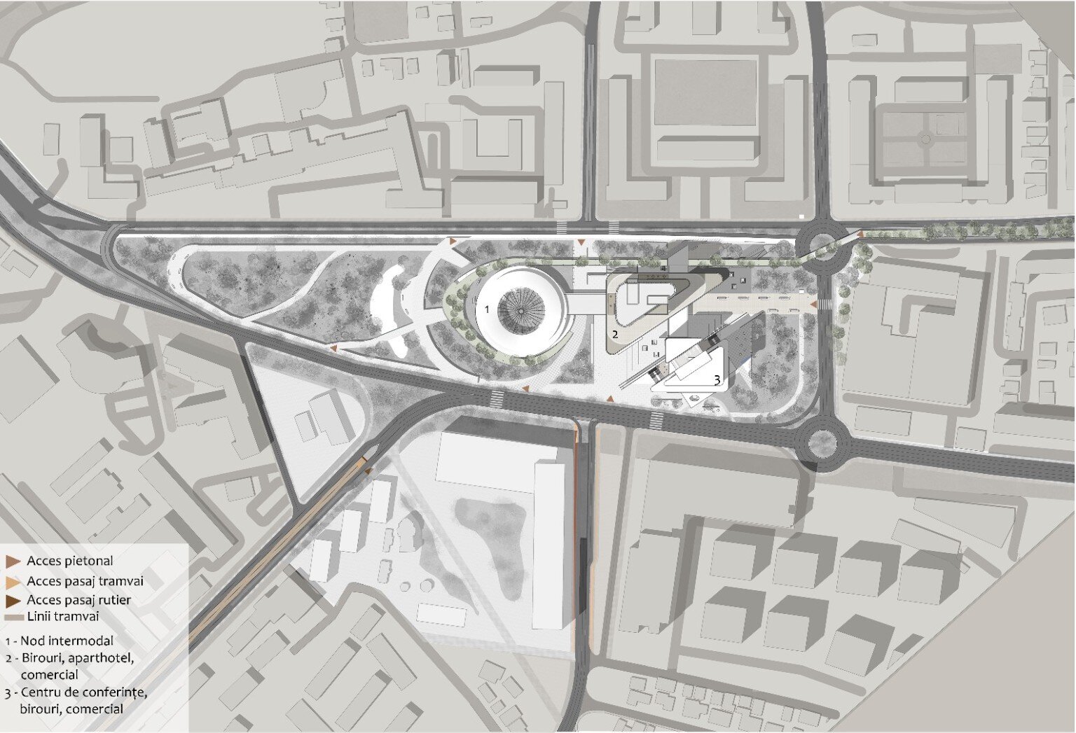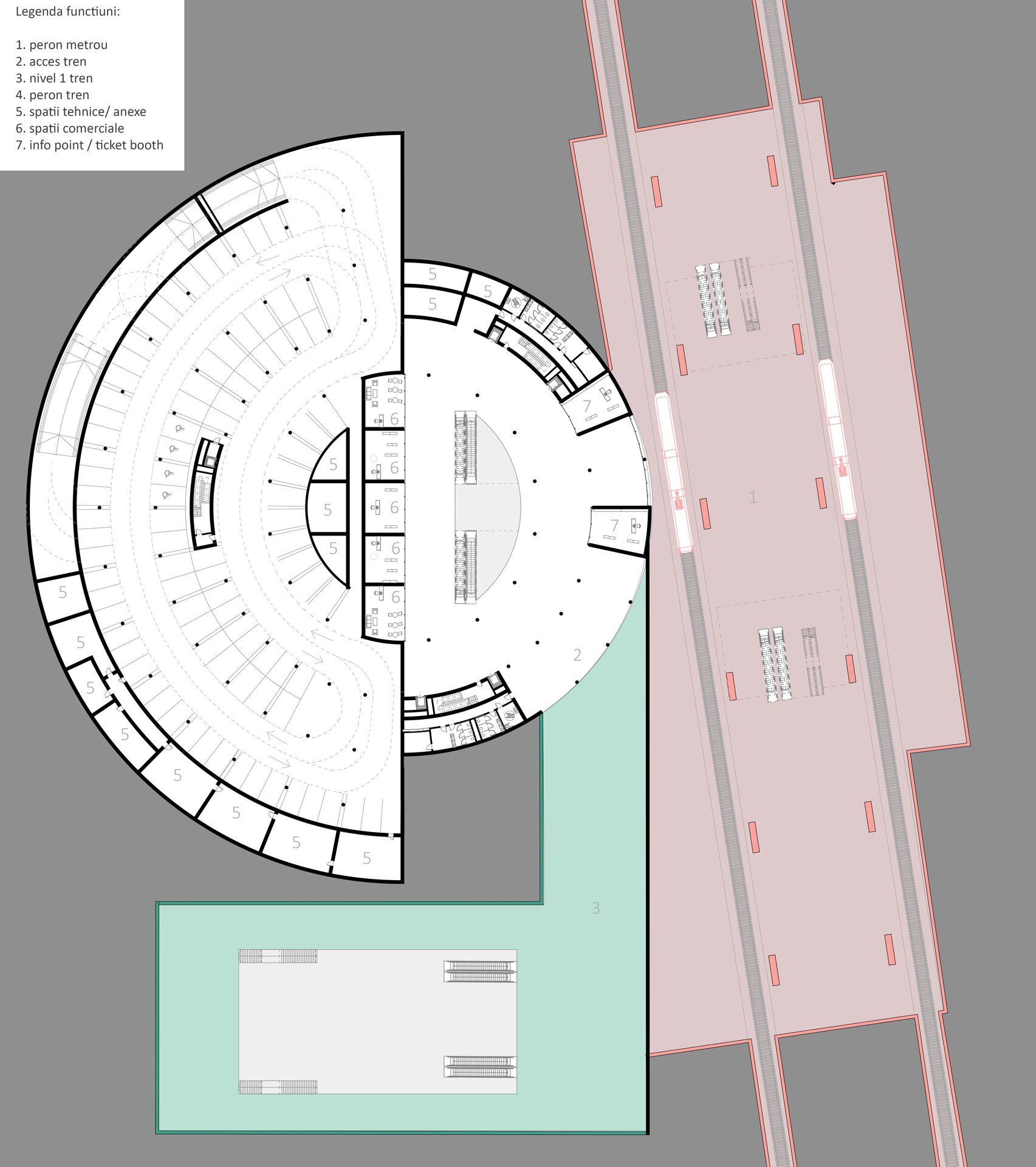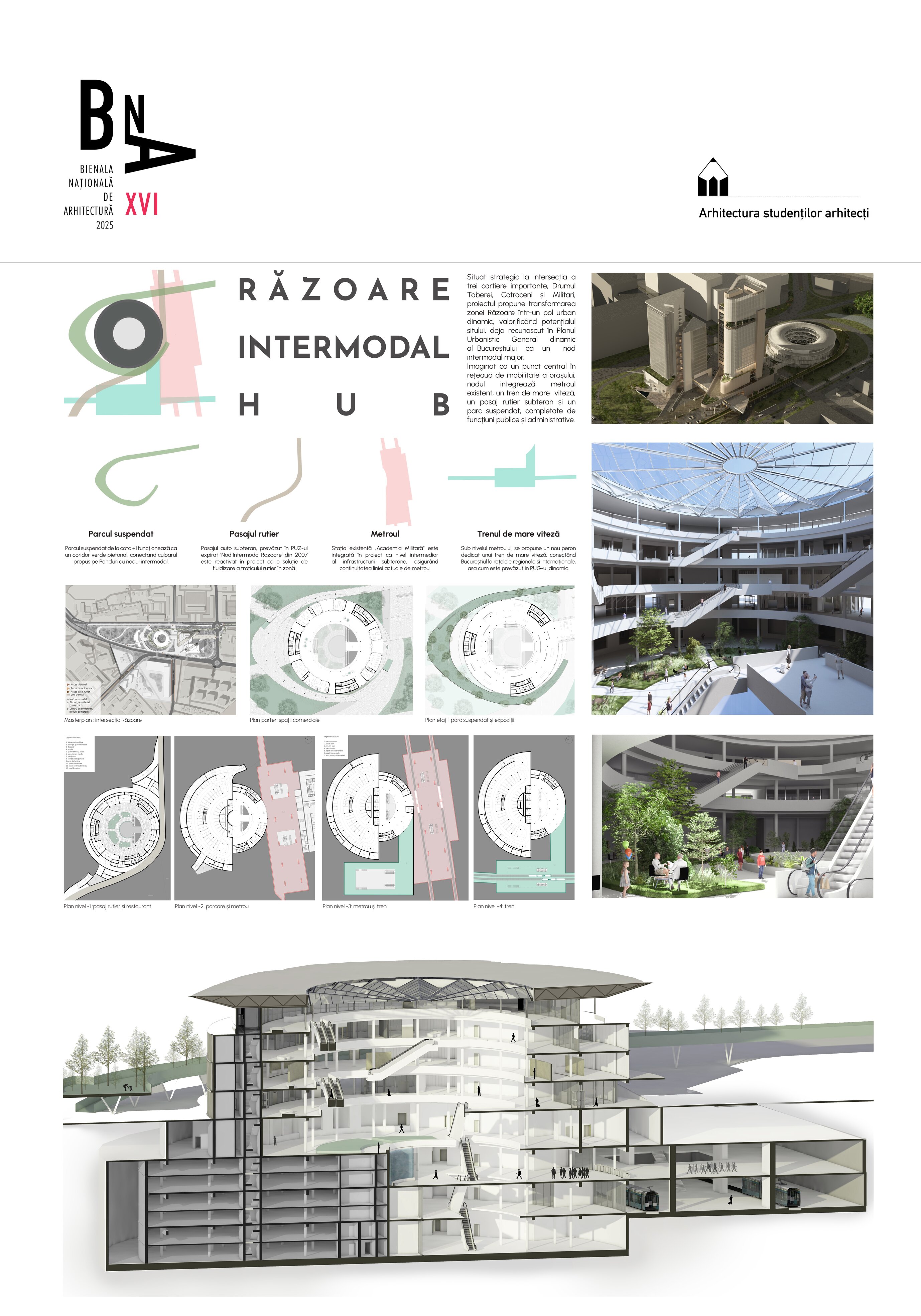 Imaginat ca un punct central în rețeaua de mobilitate a orașului, nodul integrează metroul existent, un tren de mare viteză, un pasaj rutier subteran și un parc suspendat, completate de funcțiuni publice și administrative.