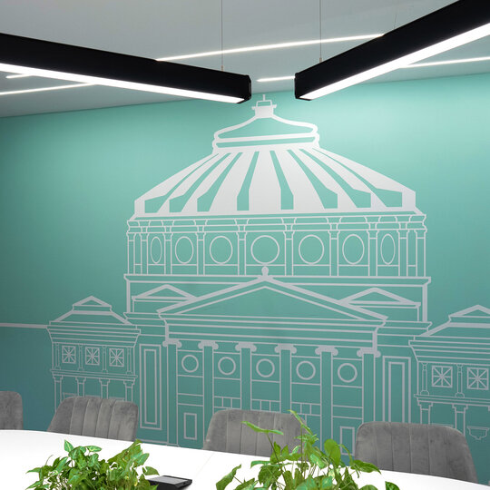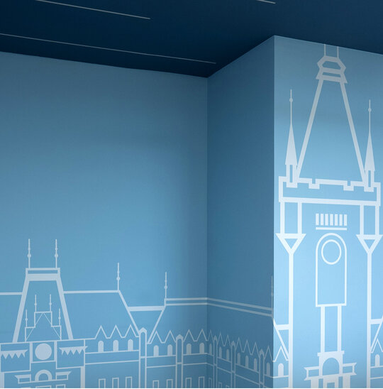 Abstractizarea siluetei devine aici tehnică fundamentală. În locul reprezentărilor realiste, se propune o interpretare filtrată, geometrică, capabilă să evoce locul fără a-l copia. Astfel, fiecare spațiu mic dobândește o amplitudine simbolică, iar arhitectura devine pretext și limbaj vizual. Sala „Palace of Culture” este dominată de un albastru deschis, nuanță ce reflectă lumina artificială și îmblânzește austeritatea spațiului. Liniile drepte, marcate pe pereți, fac aluzie la ritmul solemn al fațadei palatului ieșean. În contrapunct, sala „Romanian Atheneum” este învăluită într-un verde pal, luminos, inspirat de grădinile care îmbrățișează clădirea bucureșteană, aducând calm și prospețime.