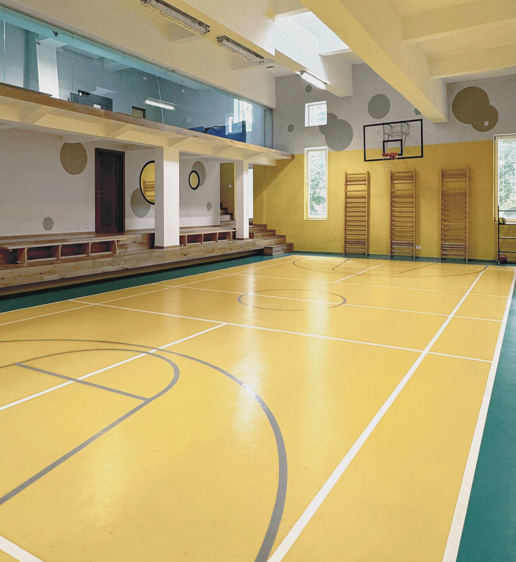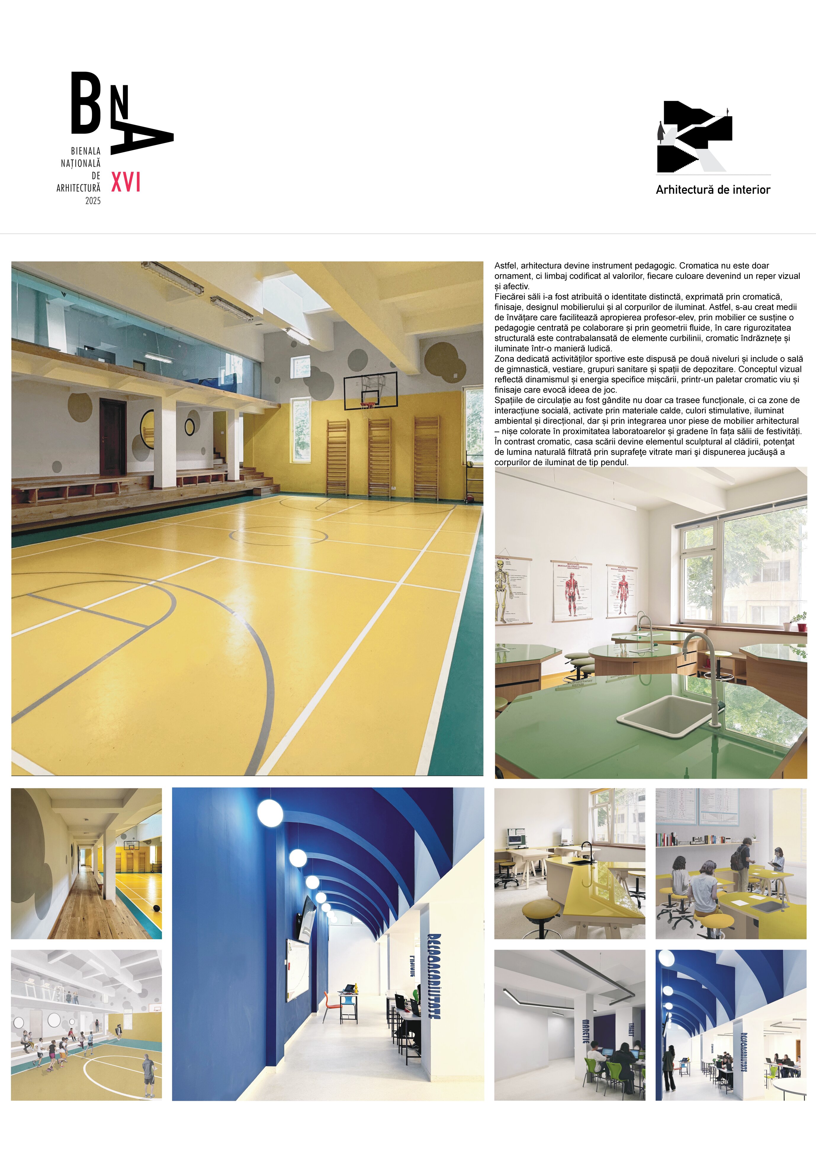 Fiecărei săli i-a fost atribuită o identitate distinctă, exprimată prin cromatică, finisaje, designul mobilierului și al corpurilor de iluminat. Astfel, s-au creat medii de învățare care facilitează apropierea profesor-elev, prin mobilier ce susține o pedagogie centrată pe colaborare și prin geometrii fluide, în care rigurozitatea structurală este contrabalansată de elemente curbilinii, cromatic îndrăznețe și iluminate într-o manieră ludică. Zona dedicată activităților sportive este dispusă pe două niveluri și include o sală de gimnastică, vestiare, grupuri sanitare și spații de depozitare. Conceptul vizual reflectă dinamismul și energia specifice mișcării, printr-un paletar cromatic viu și finisaje care evocă ideea de joc. Spațiile de circulație au fost gândite nu doar ca trasee funcționale, ci ca zone de interacțiune socială, activate prin materiale calde, culori stimulative, iluminat ambiental și direcțional, dar și prin integrarea unor piese de mobilier arhitectural – nișe colorate în proximitatea laboratoarelor și gradene în fața sălii de festivități. În contrast cromatic, casa scării devine elementul sculptural al clădirii, potenţat de lumina naturală filtrată prin suprafeţe vitrate mari şi dispunerea jucăuşă a corpurilor de iluminat de tip pendul.