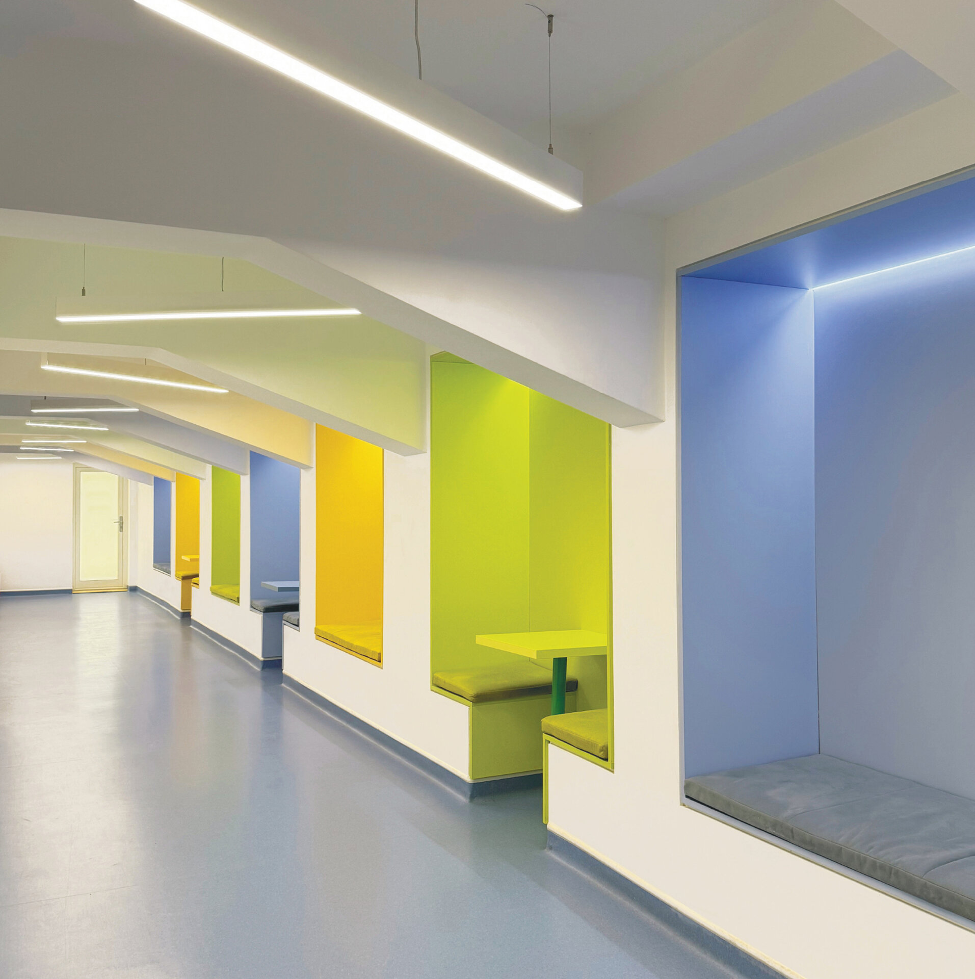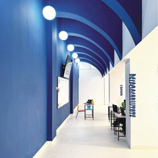 2. Utilizarea unui cod cromatic simbolic, în care fiecare nuanță corespunde unei forme de inteligență – albastru pentru cea academică, verde pentru cea spirituală și portocaliu pentru cea emoțională – contribuind astfel la definirea identitară a spațiilor.